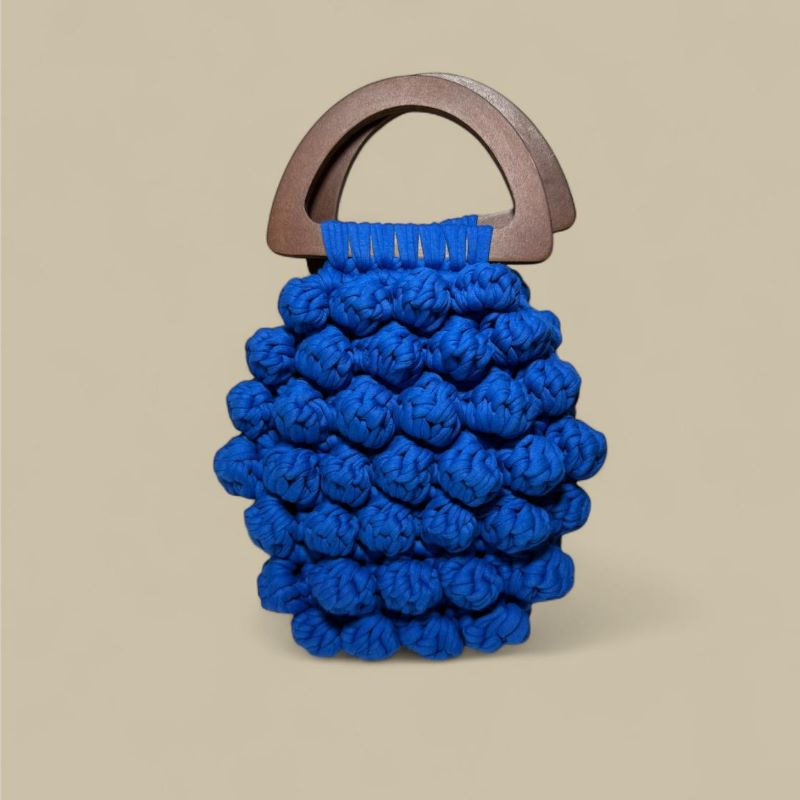 A small contemporary blue crochet bag made of t. shirt yarn.