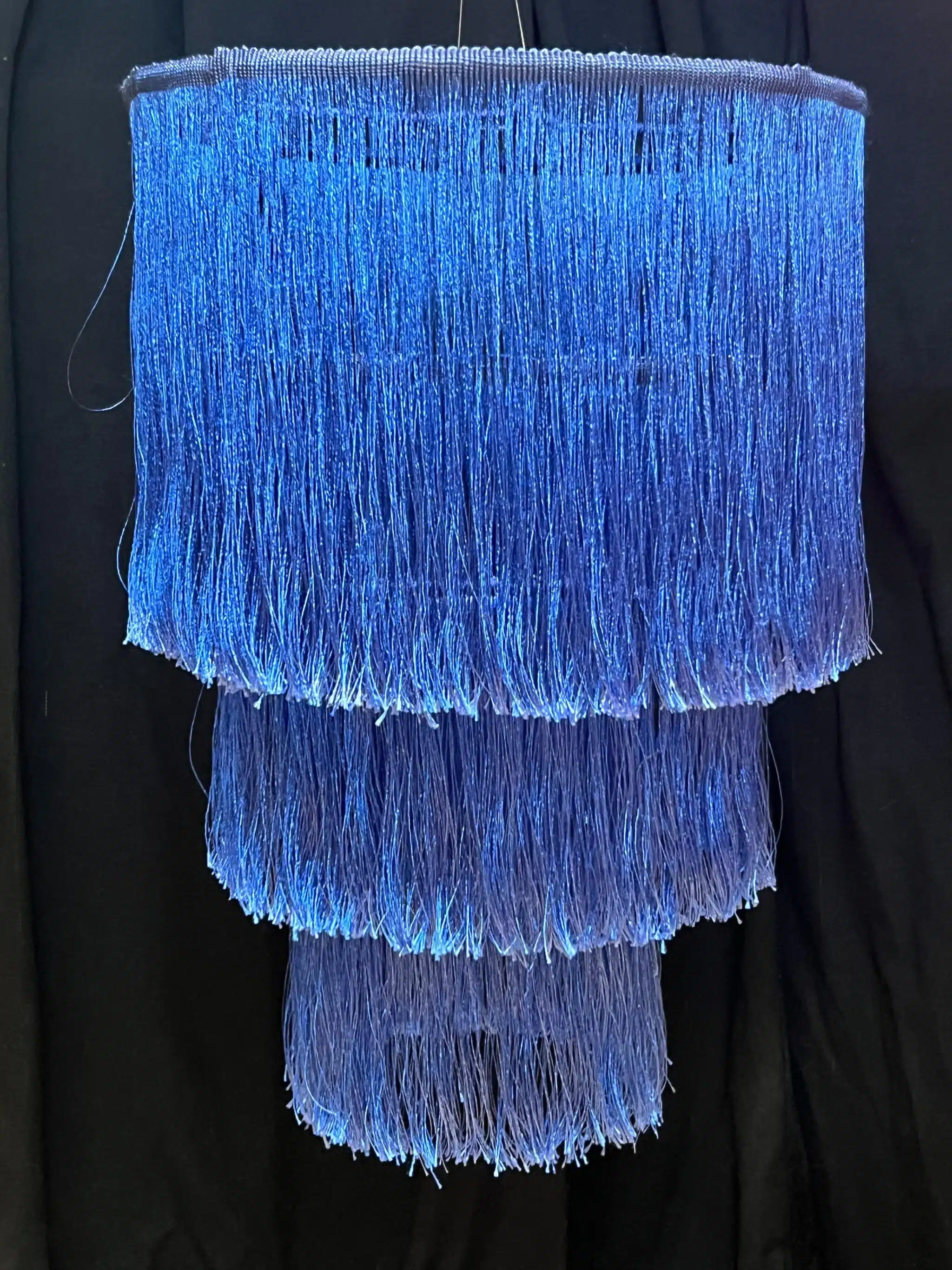 A layered hanging lampshade made of shimmering blue fringe threads. It creates a soft, stylish glow and adds a fun, elegant touch to any room.