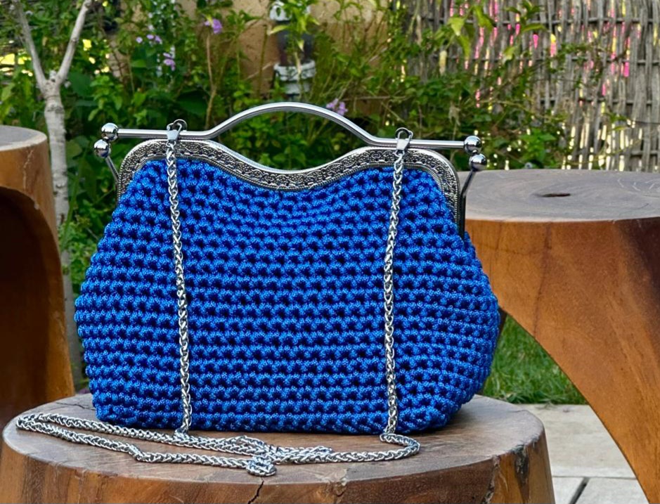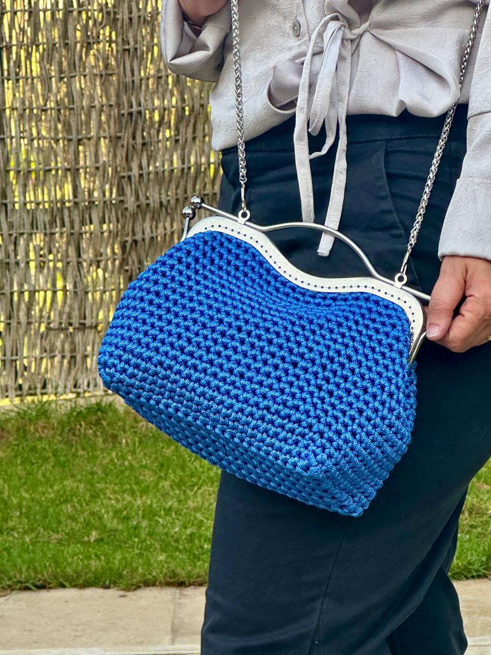 Blue crochet handbag with a silver vintage frame and a long silver chain