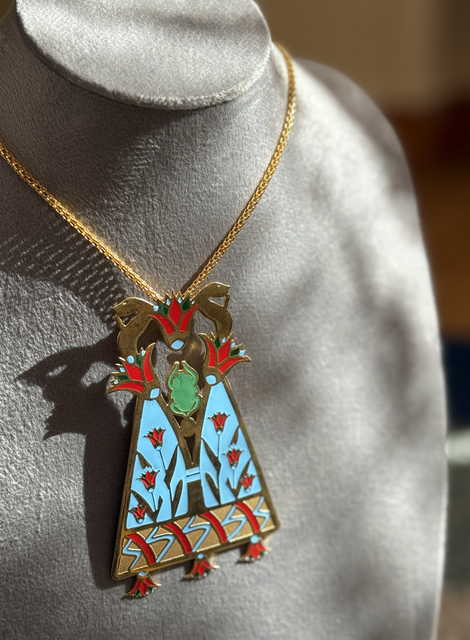This statement necklace features a gold-toned pendant adorned with vibrant blue, red, and green enamel, forming a stylized floral figure framed by geometric panels and delicate blossom motifs.