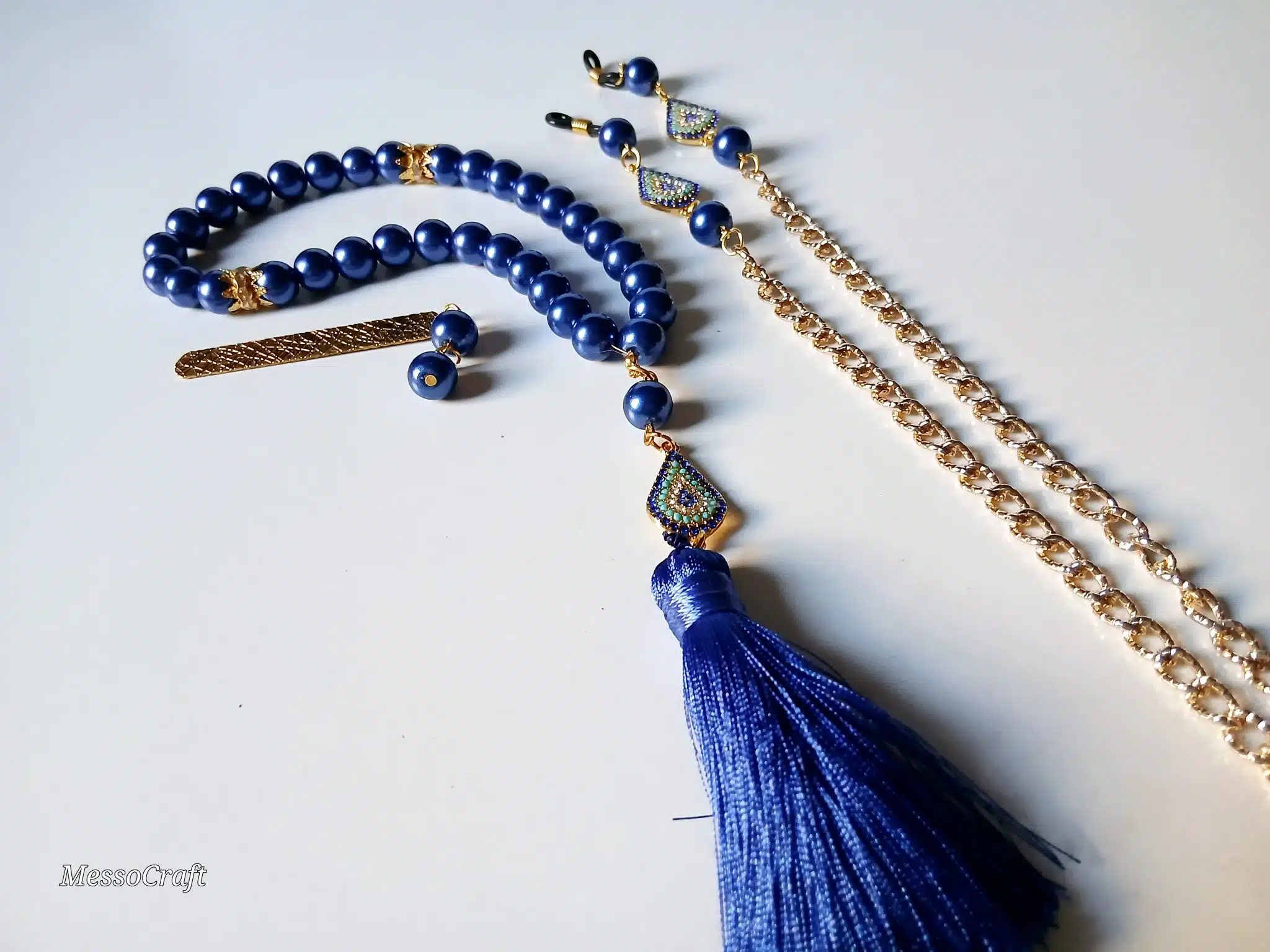 3 pcs set of 33 beads sepha, glasses chain and bookmark made of royal blue pearl stones, a unique pendant and blue silk tassel