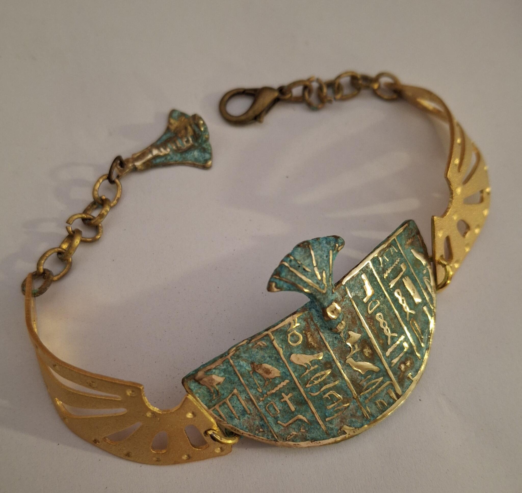 Be the first to review “Blue rust Heiroglyphic cuff with goldplated 18k wings”