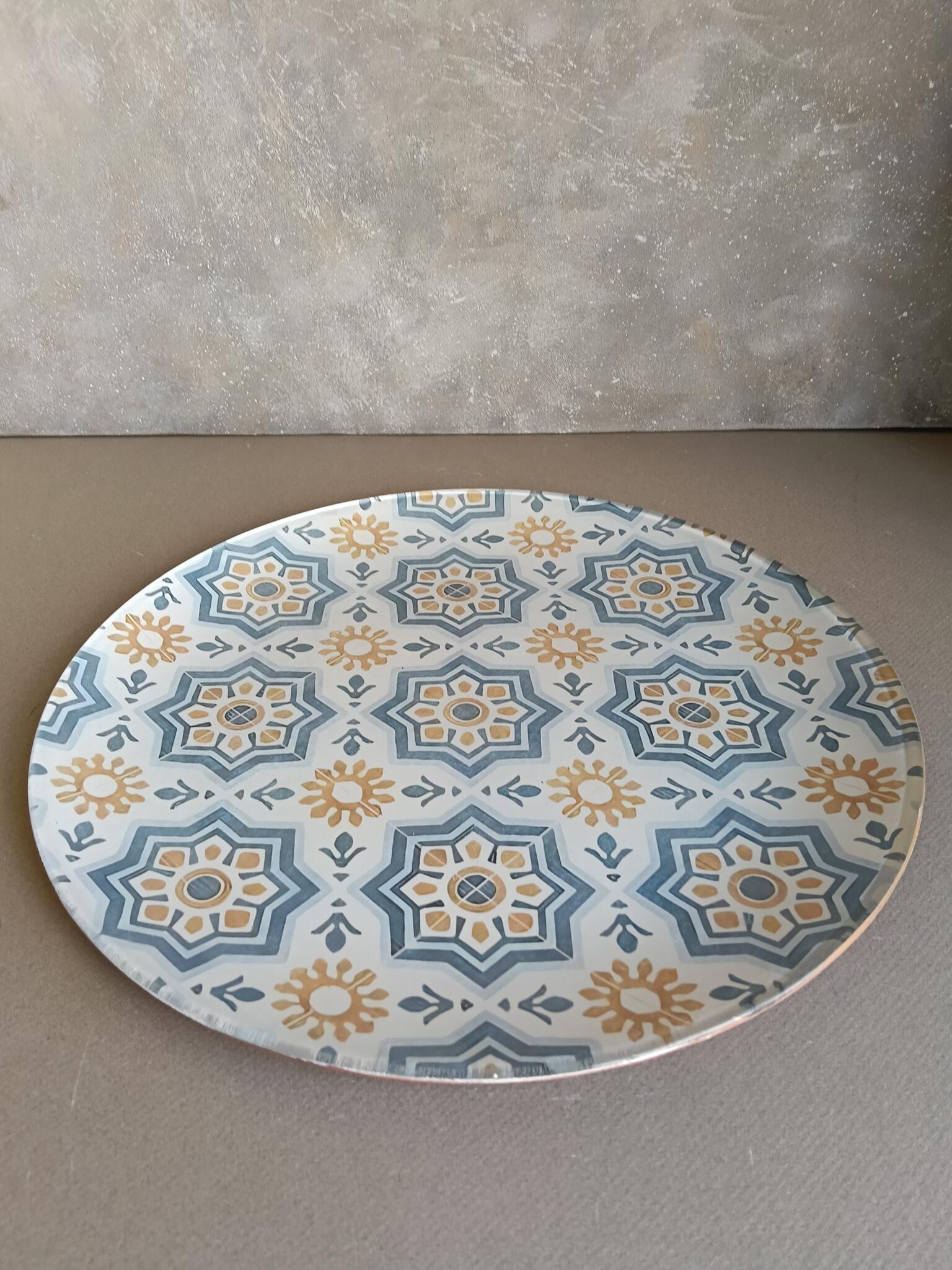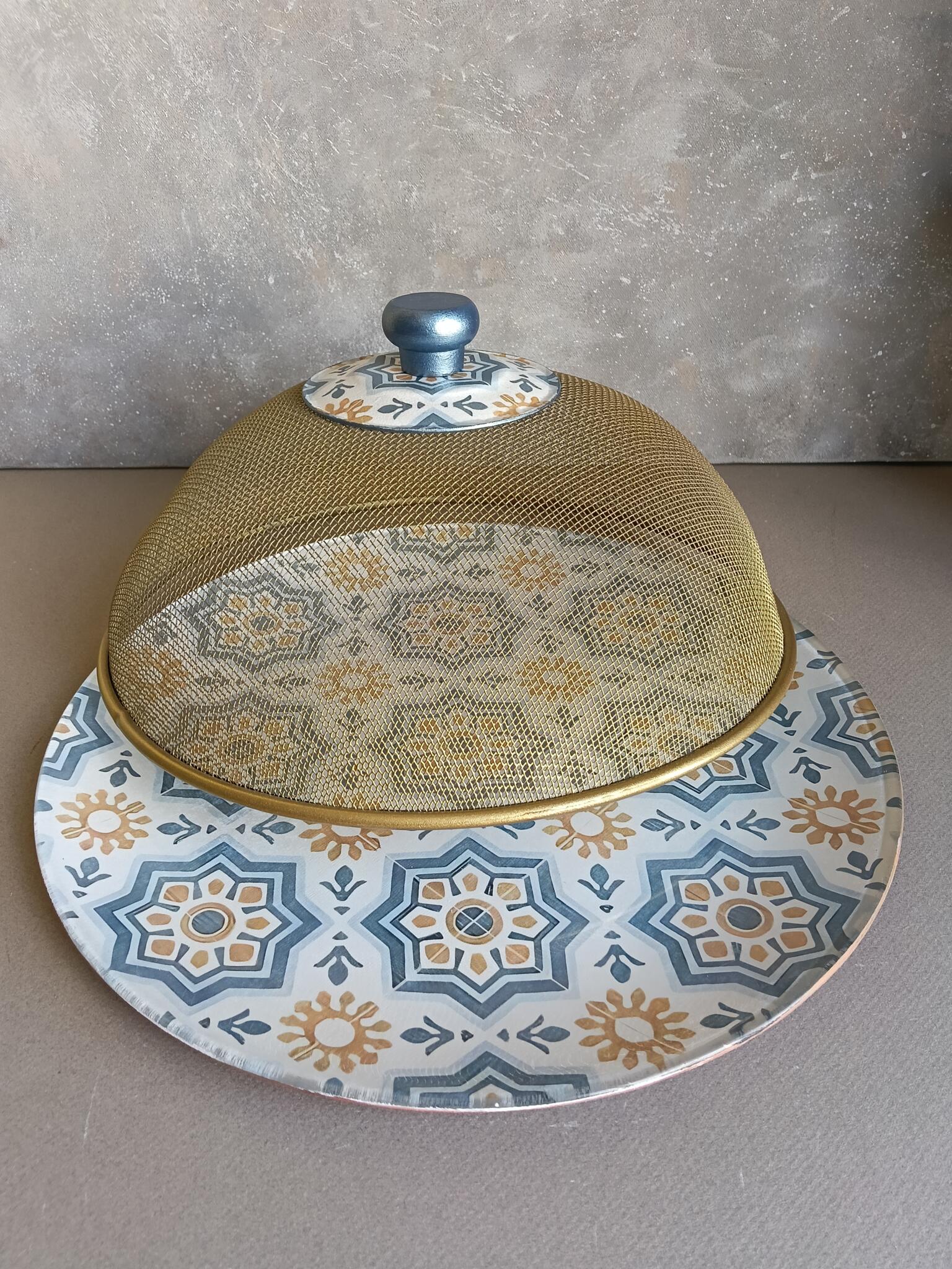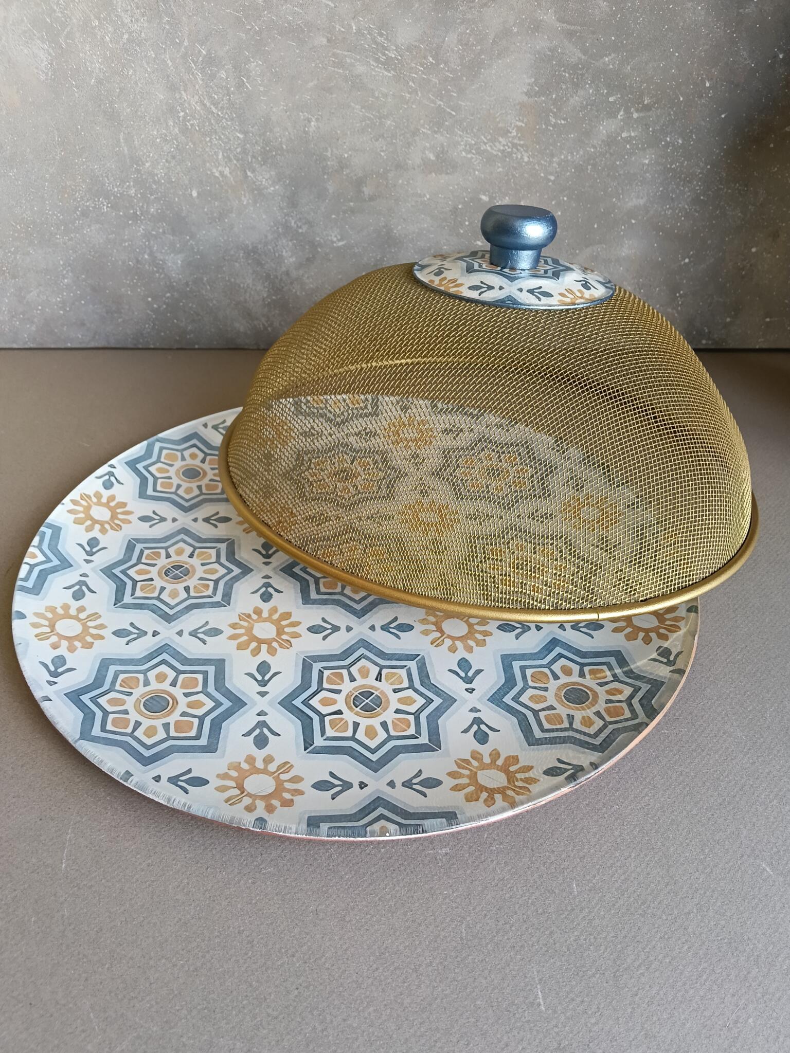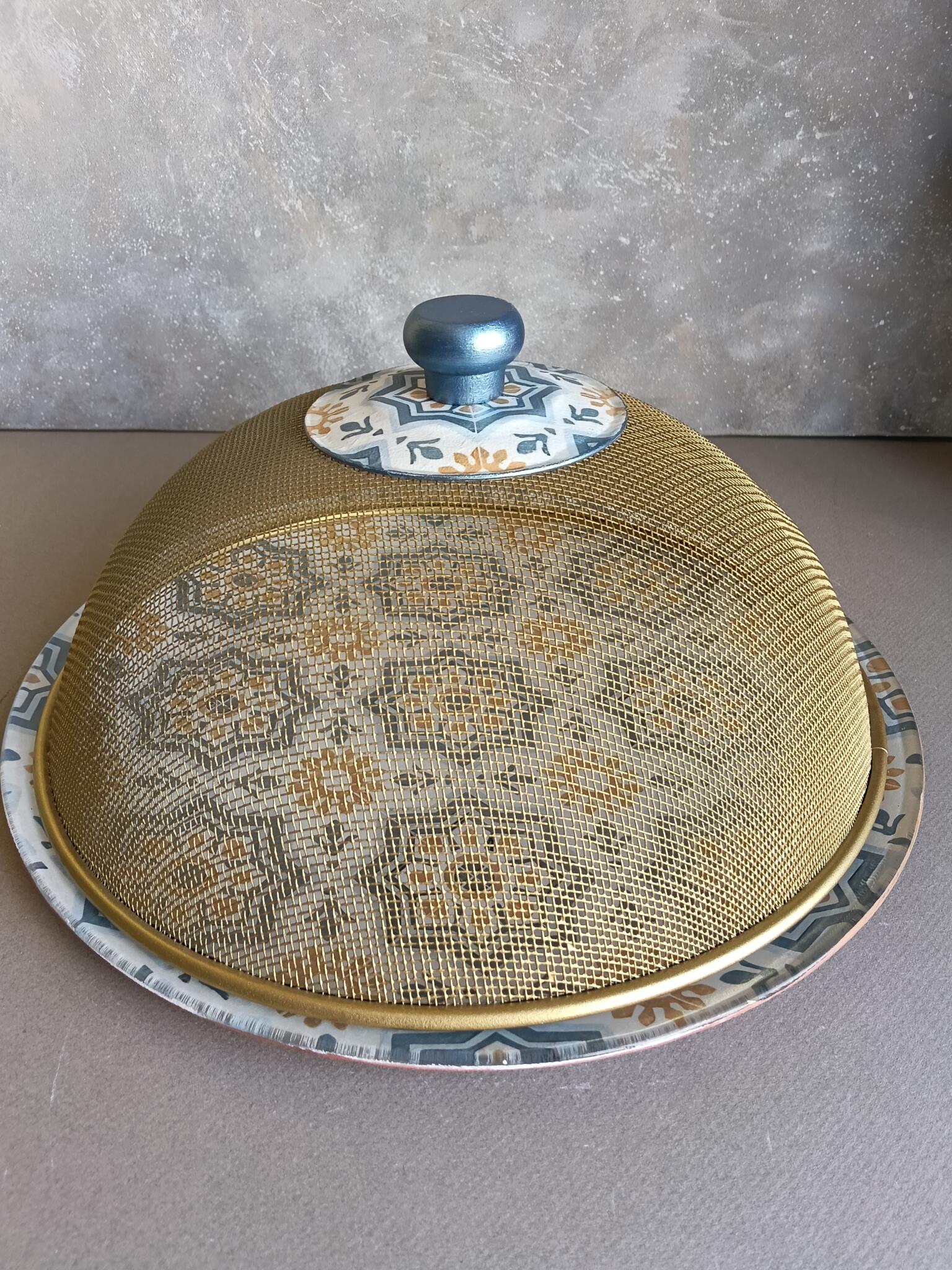 Round glass plate 32 cm decoupaged with the arabic pattern has a golden mesh cover with matching knob