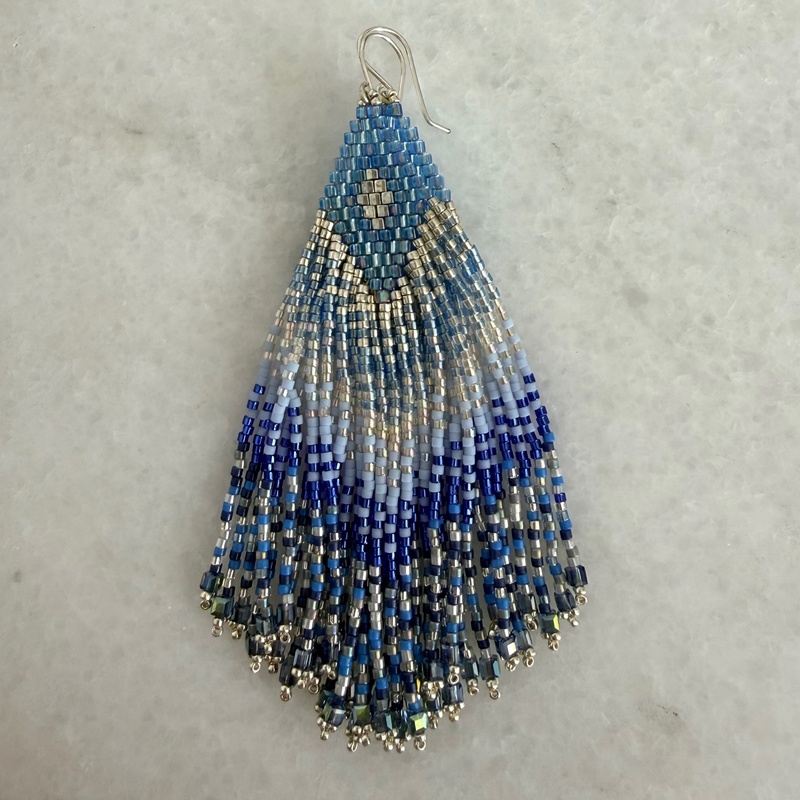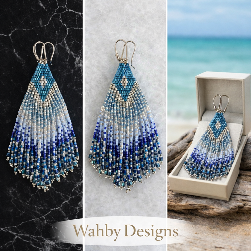These handcrafted fringe earrings by Wahby Designs feature a vibrant cascade of Japanese Miyuki Delica beads in rich coastal hues. Accented with a delicate metallic motif at the crown. Each bead is meticulously hand-woven over 6–8 hours, creating fluid movement and exceptional detail that reflects true artisanal craftsmanship. Finished with elegant gold-filled or silver plated hooks and subtle crystal accents, this one-of-a-kind piece brings effortless luxury and color to any look.