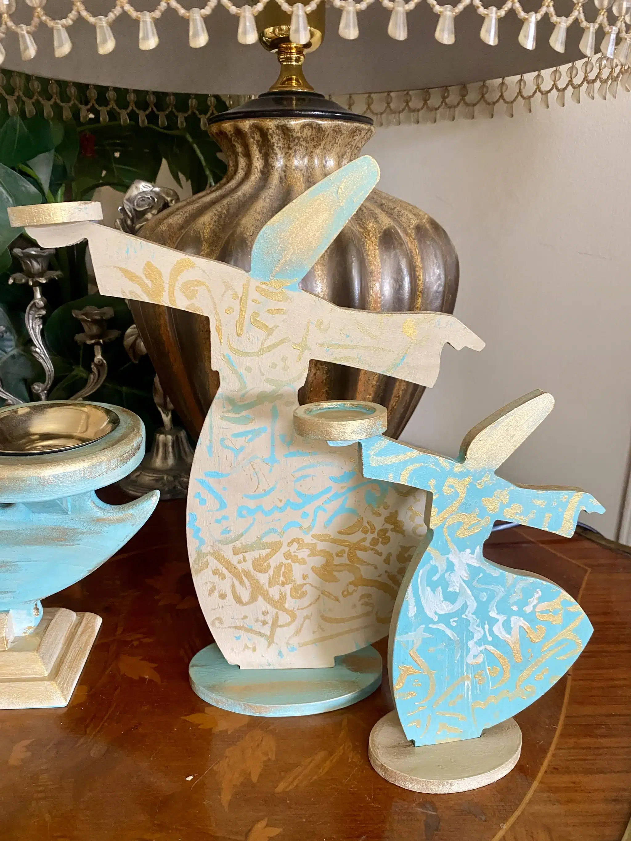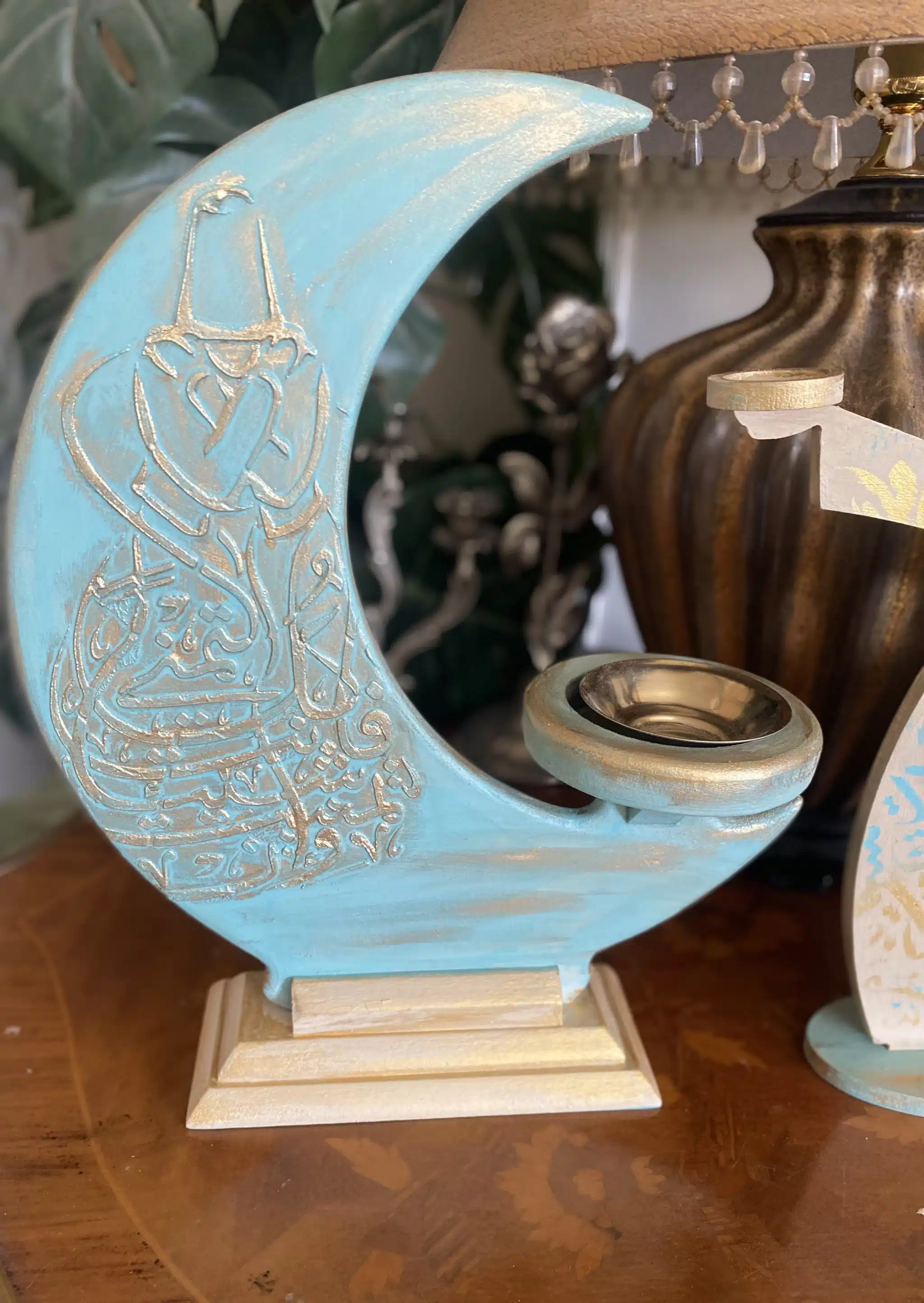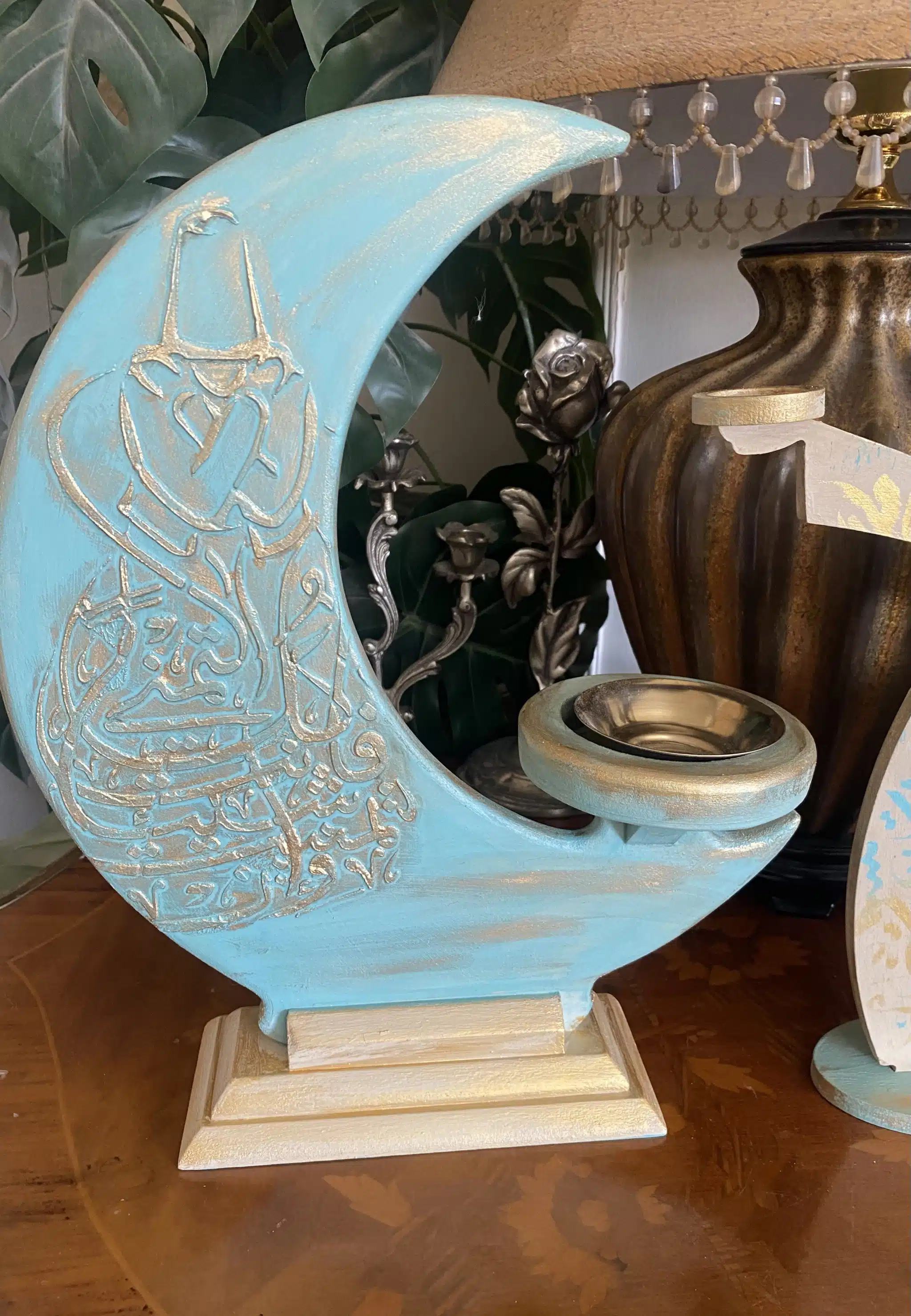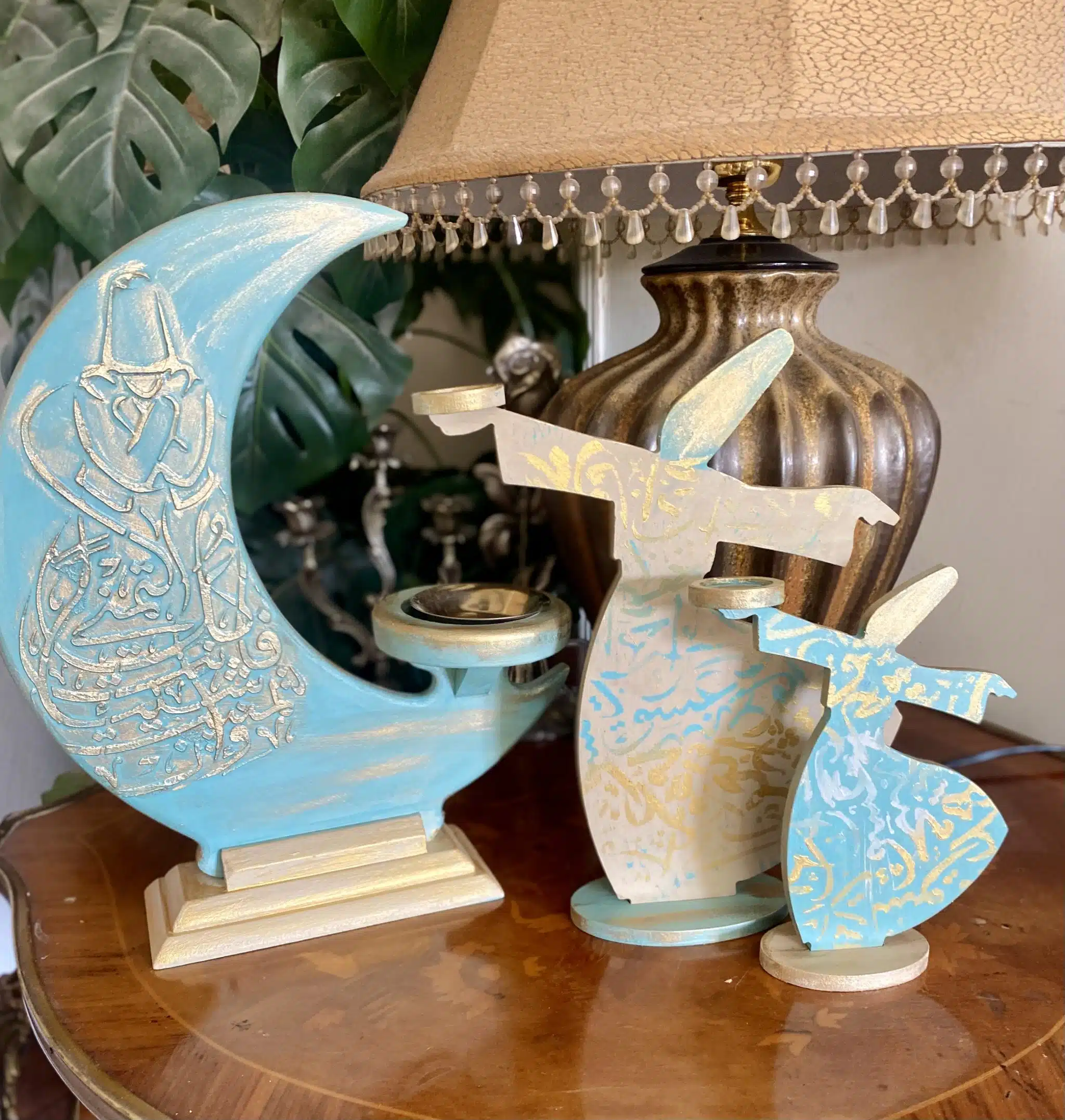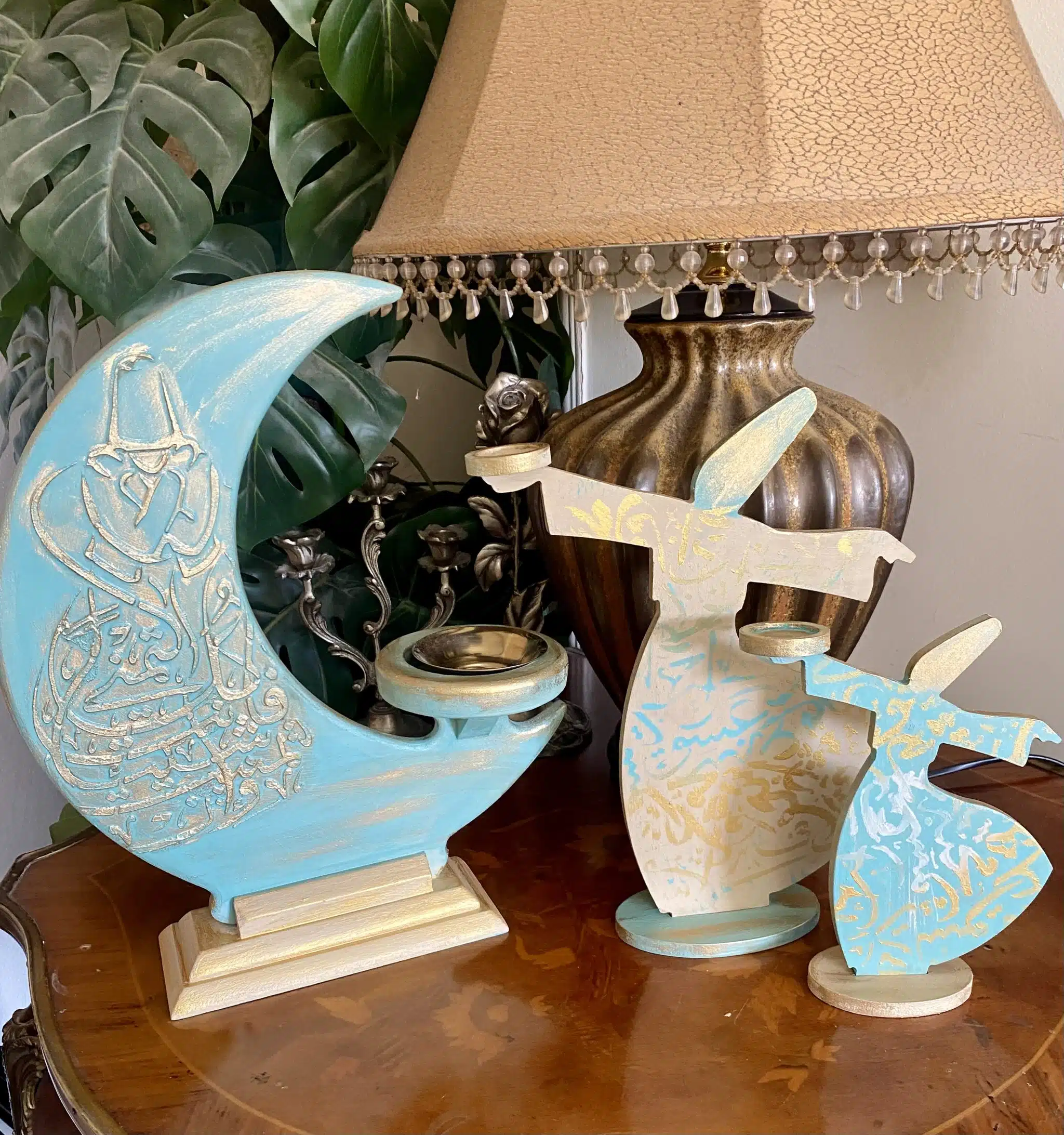 Wooden set of مبخرة and dervish candle holders