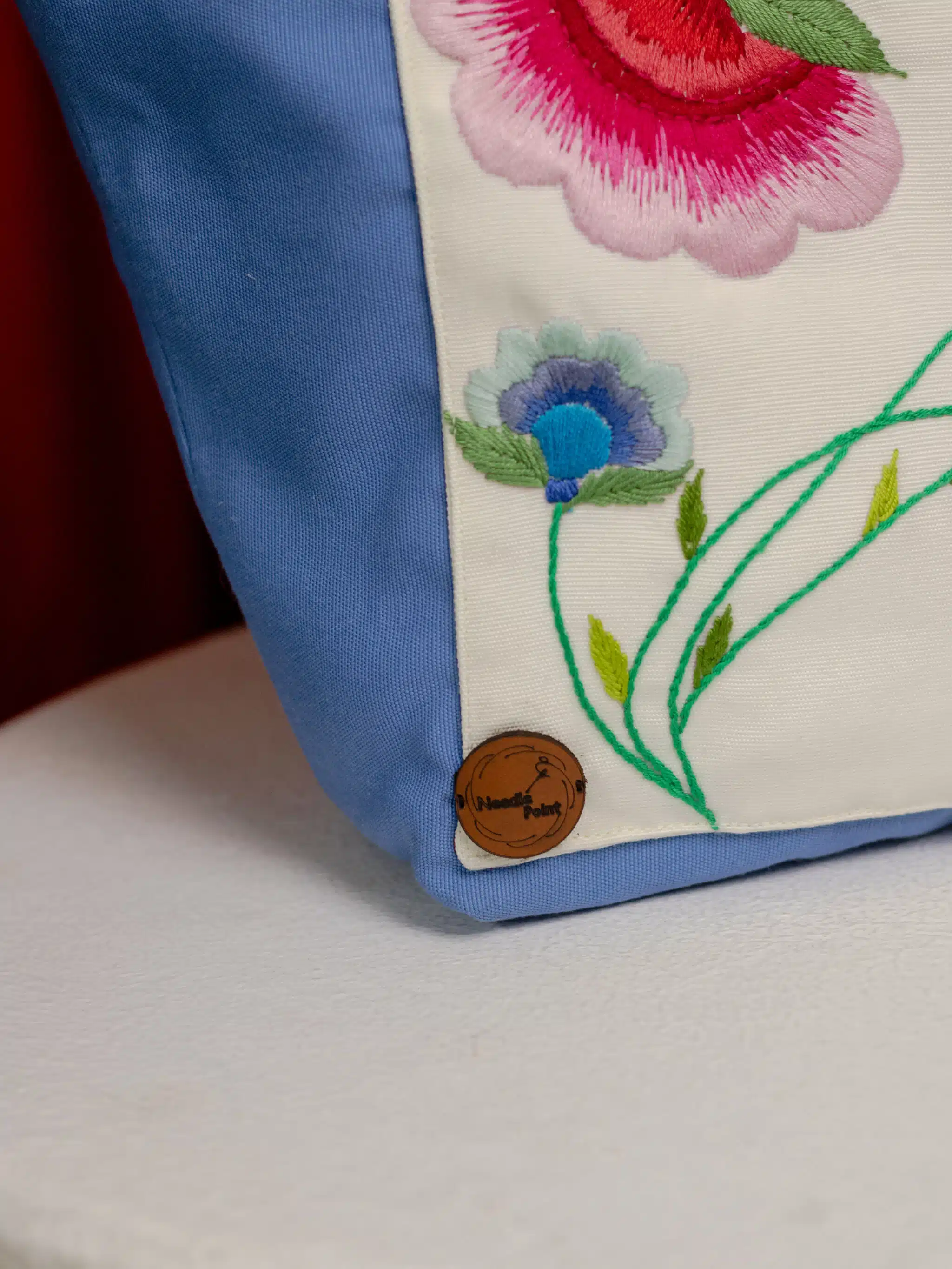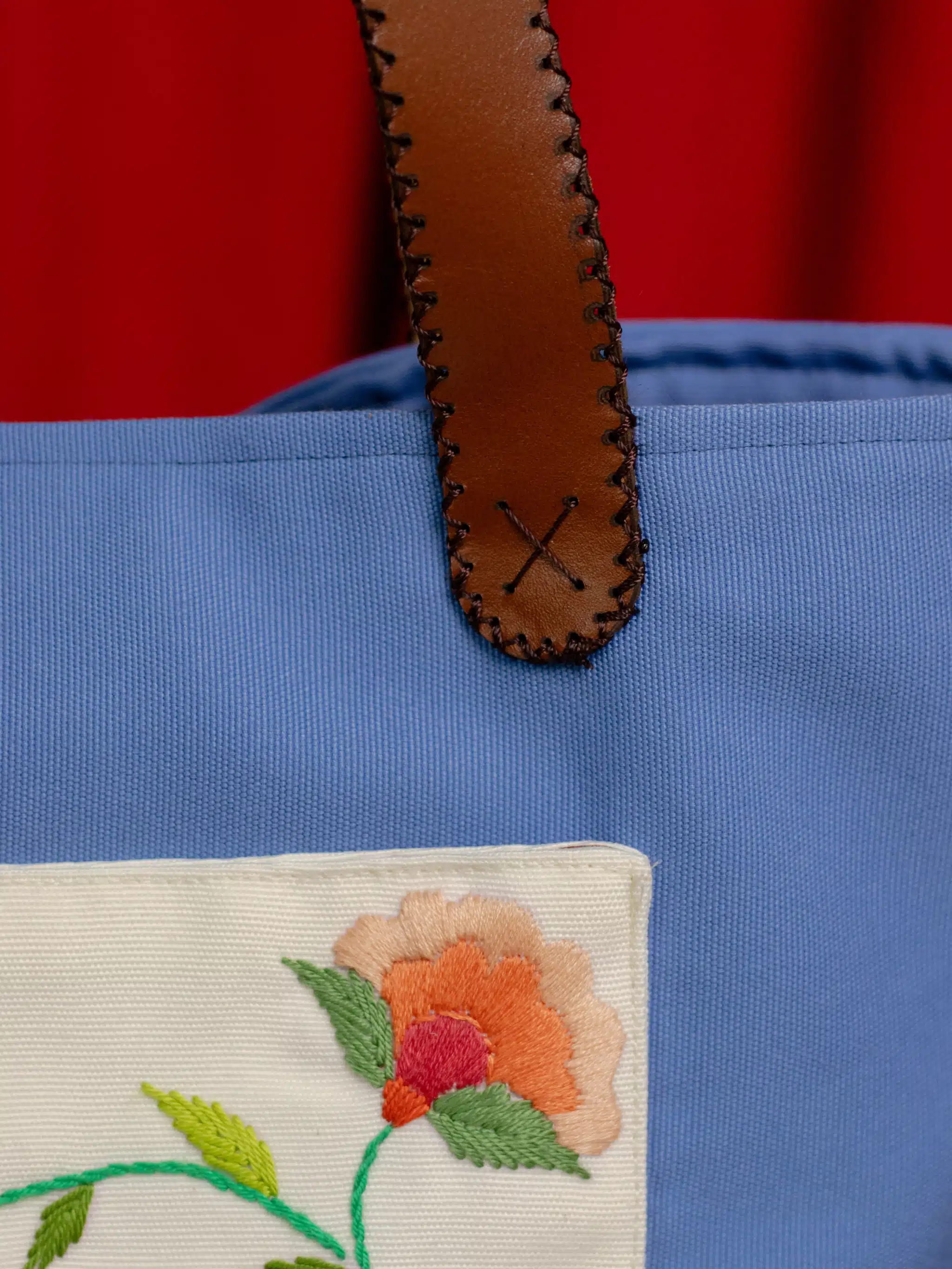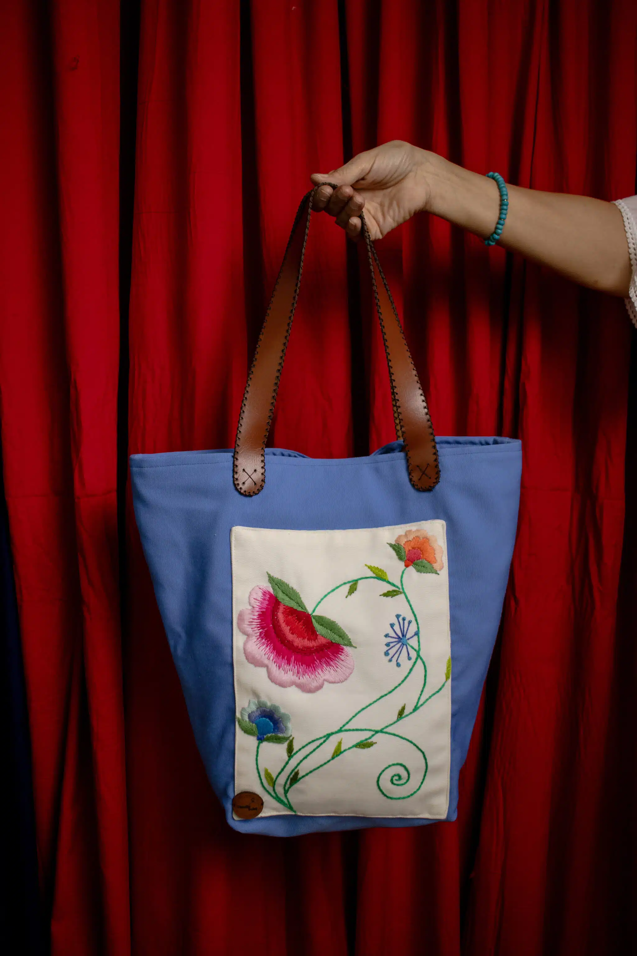 Inspired by the colors of the ocean and the joy of summer blooms, the Coastal Bloom Tote is crafted from treated blue linen with a beige floral-embroidered front pocket. Designed for sunny days and everyday use, it’s the perfect blend of beauty and functionality.