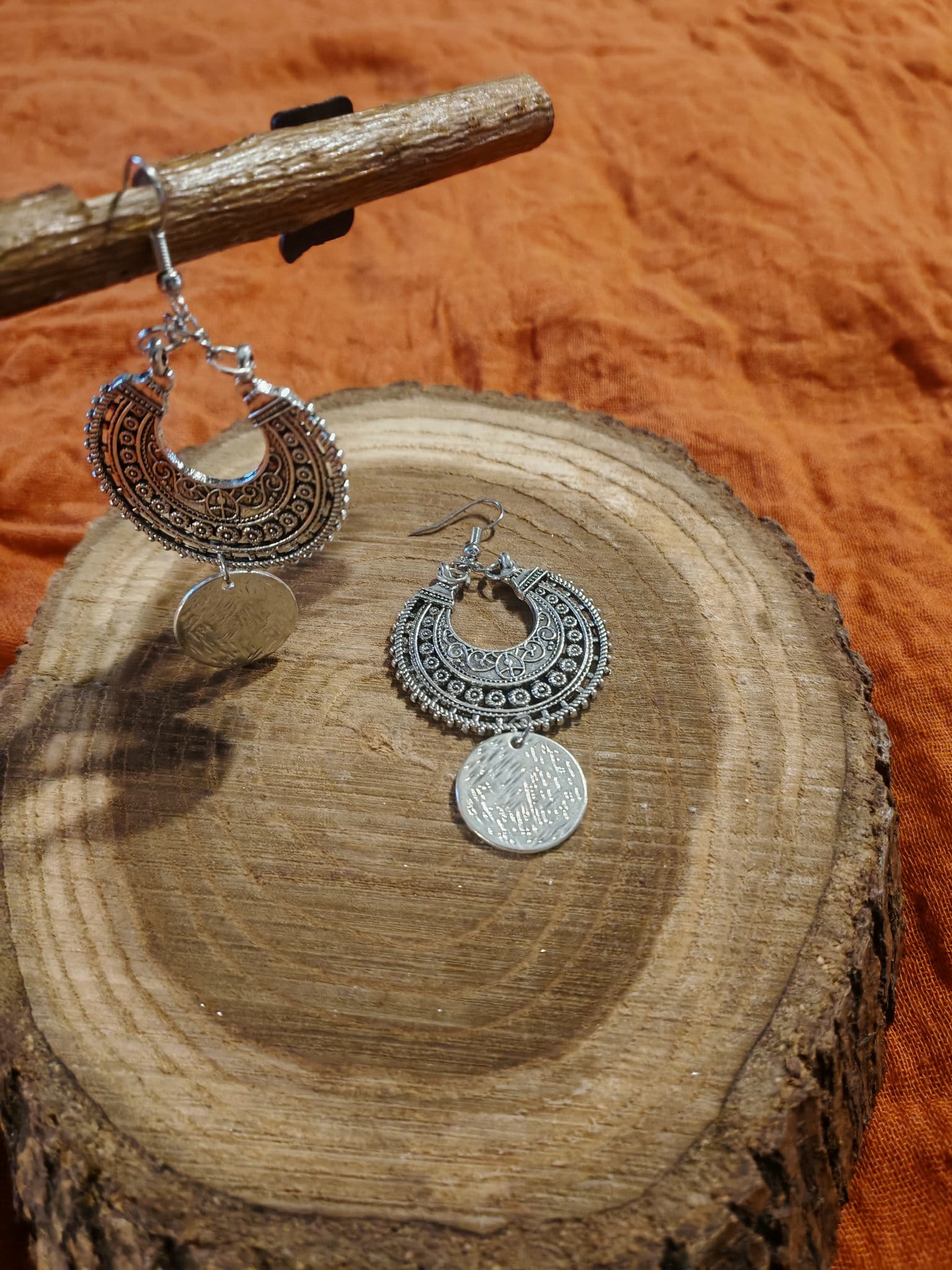 Bohemian style hoope earrings ): أقراط فضية كبيرة بنمط بوهيمي أو عرقي، تتميز بحلقات مزخرفة وتفاصيل محفورة، مع ميدالية دائرية متدلية من كل قرط.