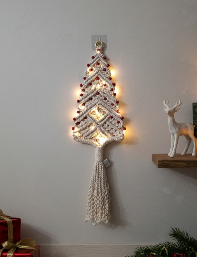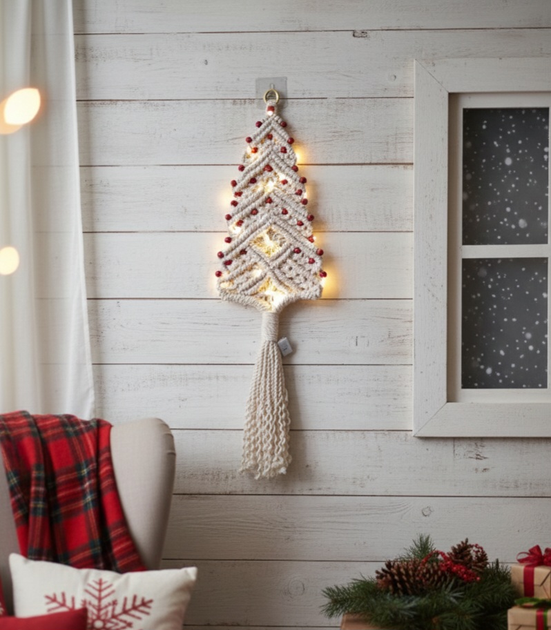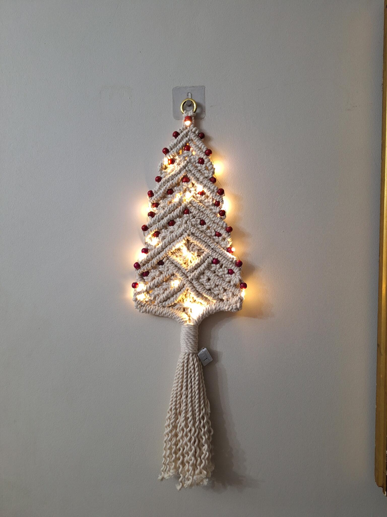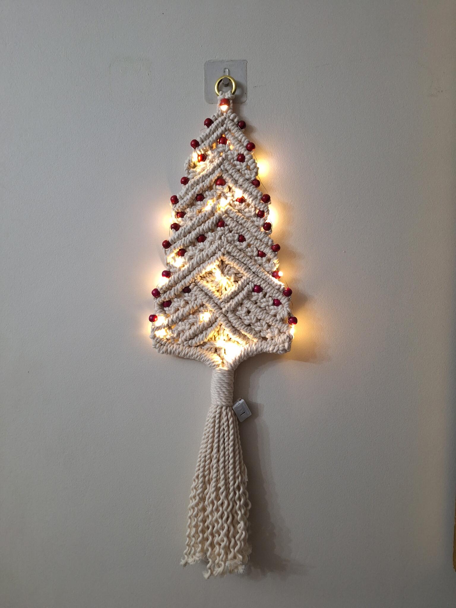 شجرة كريسماس مكرمية هاند ميد، متشغلة بعناية من خيوط قطن طبيعية ومطعمة بخرز أحمر ولمسات نور دافي تضيف إحساس بالدفا والبهجة في أي ركن في البيت ✨