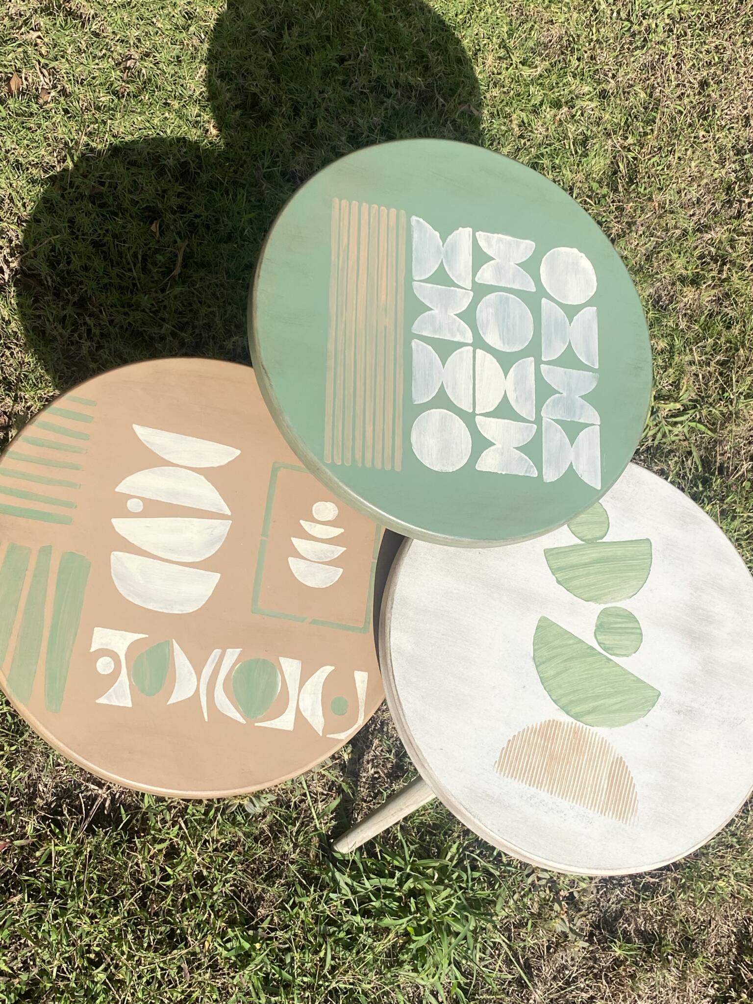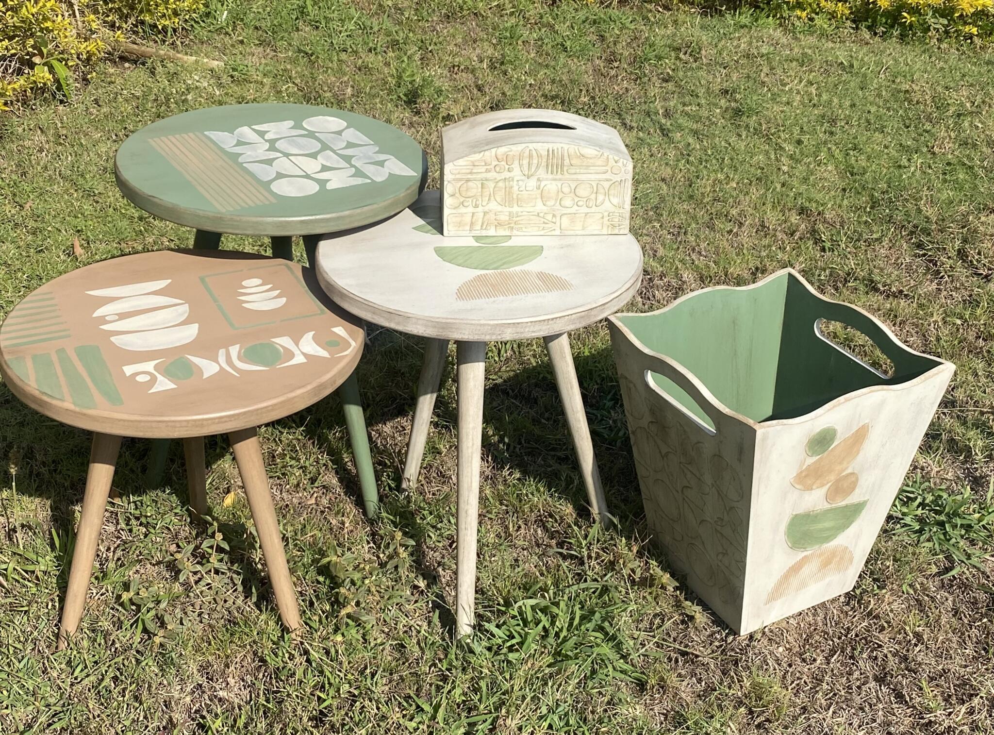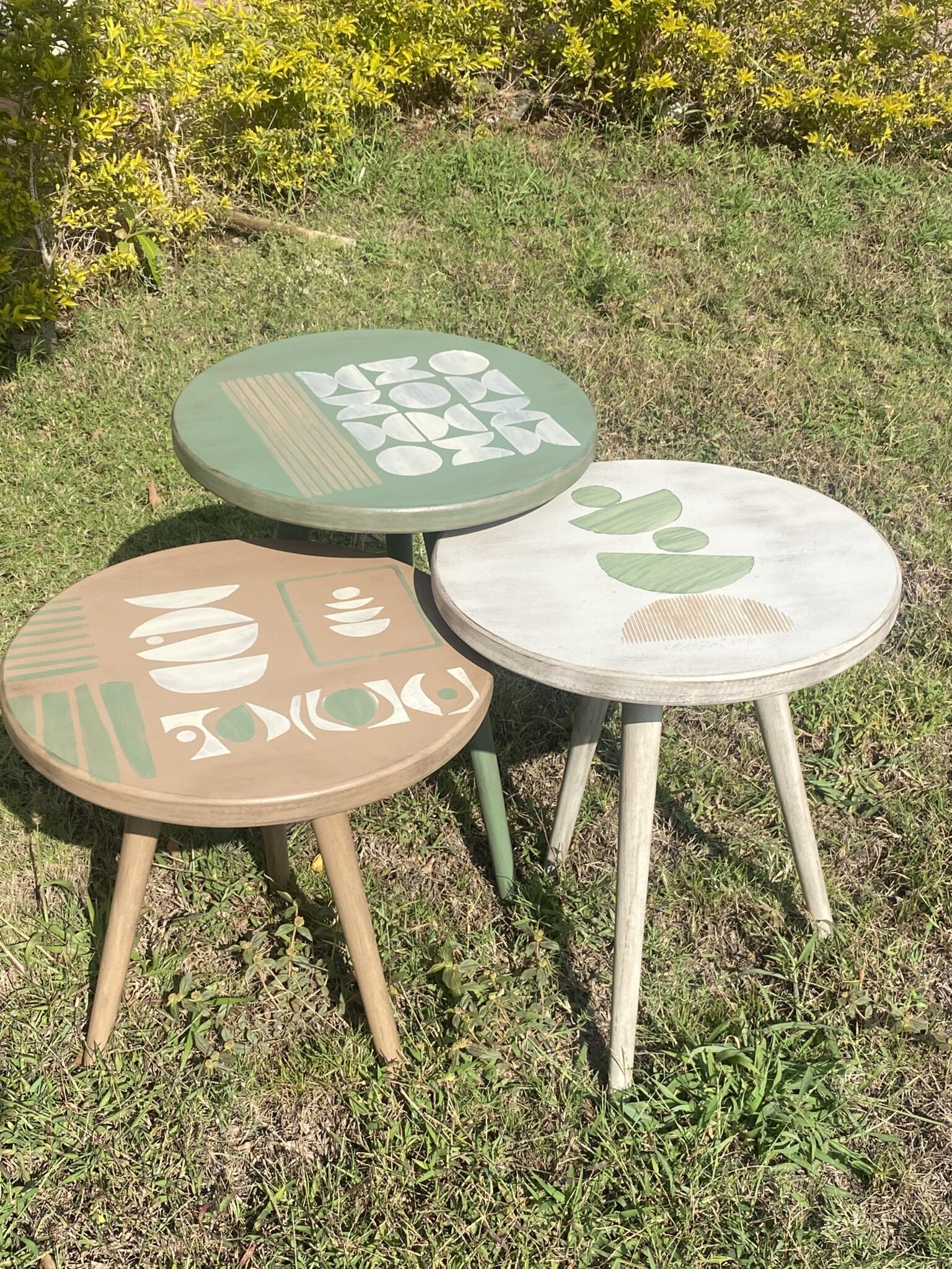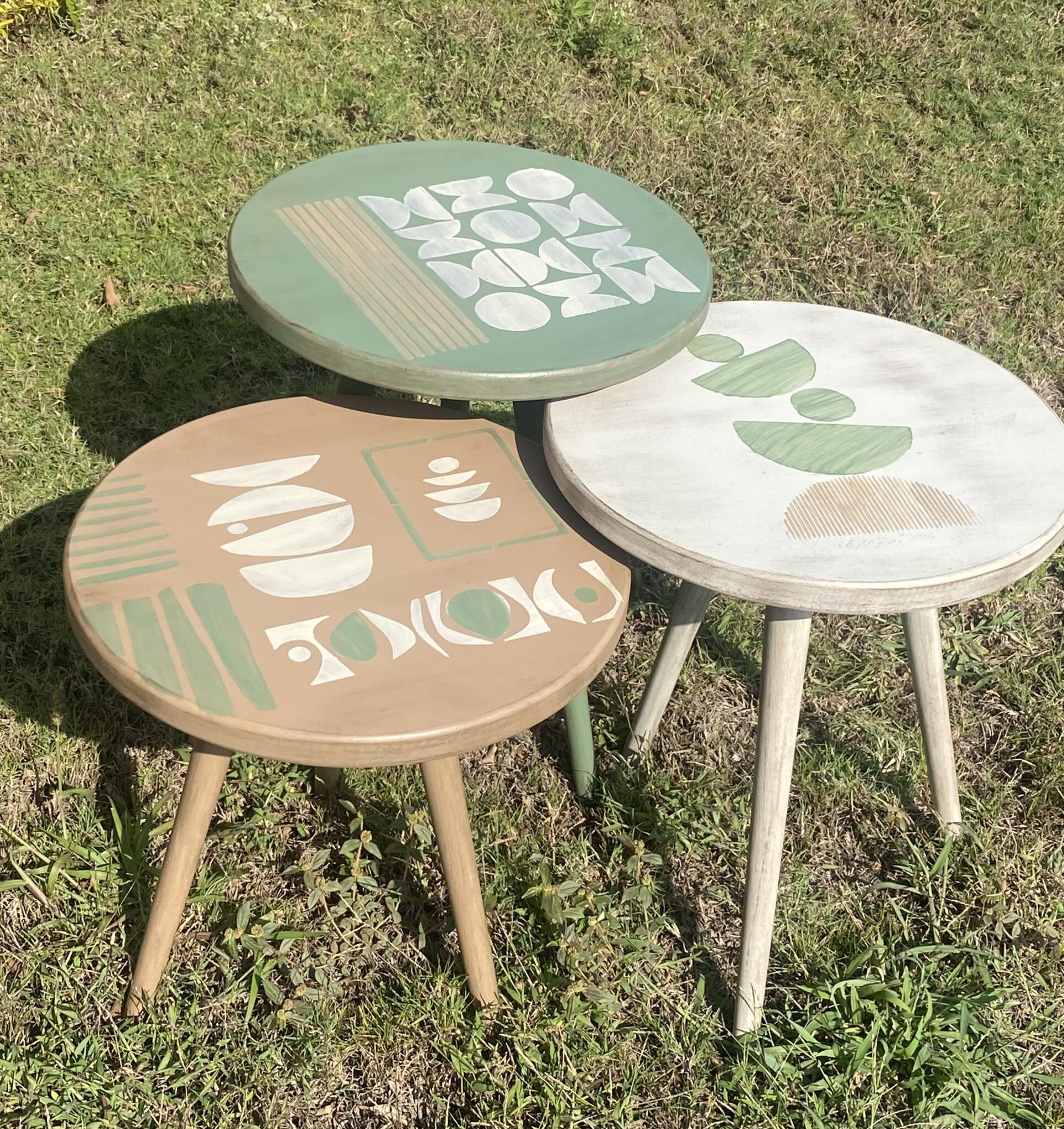 Wooden set of round tables in boho design