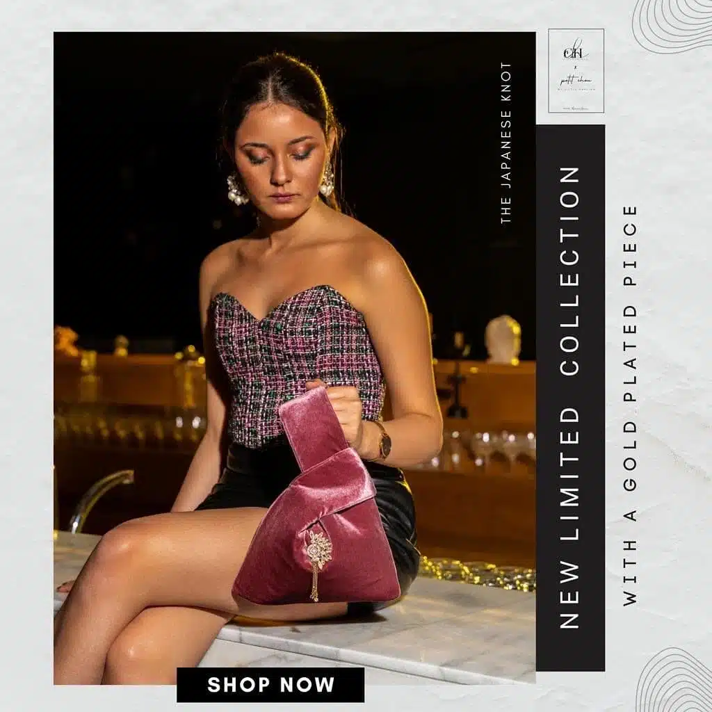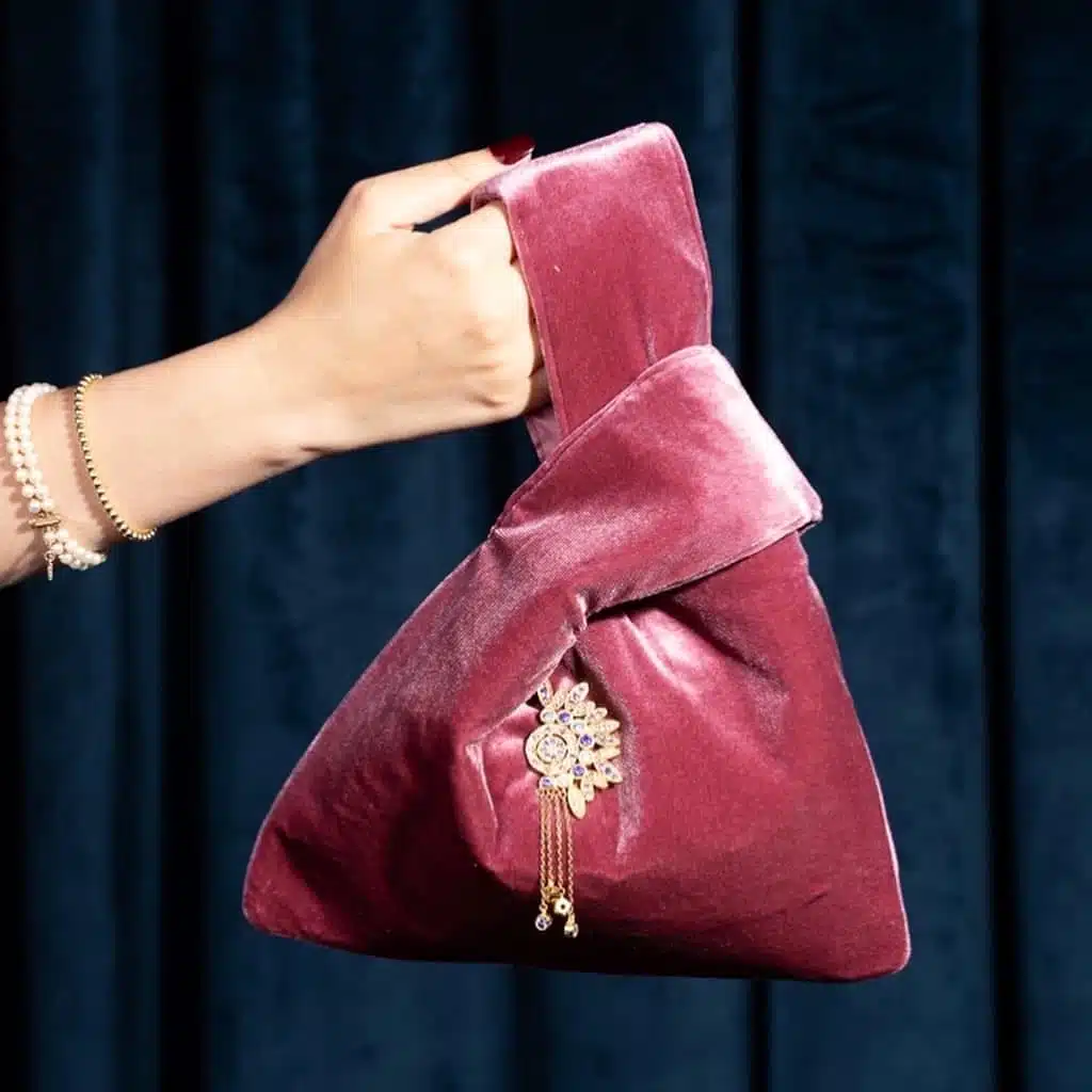 Bois de Rose Japanese Knot Wristbag, in rich Velvet Material , tailored with inside satin lining, and our signature yellow gold-embedded piece with purple stones, by CH by Christine Habib Azer,