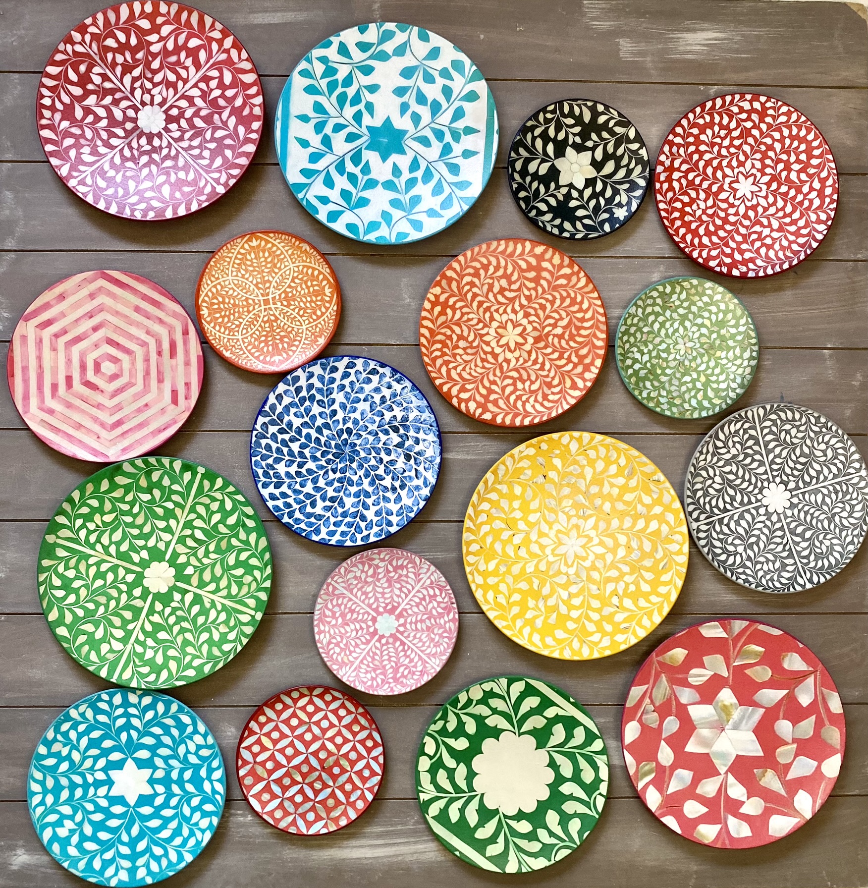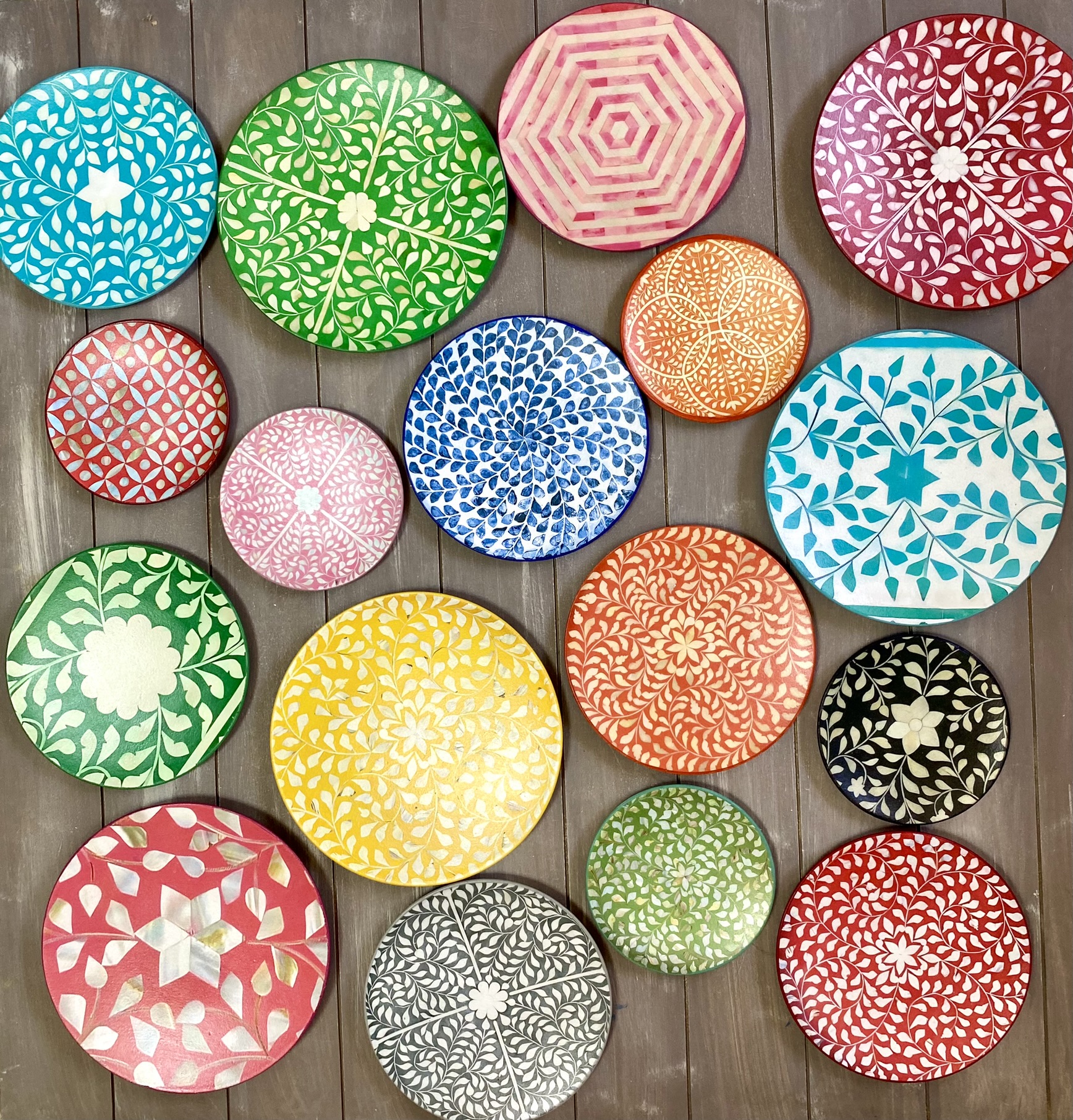 Decoupaged wall plates in colorful bone inlay design