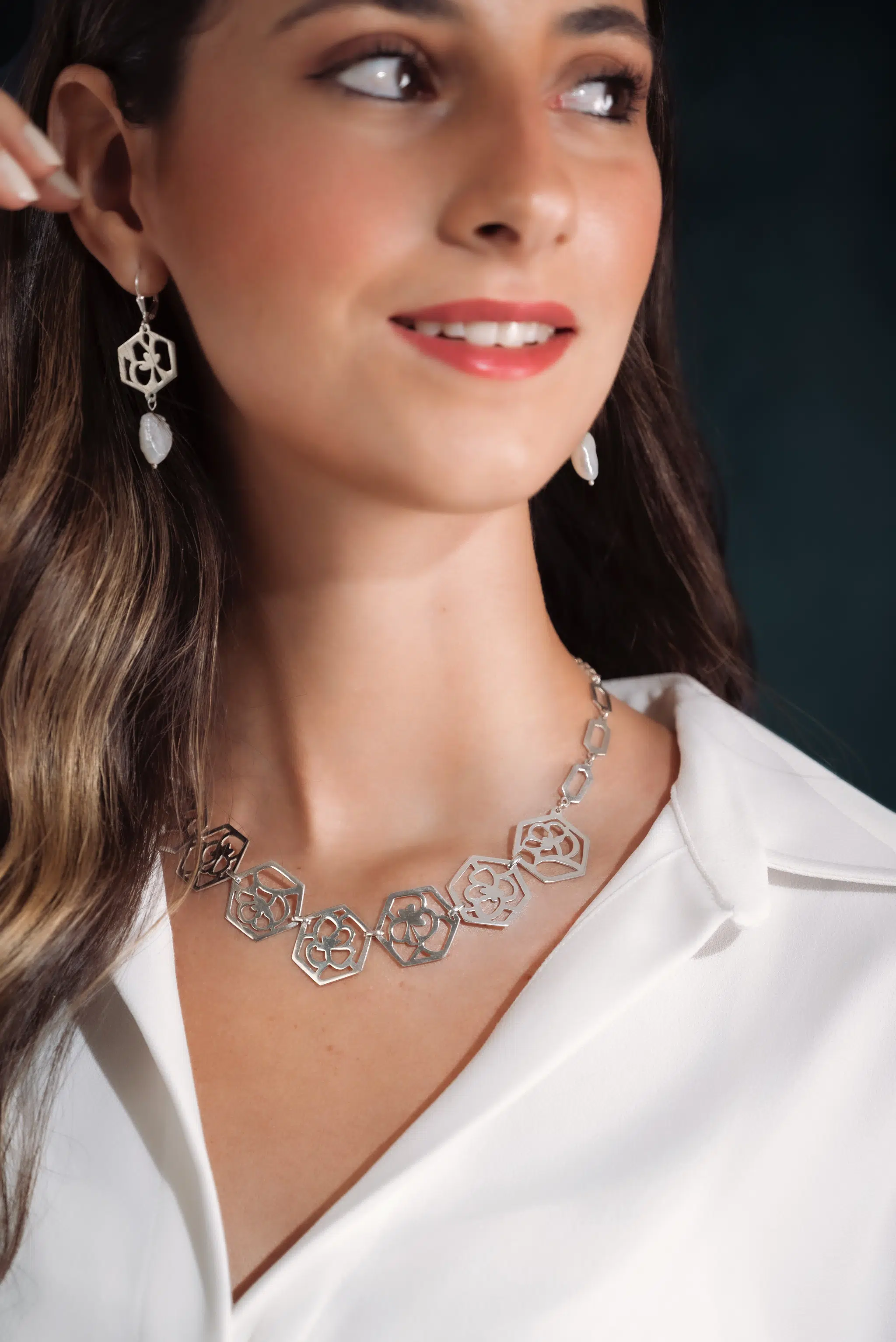 The luminous baroque pearl mingles with light so gracefully dangling from the Camellia flower motif. Bonnie Marie embraces the organic and highly personal look of the baroque pearls. The hooks make it move freely and naturally as you move.
