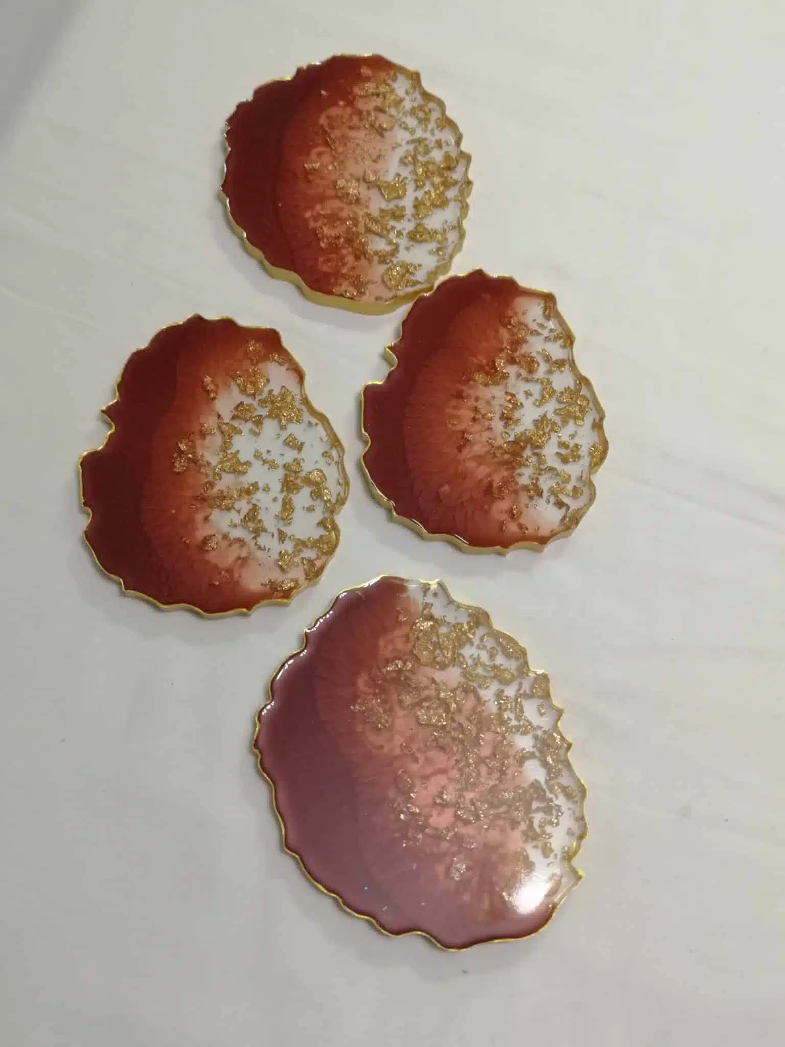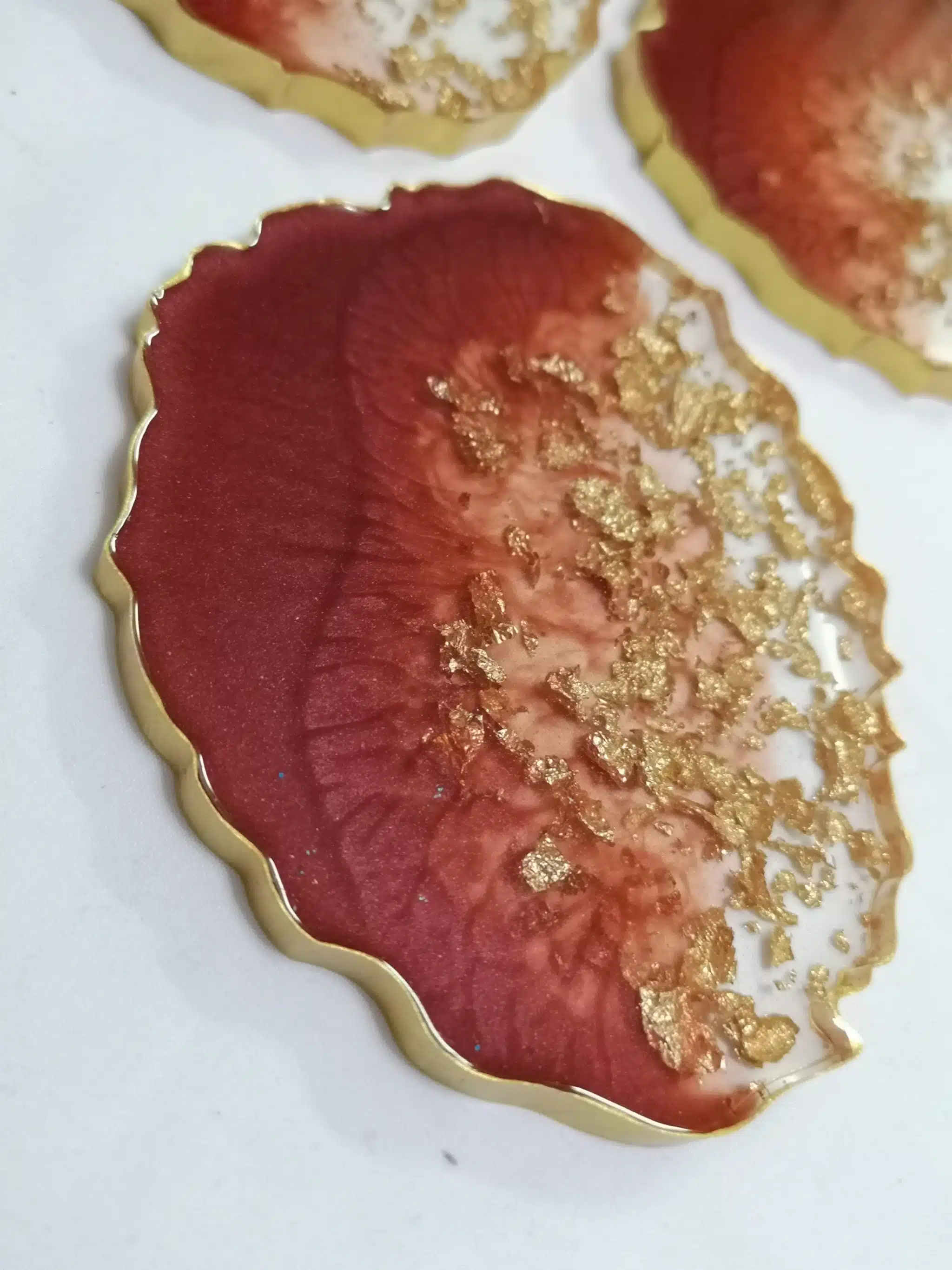 Oval bordeaux resin coasters with transparent resin and gold leaves. You can select from 3 different shapes.