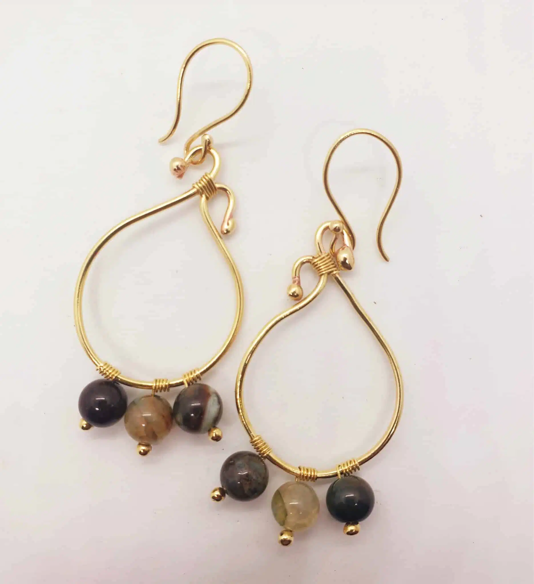 Circular-like brass wire earring with 3 dangling sphere colored agate stones.