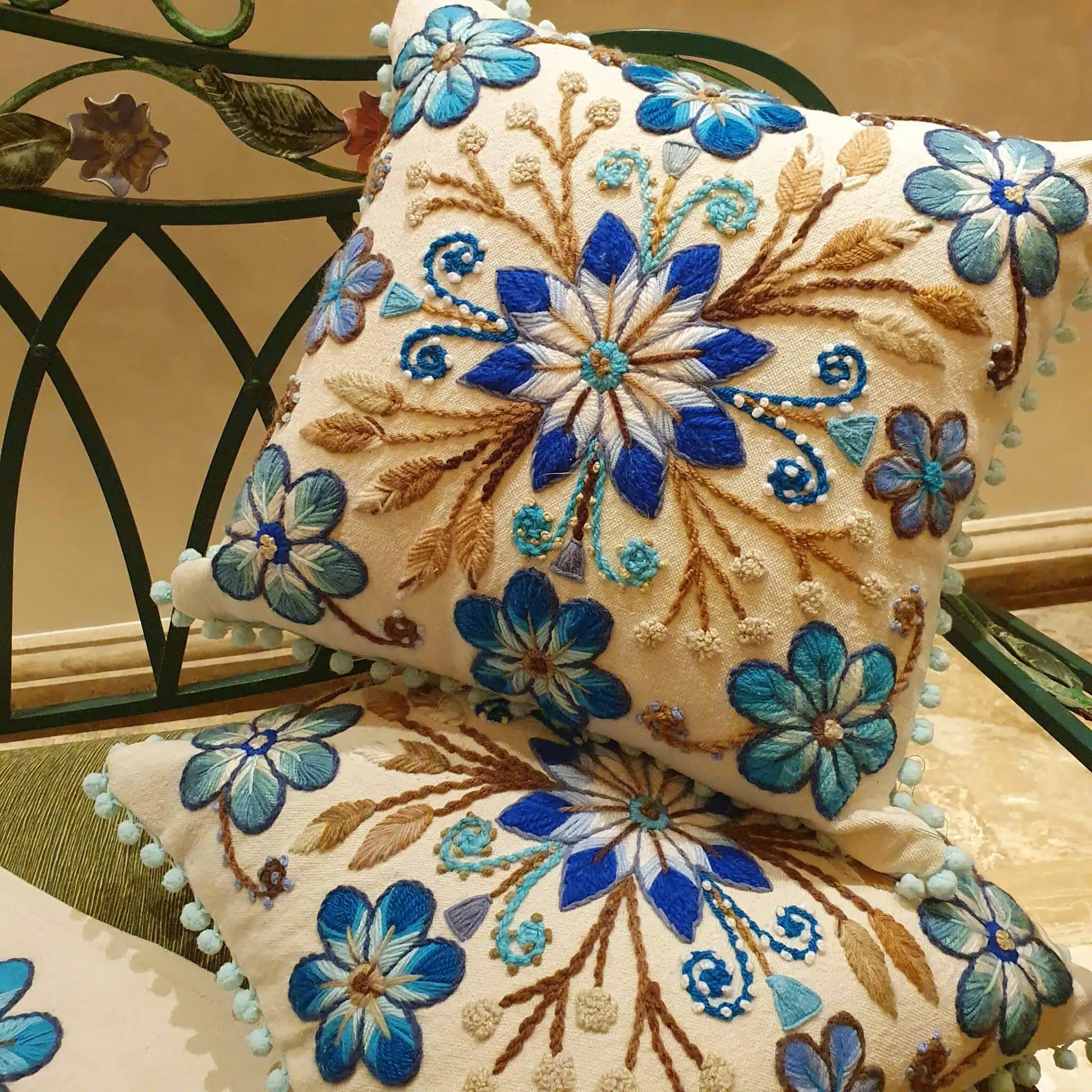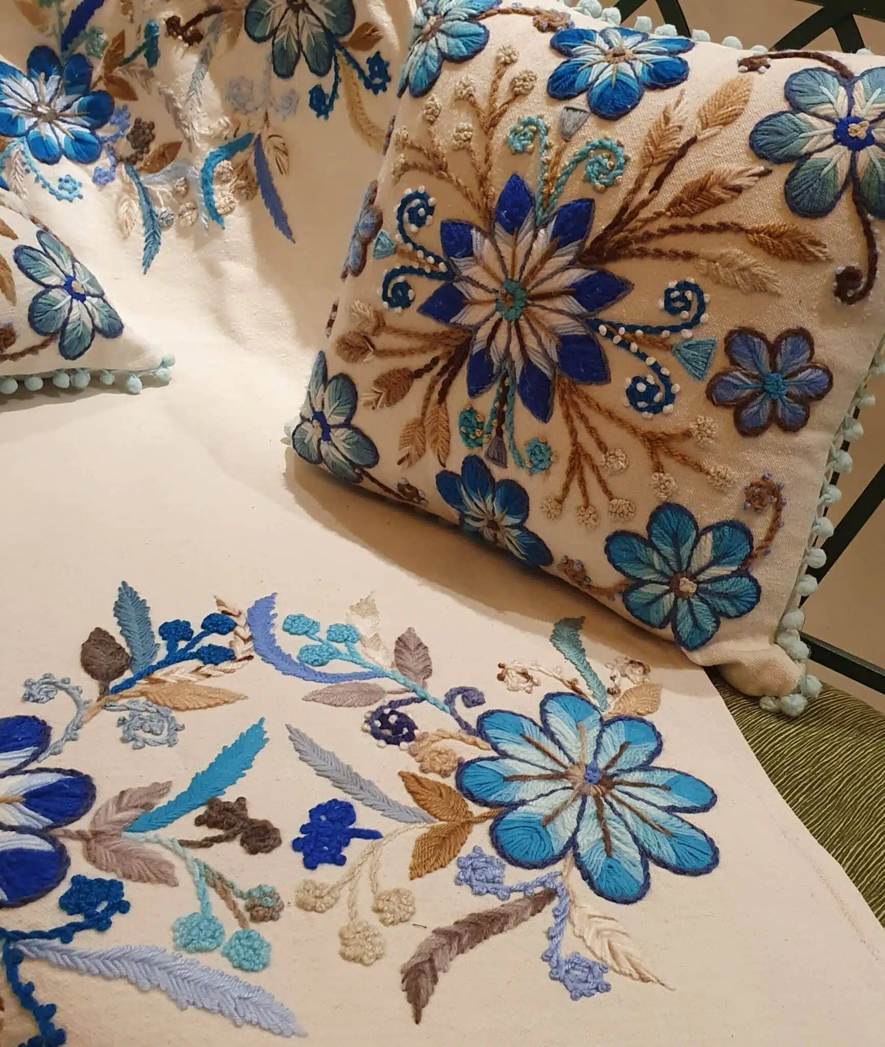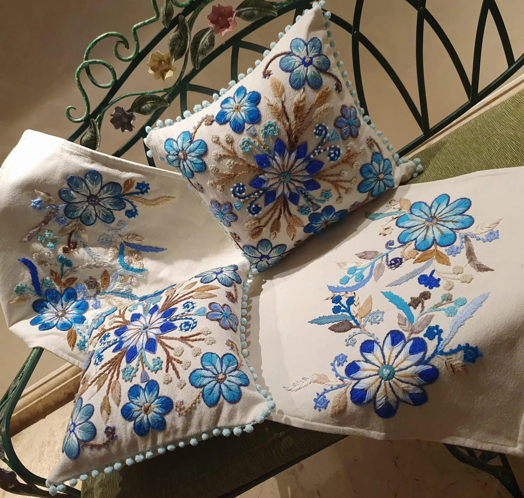 Handmade embroidery cushin cover 40×40 cm off white embroidery different tones of blue color.