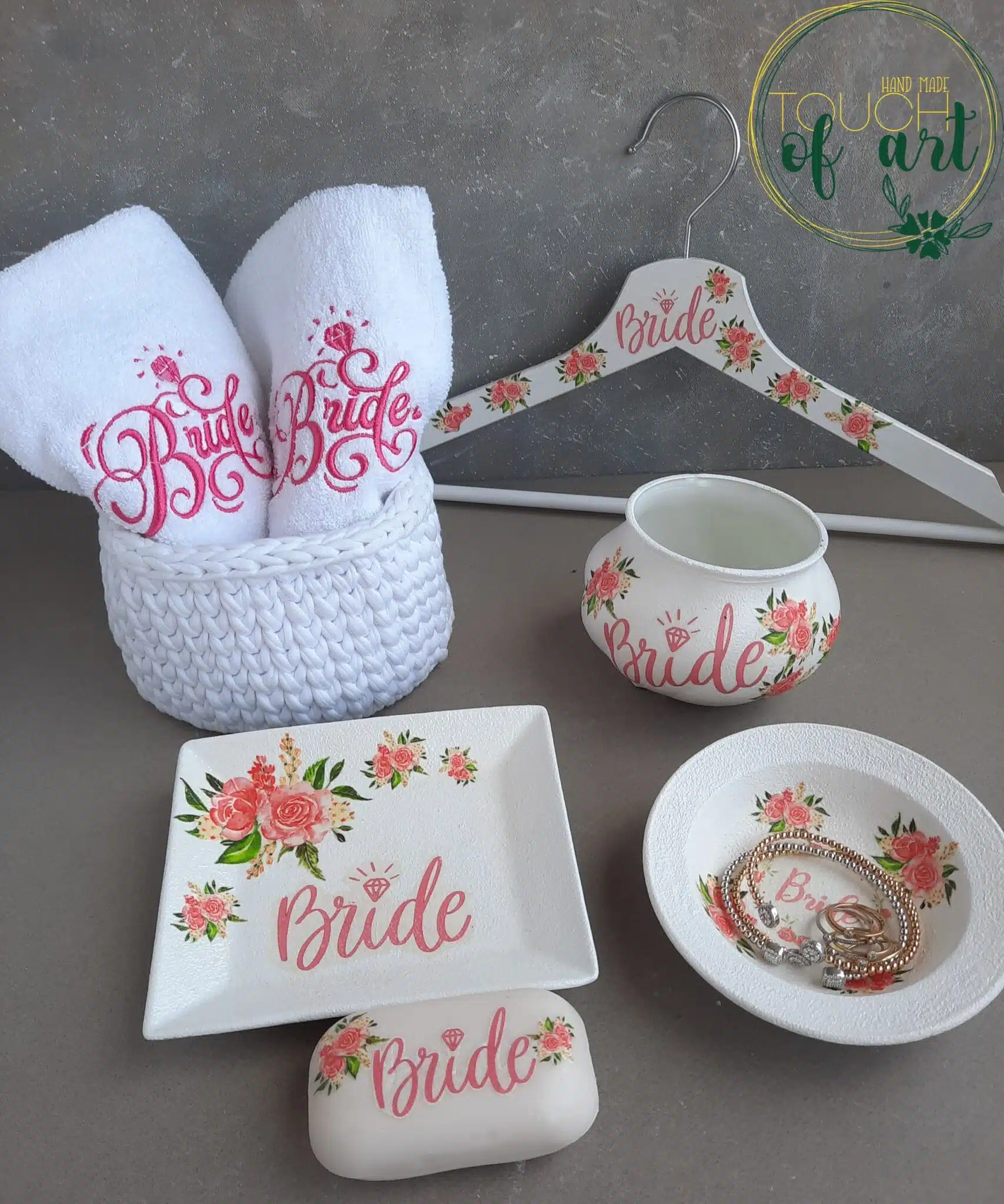 Bridal set is a perfect gift it consists of a soap plate with soap ,jewelry holder ,vase for dried flowers or candle ,hanger and a set of 2 small embroidered towels in a macrame pouch