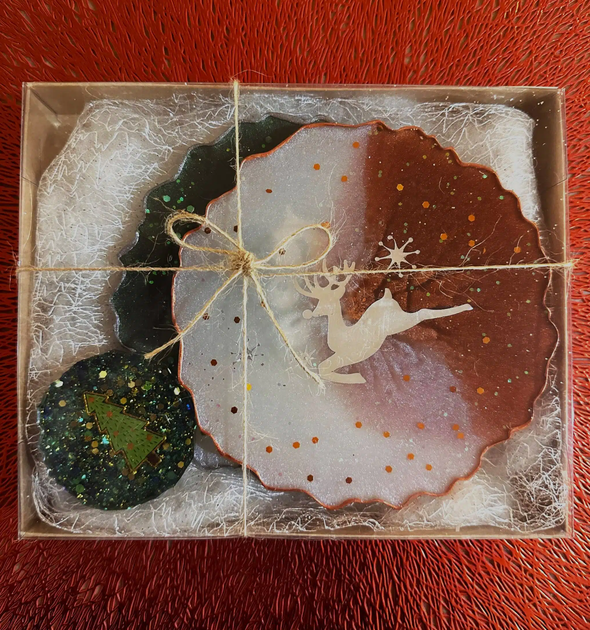 - 2 coaster in bronze and dark green mixed with white each with a different silver Christmas sticker