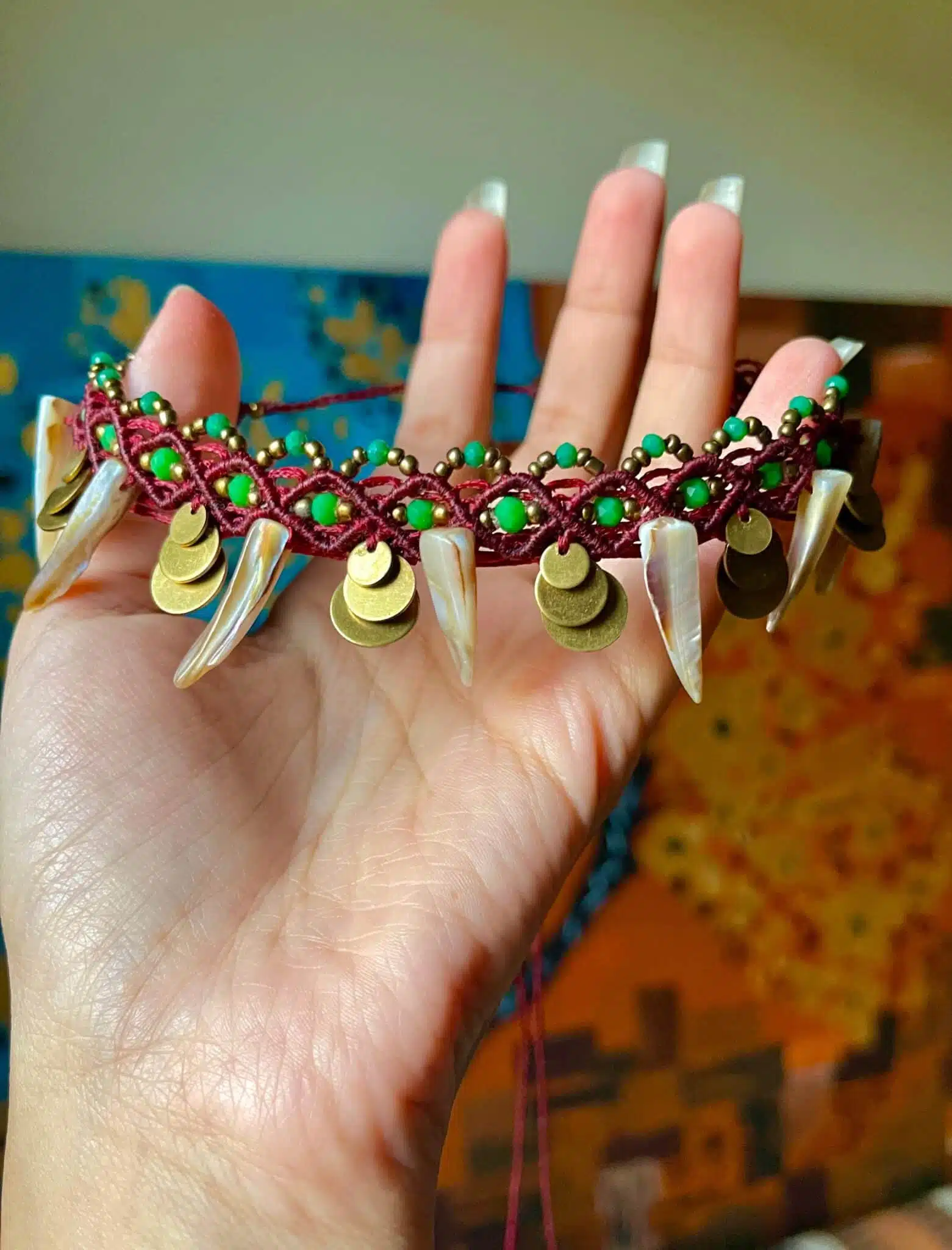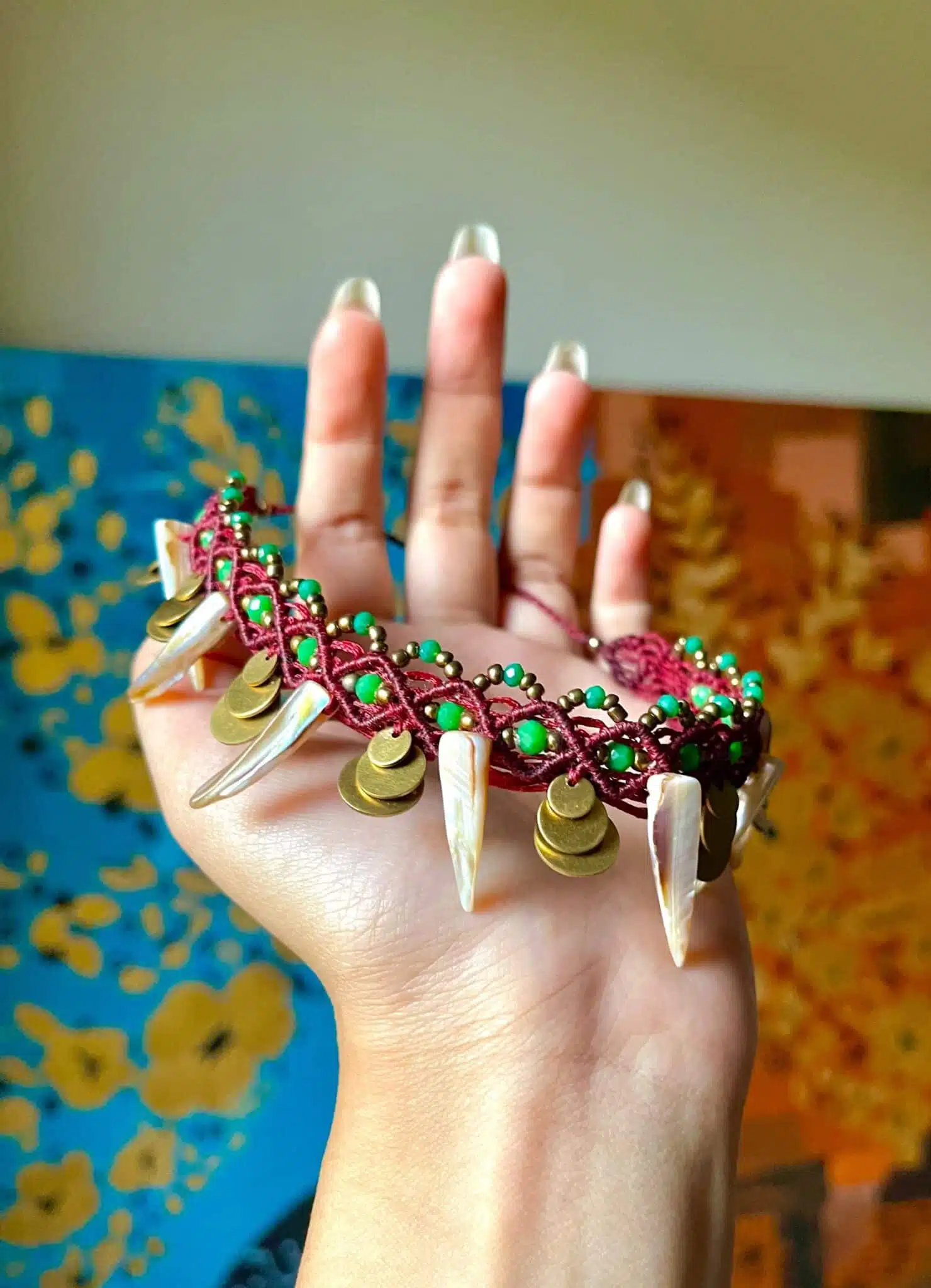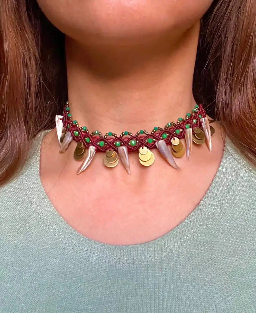 A Handmade adjustable necklace created with Ivory pieces and brass woven by burgundy cords.