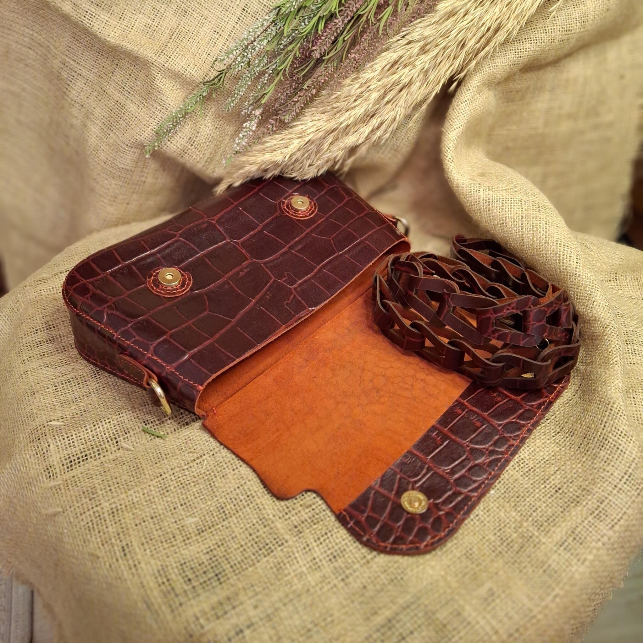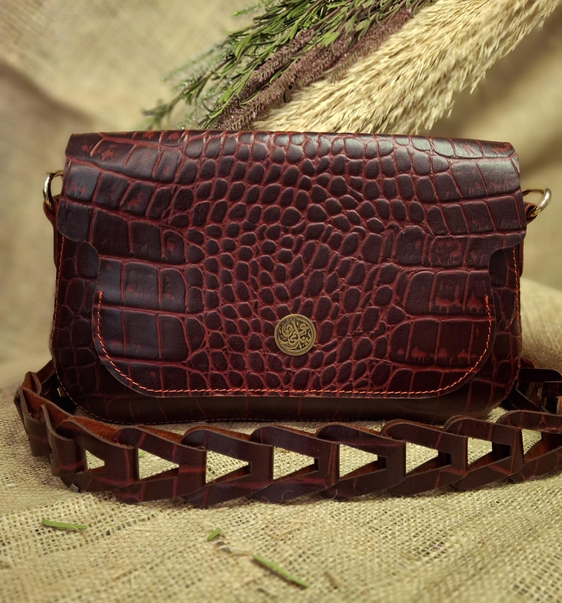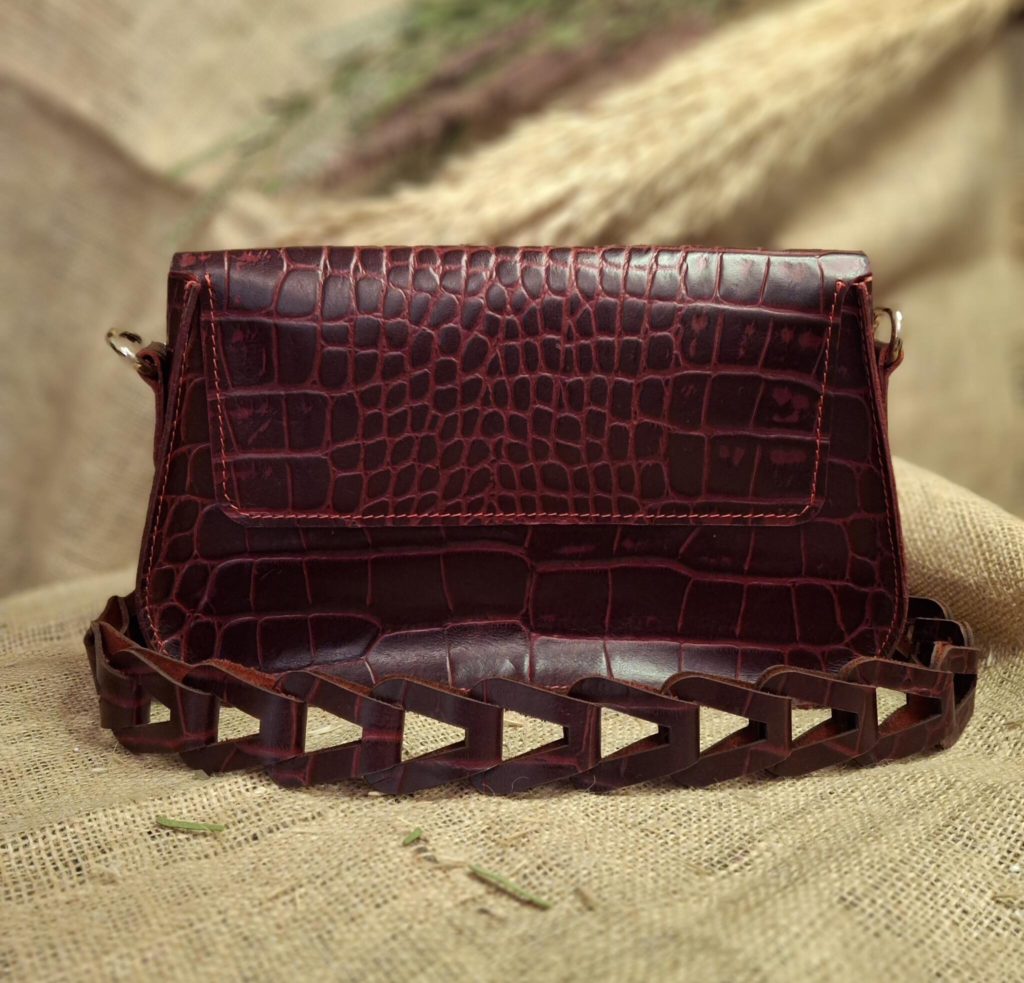 شنطة كتف أنيقة بلون أحمر غامق بنقشة جلد التمساح، تتميز بطابع كلاسيكى انيق وسلسلة يد عصرية.