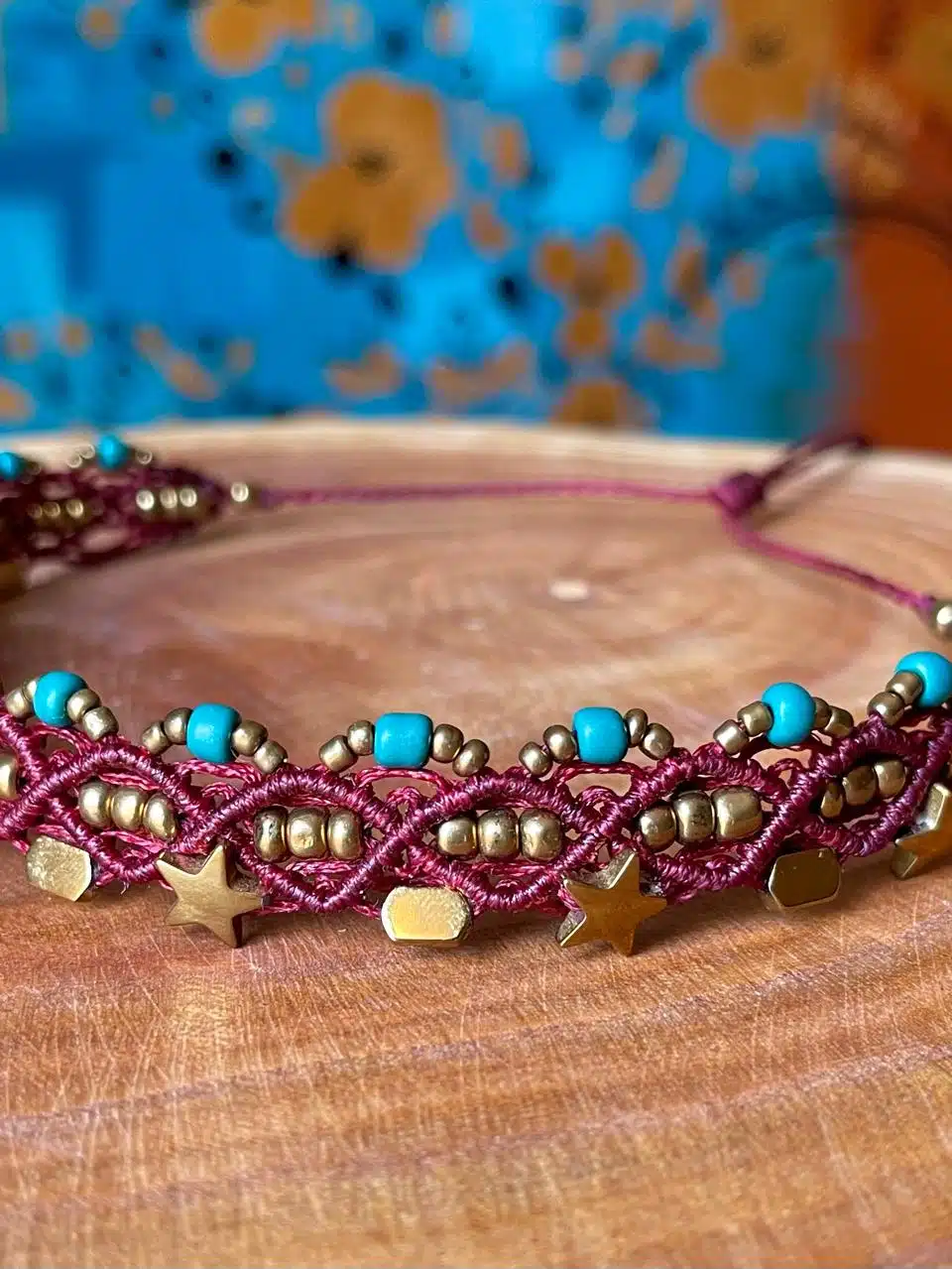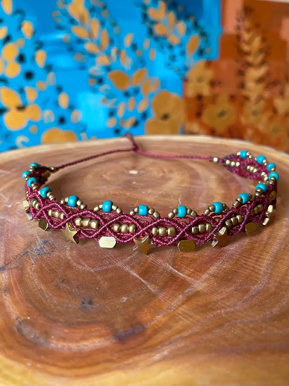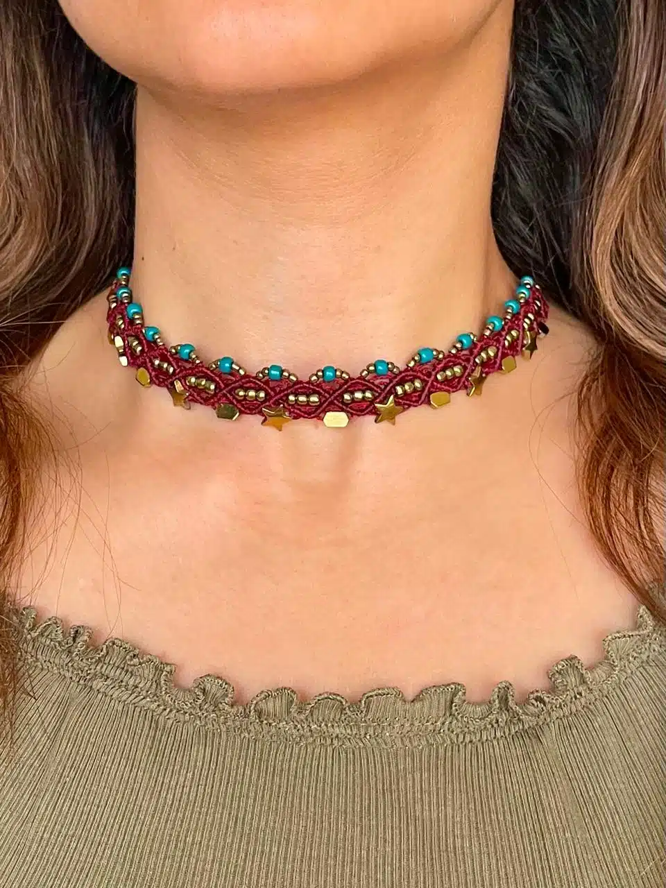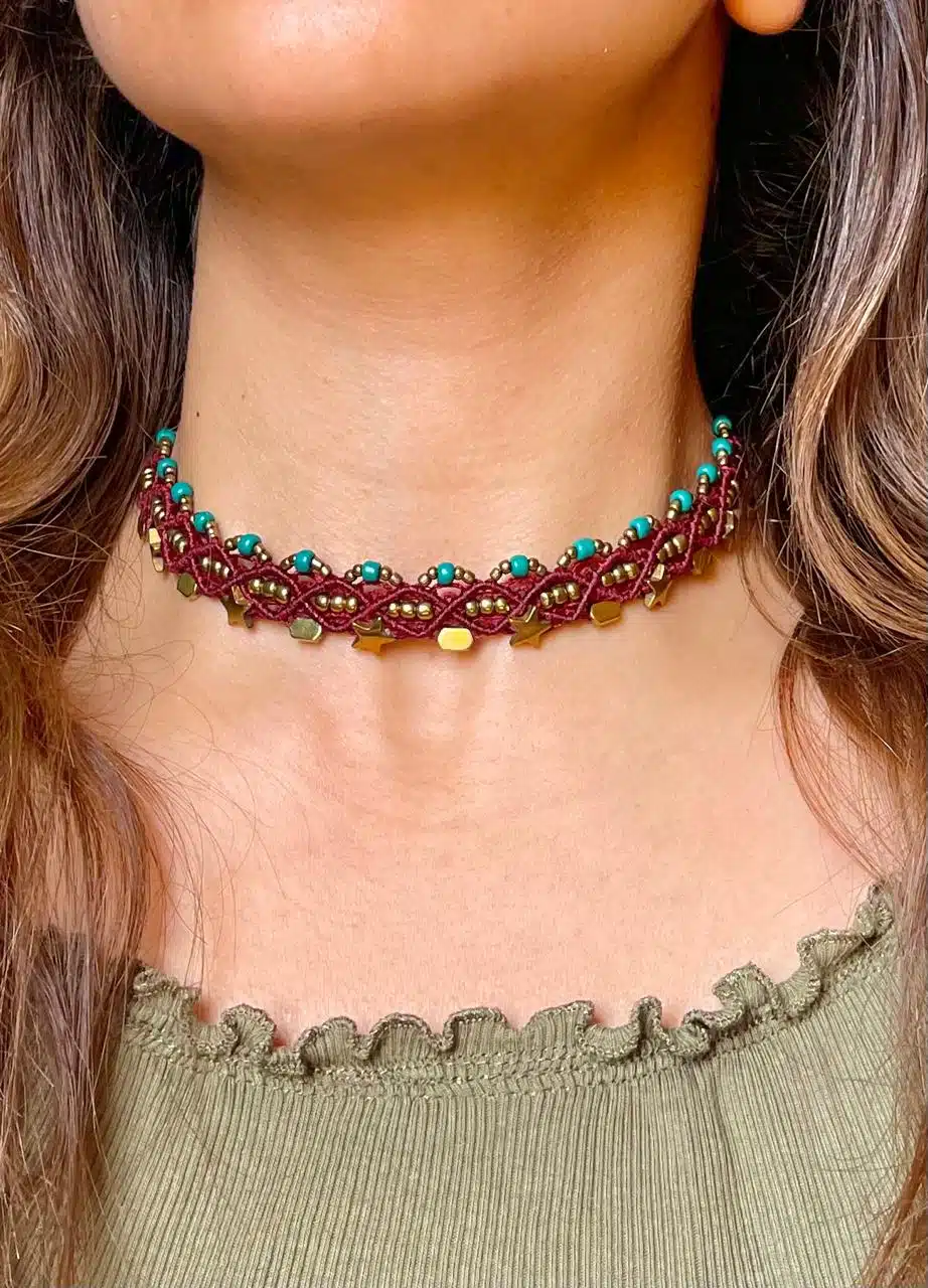A Handmade adjustable necklace created by Burgundy cords and Hematite charms that don’t change any color.