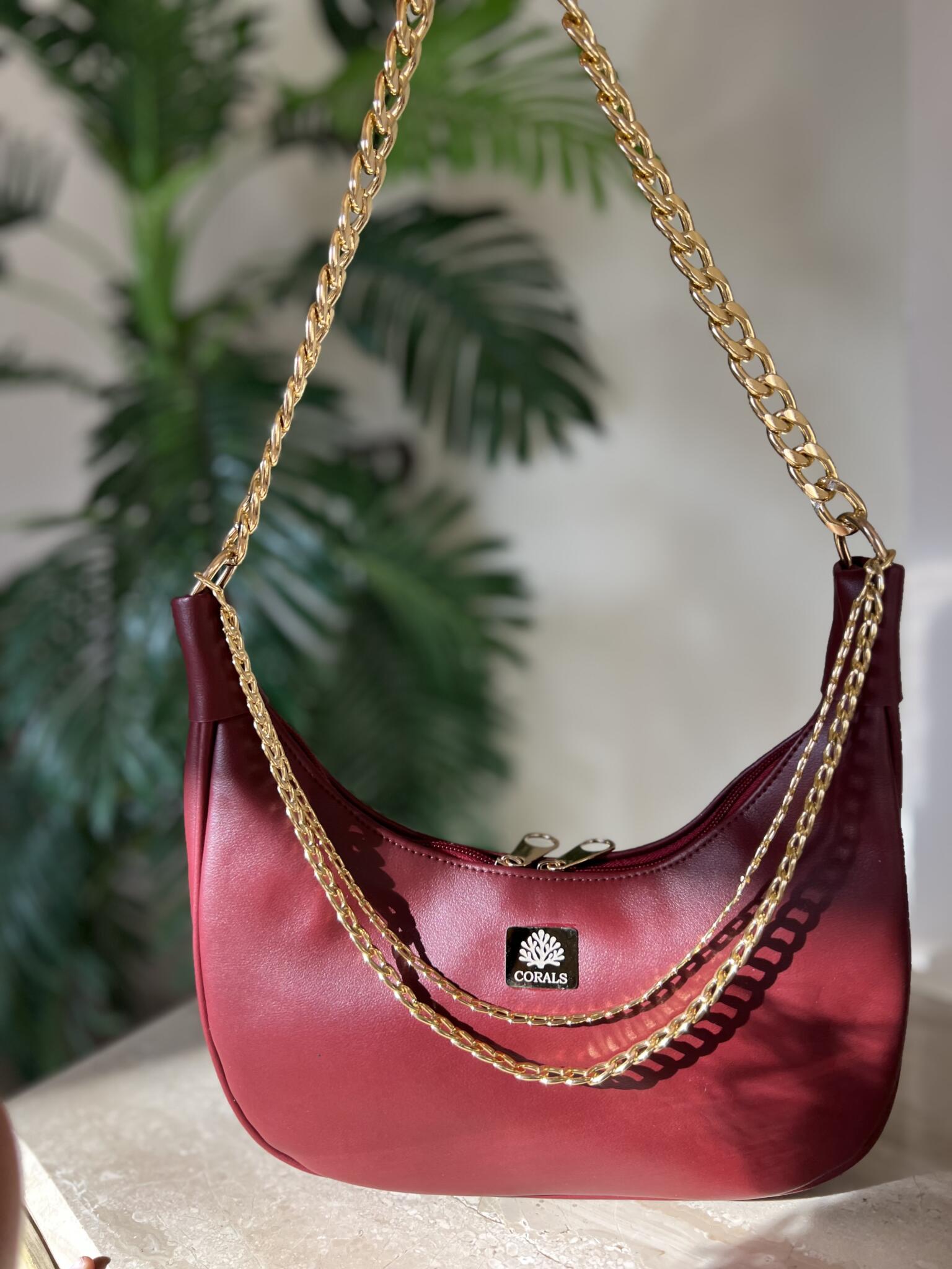 Elegant burgundy hobo bag featuring luxurious gold chain straps and a sleek curved silhouette. Crafted from premium leather with the CORALS signature emblem, this sophisticated accessory combines timeless style with everyday functionality. Perfect for adding a touch of glamour to any outfit.