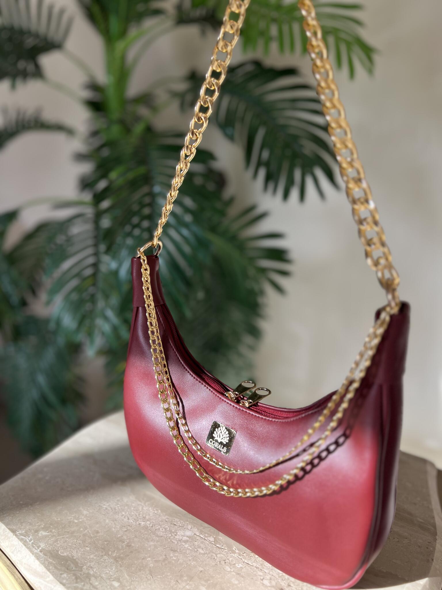 حقيبة هوبو عصرية بلون عنابي فاخر مع سلاسل ذهبية أنيقة وتصميم انسيابي مميز. مصنوعة من الجلد الفاخر وتحمل شعار CORALS، تجمع هذه الحقيبة الراقية بين الأناقة الكلاسيكية والعملية اليومية. مثالية لإضافة لمسة من الفخامة لأي إطلالة.