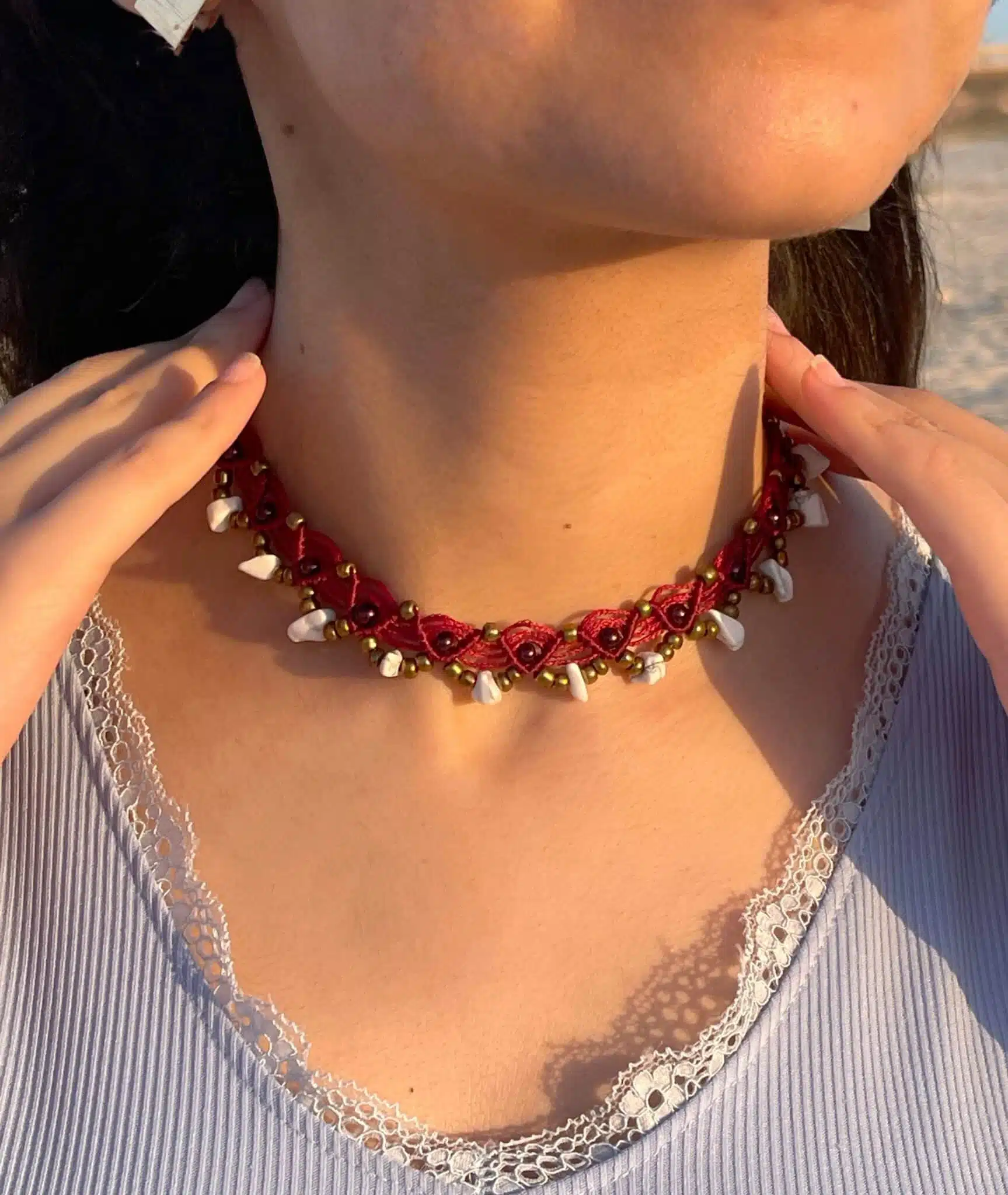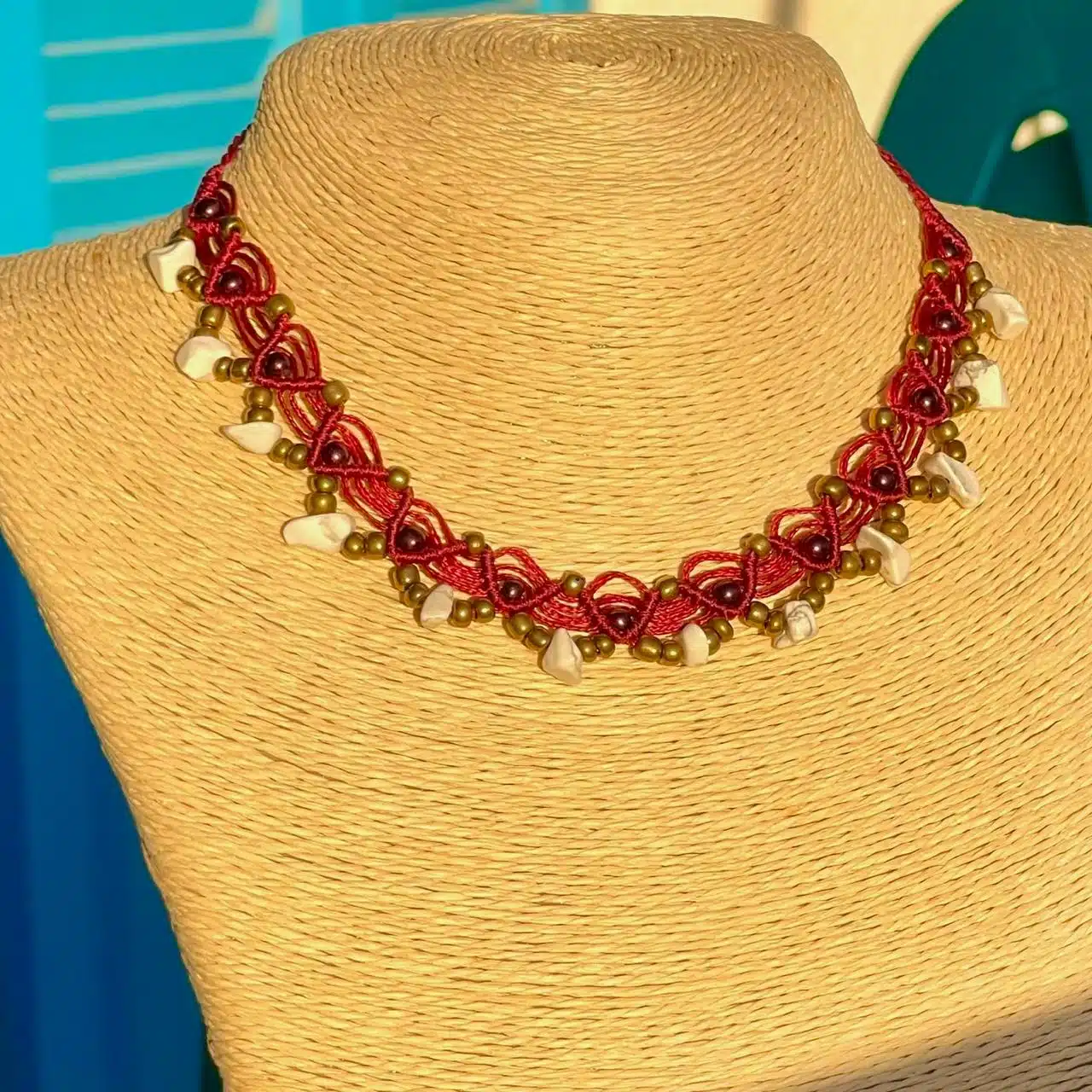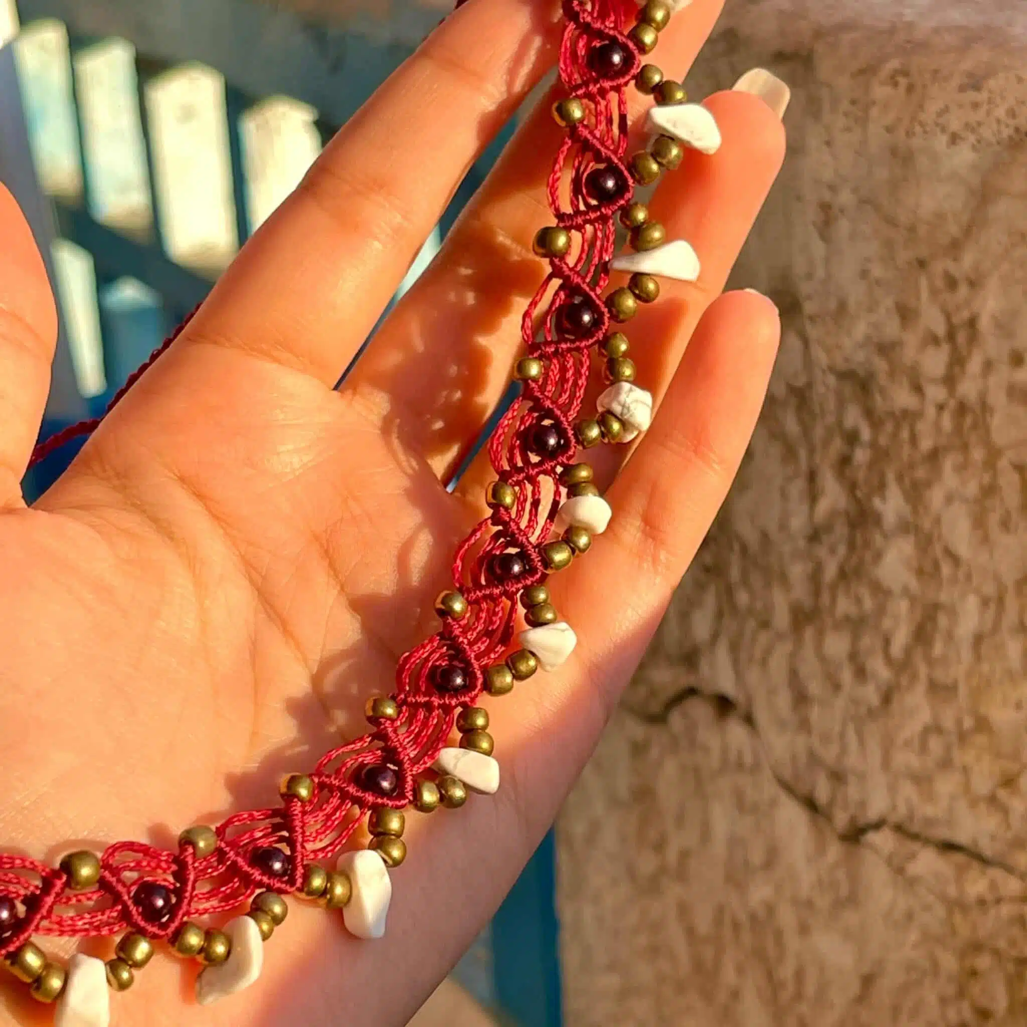 A handmade choker created by Burgundy cords mixed with brass and Howlite crystal stones.