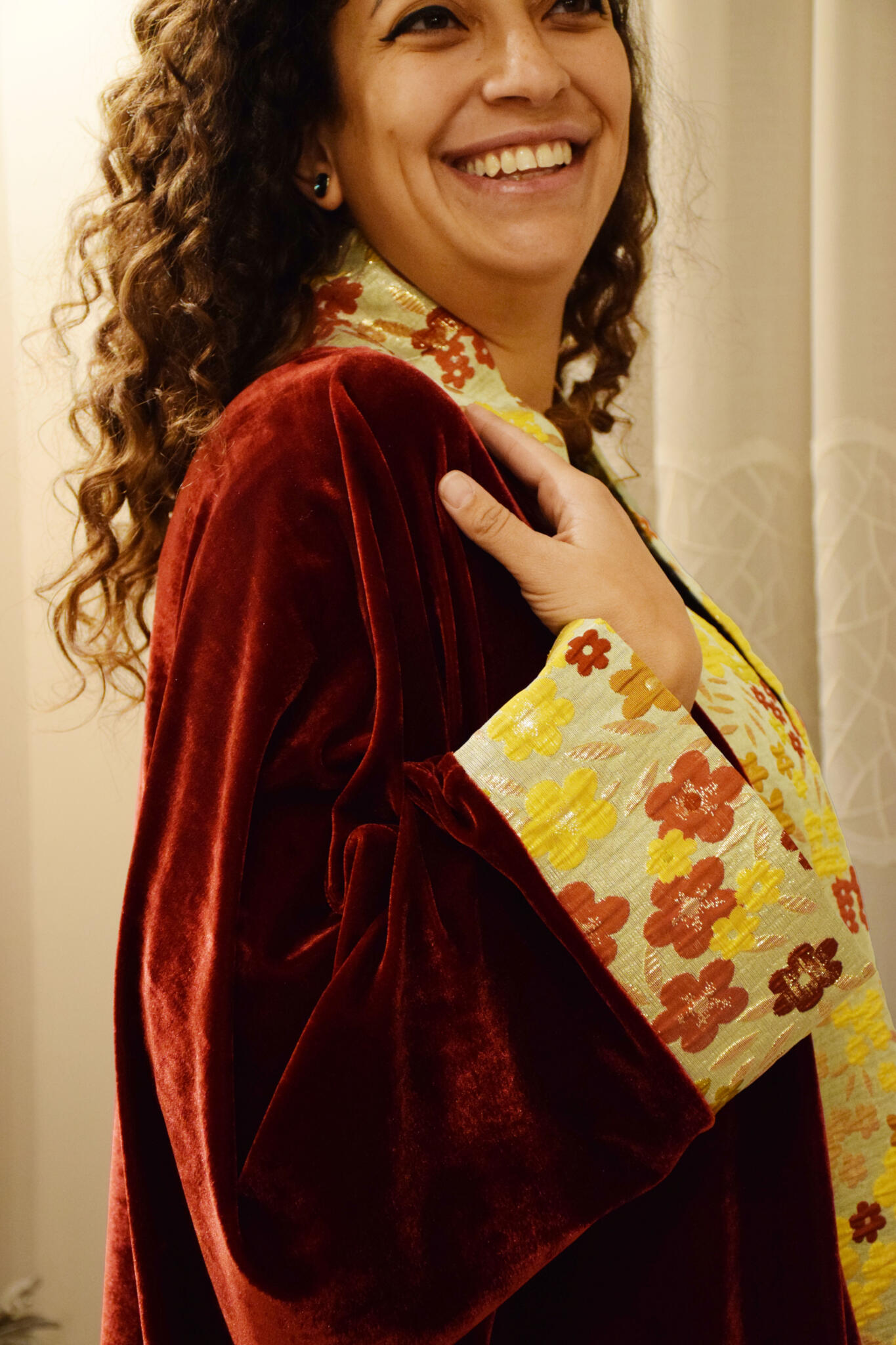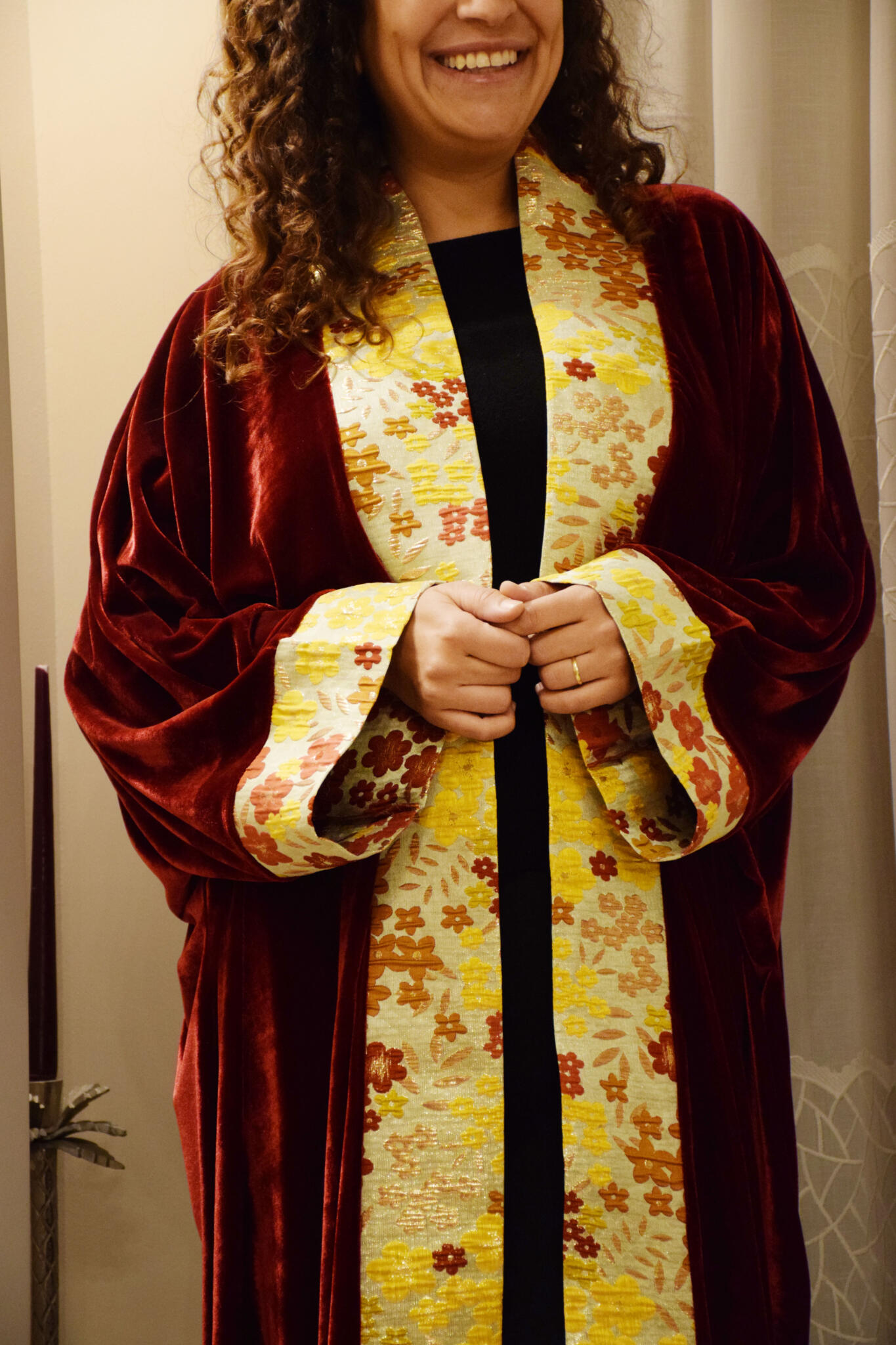 - Soft florals, rich burgundy