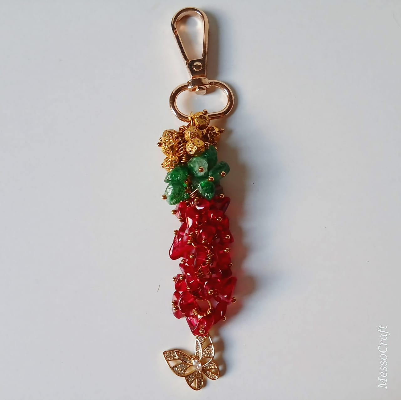 Bag charm | key chain made of green and red chip stones beads and lava stones and gold platted pendant in the shape of a butterfly with tiny zircon stones
