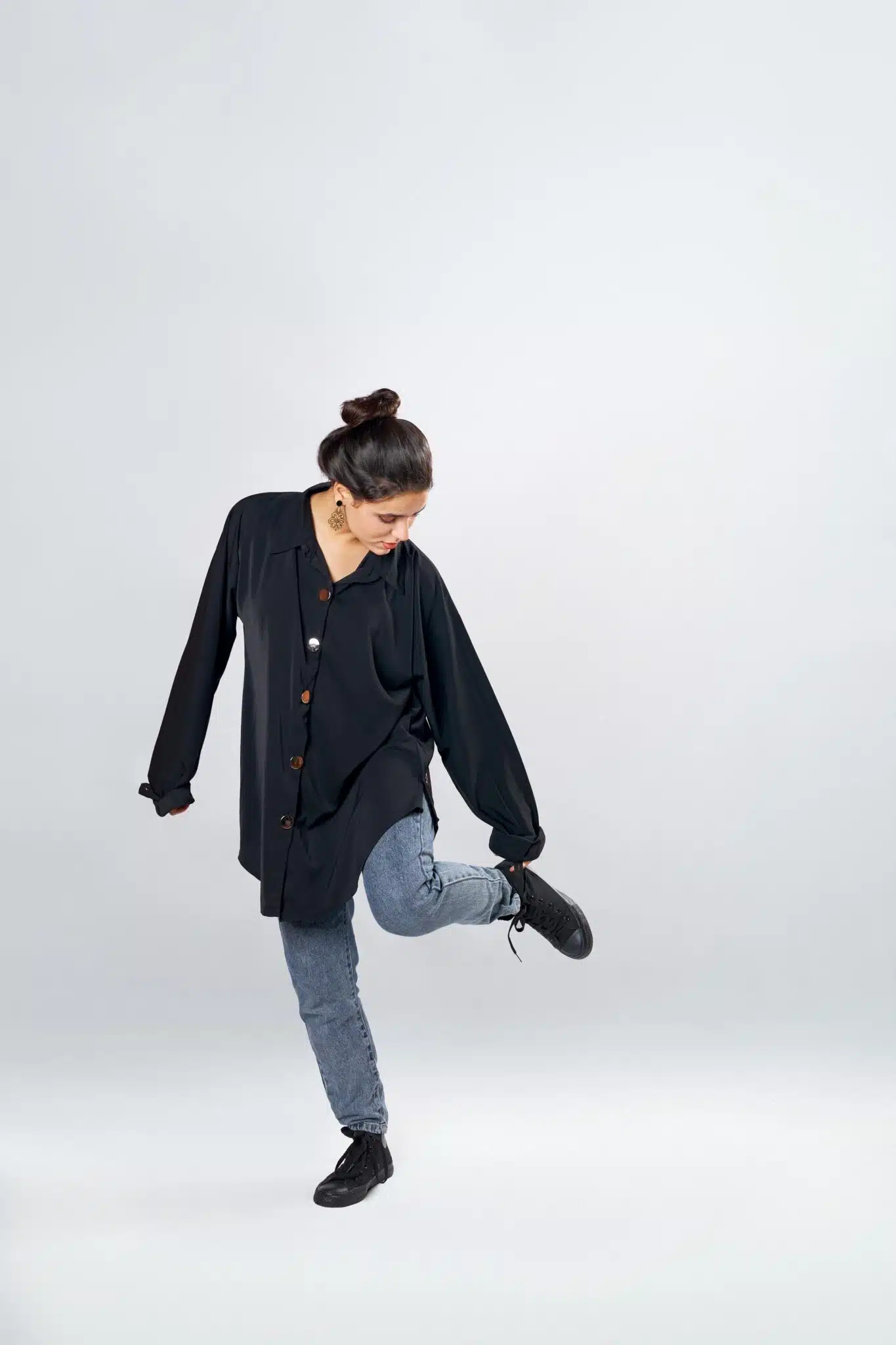 HAZEL Long Buttons Shirt, available in black and off-white, is your go-to for effortless style. Crafted from soft, cool fabric, it offers comfort while transitioning seamlessly between classic and casual looks. Its tailored, button-down design flatters all body types, and it’s available in sizes S/M and L/XL.