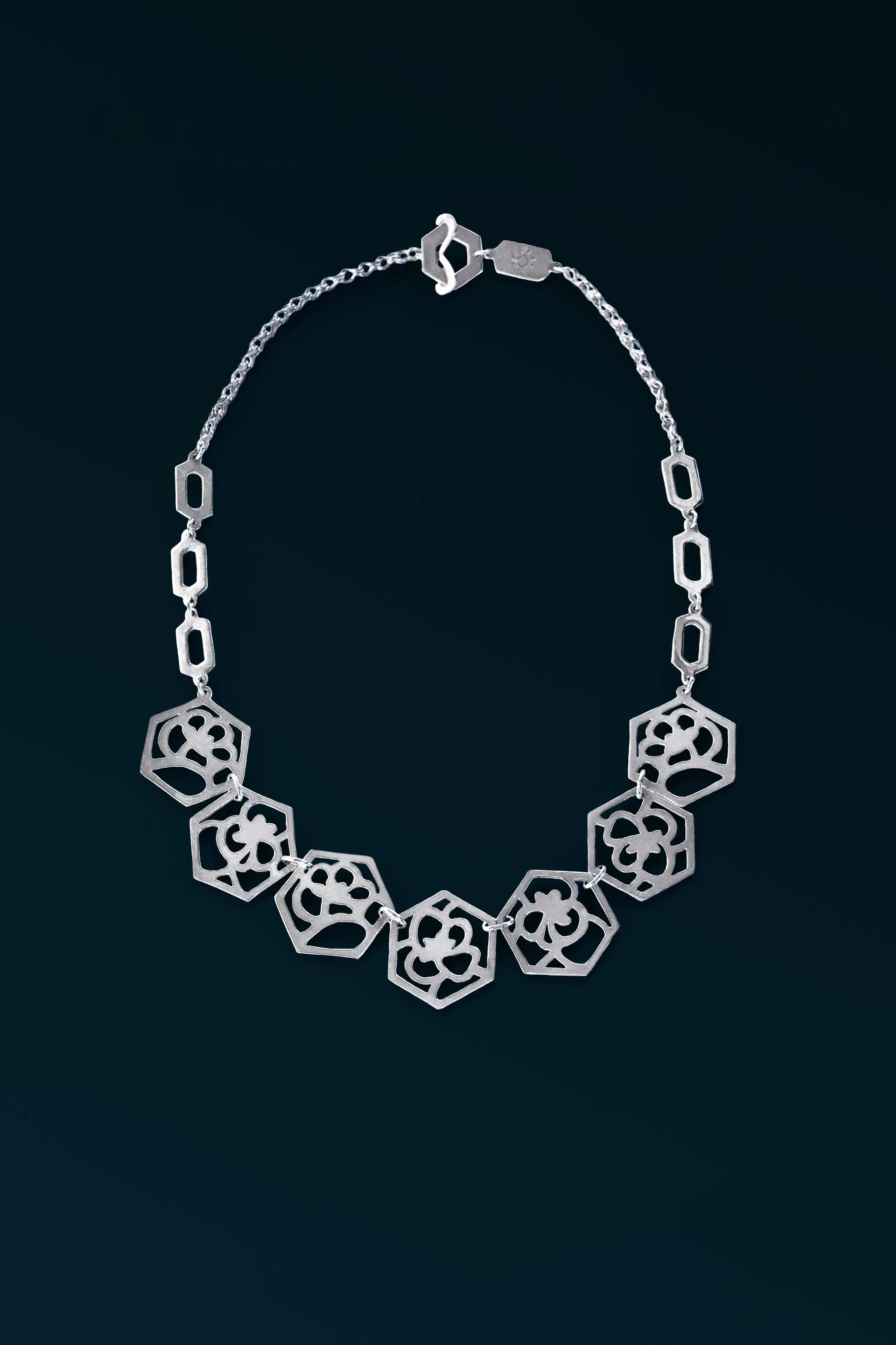 Motifs of the Camellia flower meticulously sawn by hand and intricately linked together. This necklace is a statement of fine craftsmanship where the structured geometry of the hexagon frame contrasts beautifully with the unique, fluid shapes of the Camellia flower.