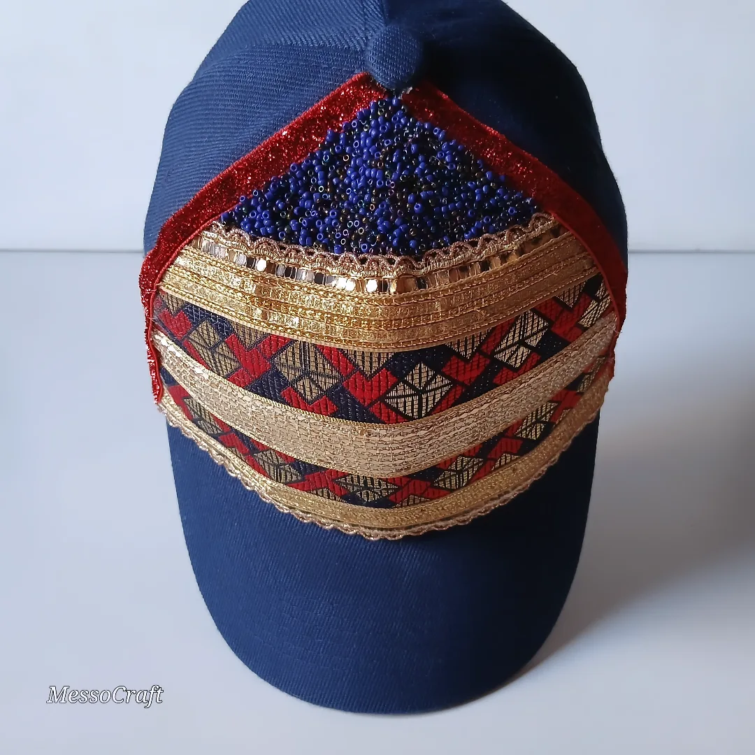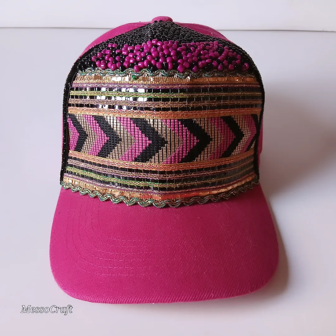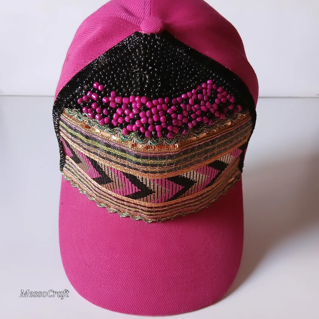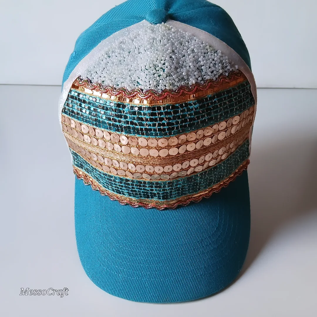 cap is a canvas of creativity — detailed with hand-sewn Indian galon trims and beads that add texture and depth.