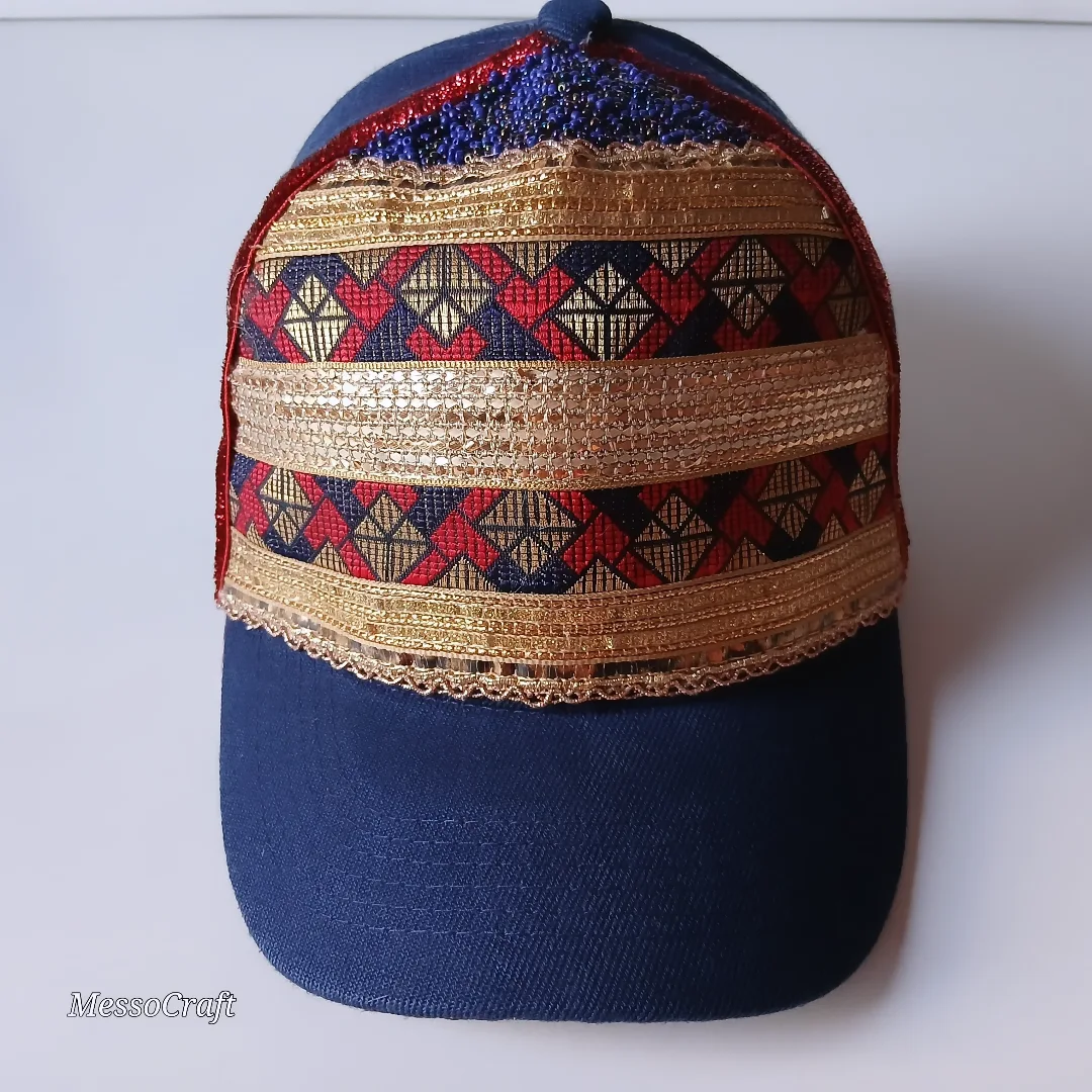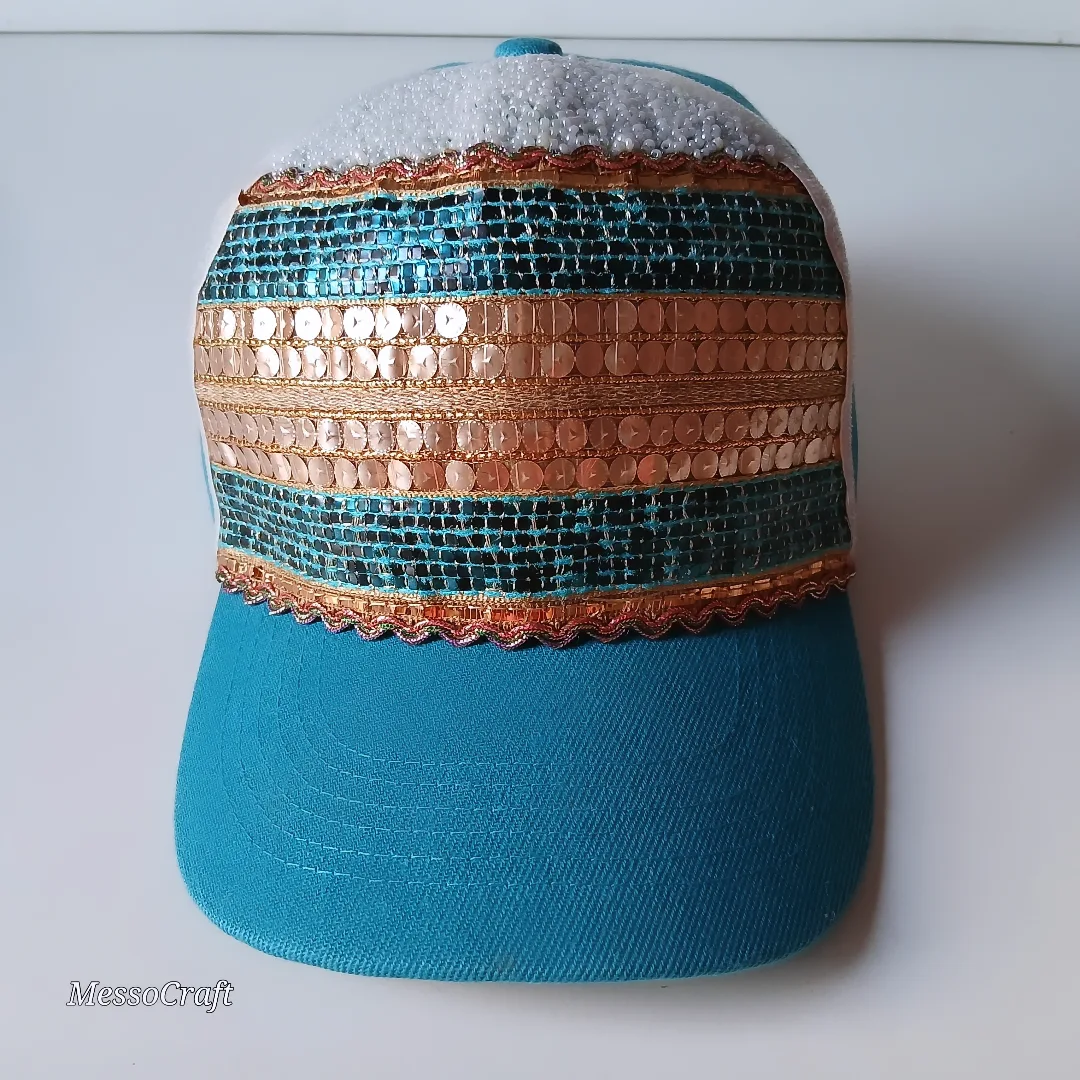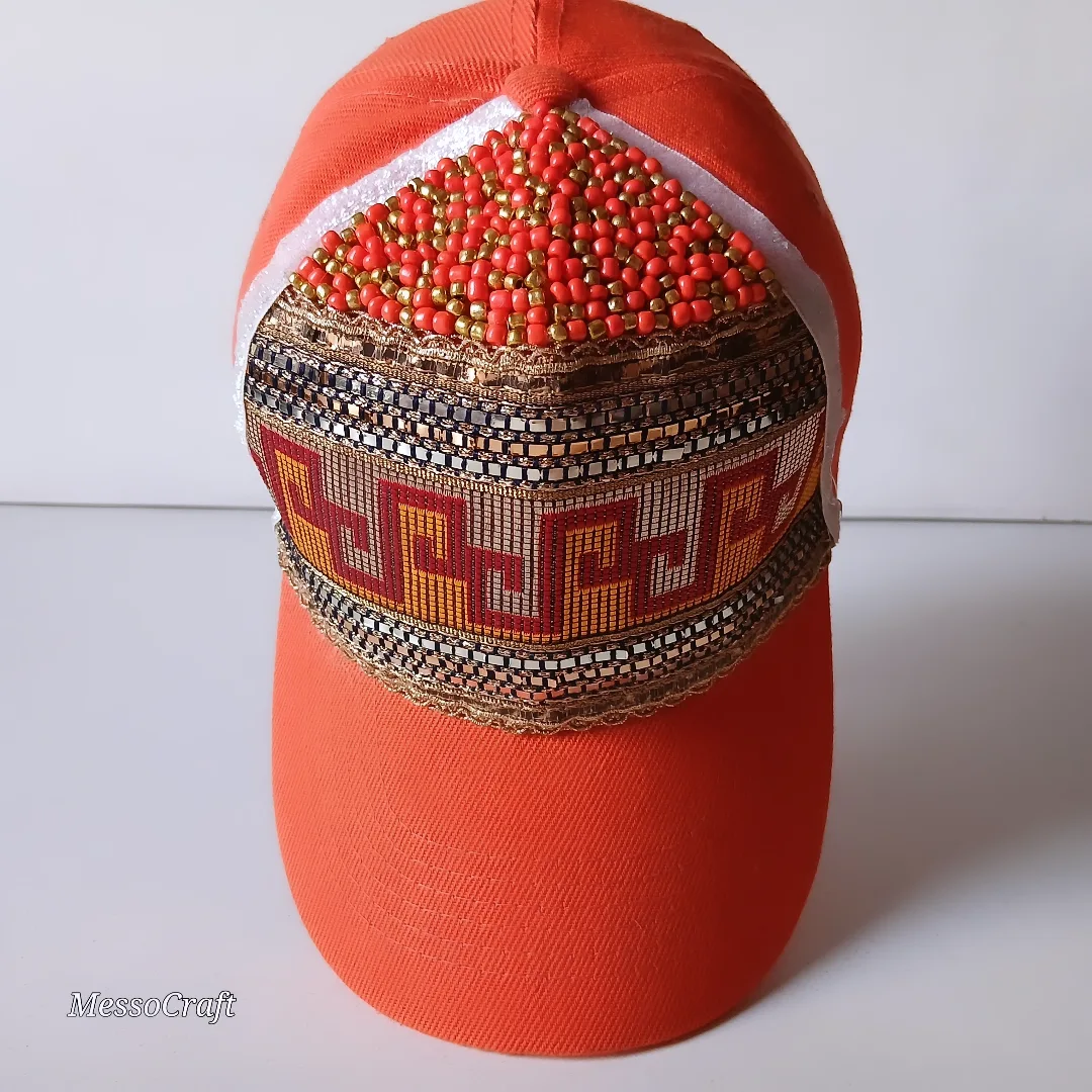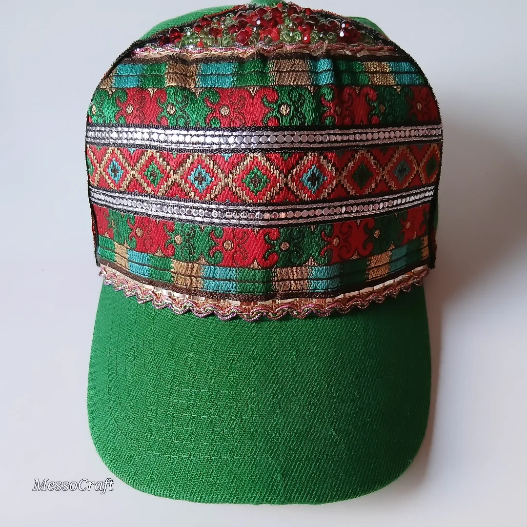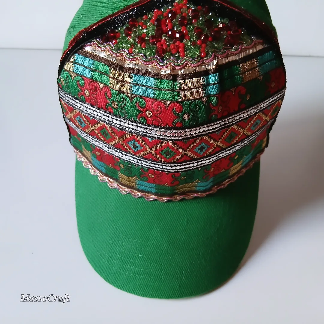cap is a canvas of creativity — detailed with hand-sewn Indian galon trims and beads that add texture and depth.