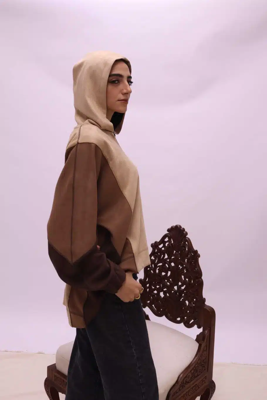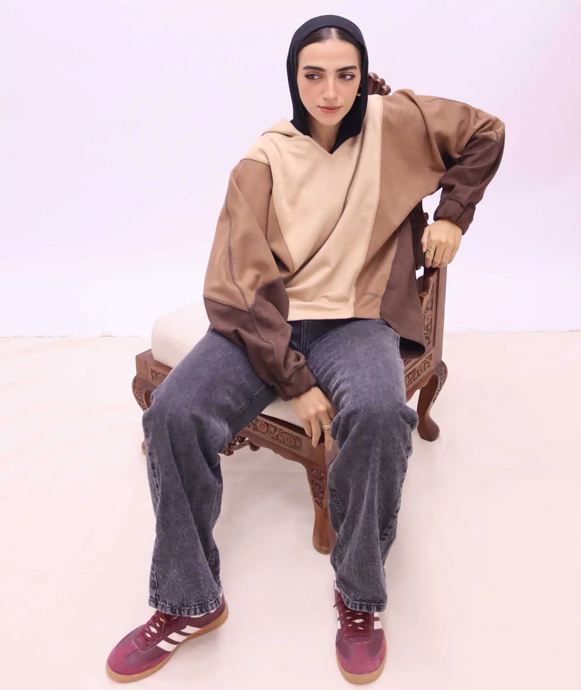 Faux Suede hoodie sweatshirt with elesticated cuffs and flattery curved high-low hem