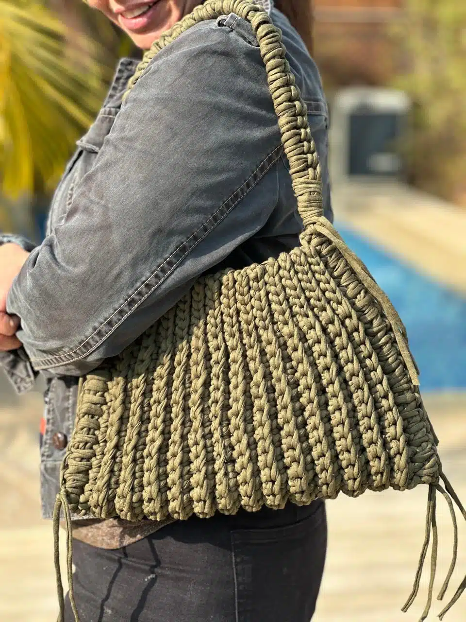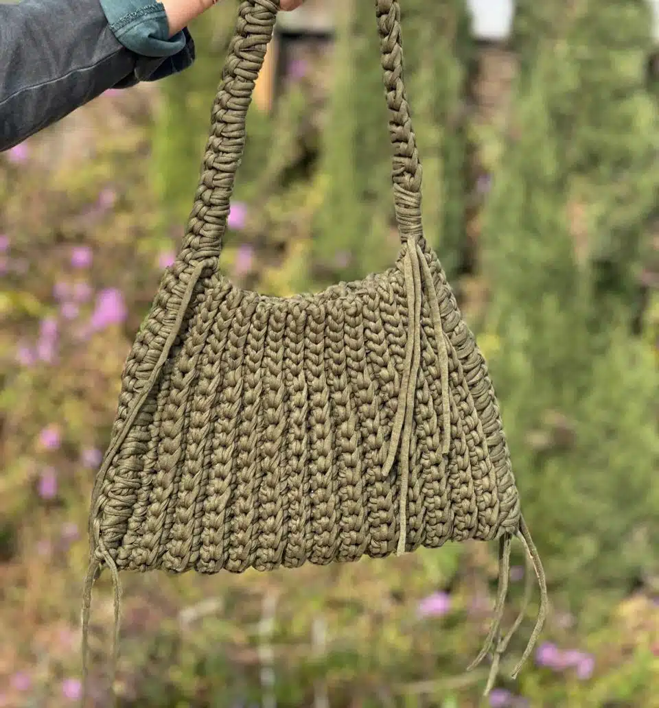 A casual olive hand bag made of t shirt yarn .size 44×22 cm