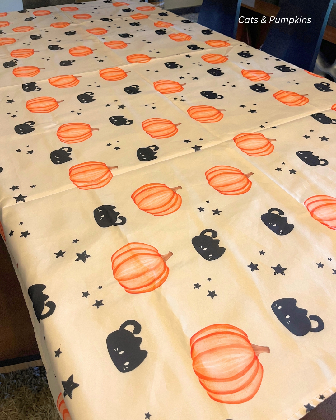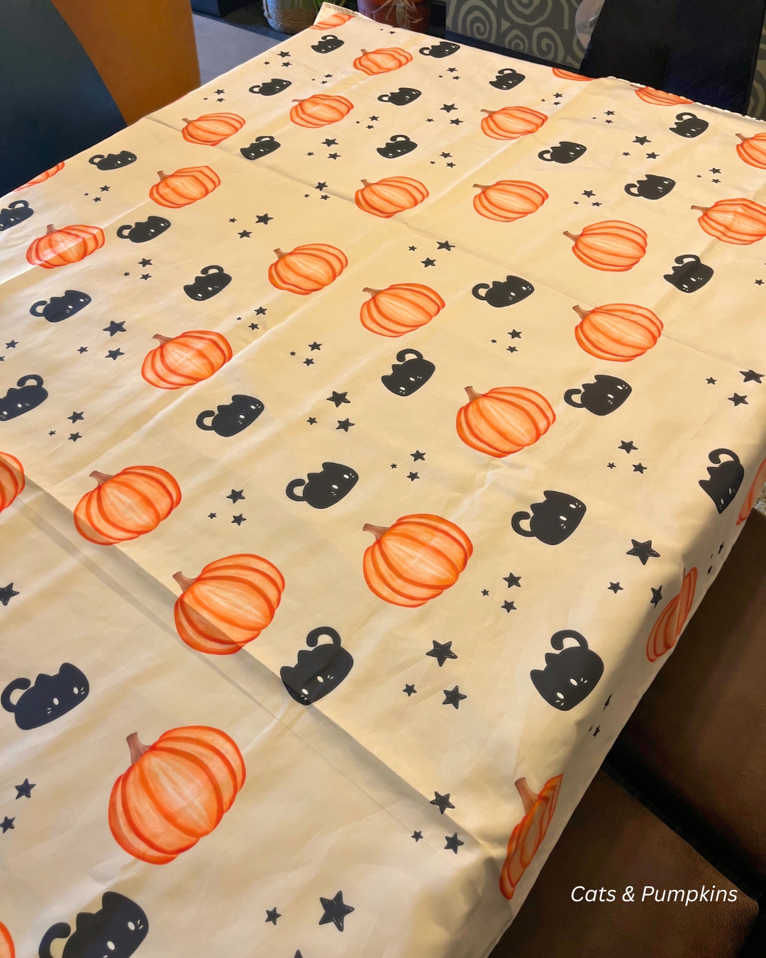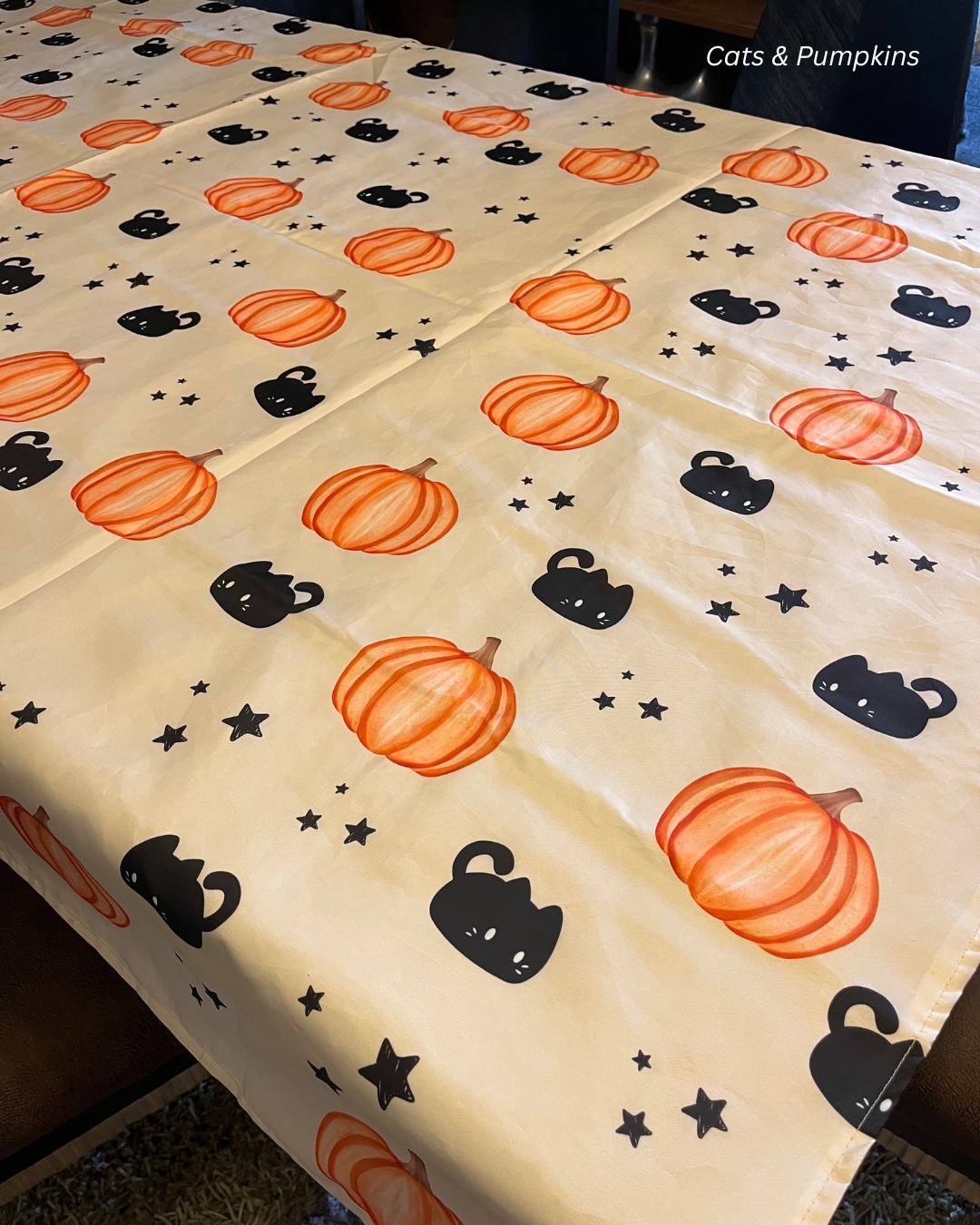 Halloween Tablecover in waterproof material size 140×250 cm for 6-8 seater table, with cotton back tailored lining. ( Cats & Pumpkins Pattern)