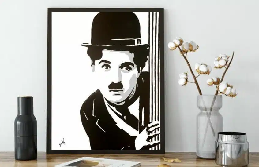 This is an acrylic painting of the actor Charly Chaplin on canvas. It is based on only three colors; black, grey and white.