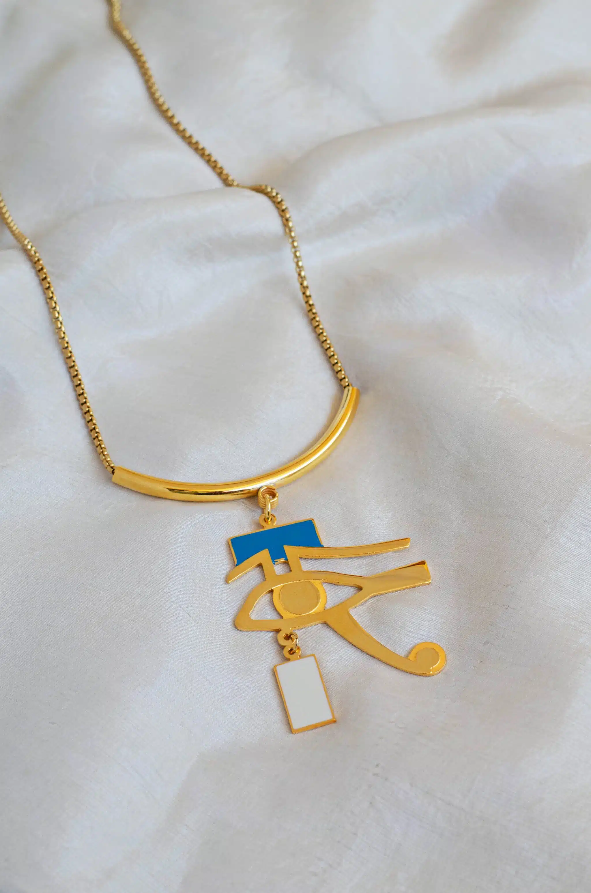 The Charming Necklace, Inspired by The Eye of Horus ancient Egyptian Symbol by the designer “Toka Nabil”. Material: Brass 21K Gold plated with a very high quality, hand made, Enamel colours. Pre order will Take from 3-15 Days. No REFUND or EXCHANGE.