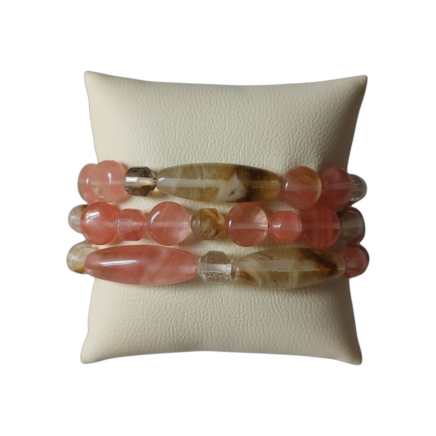 A set of 3 bracelets made of cherry quartz beads stones in different shapes