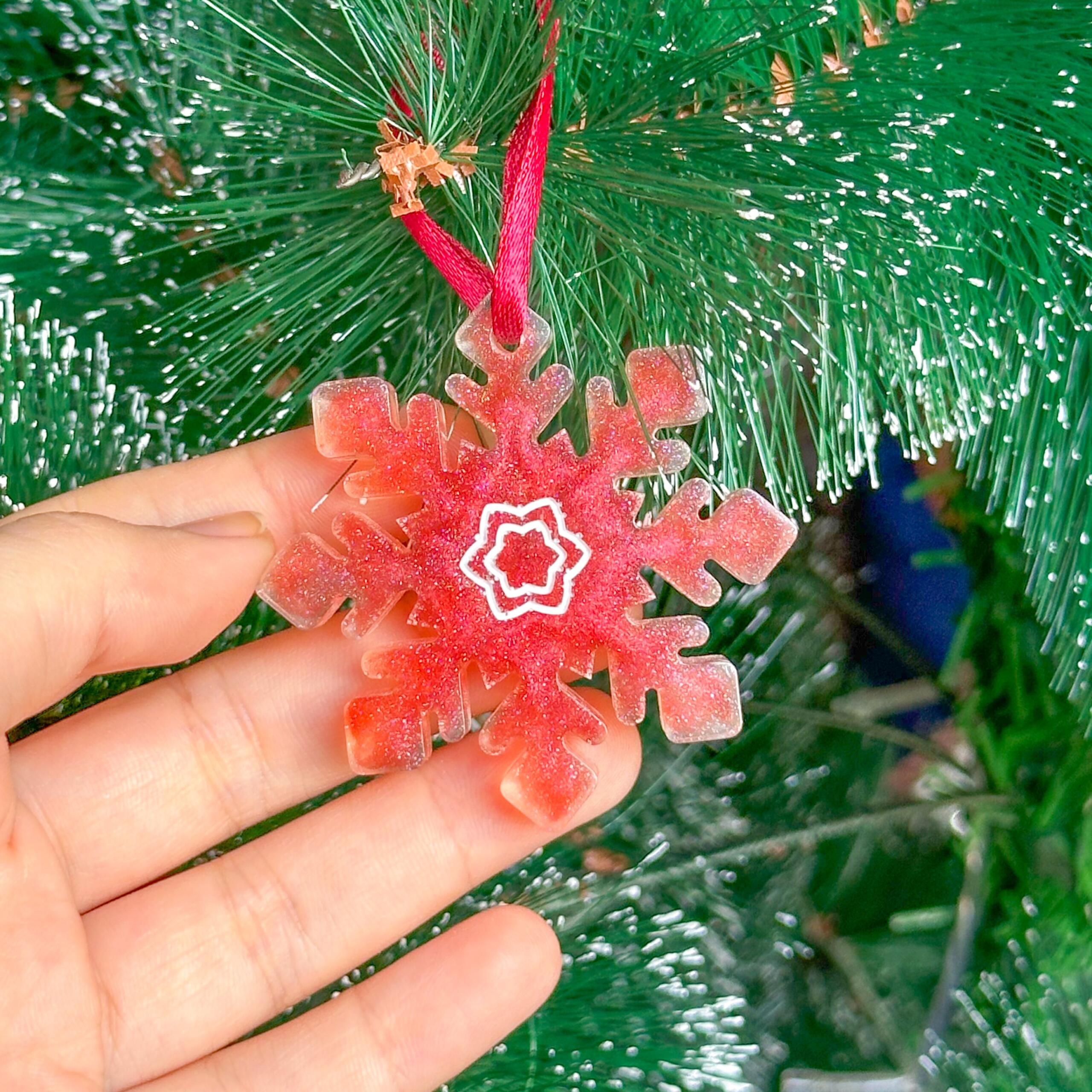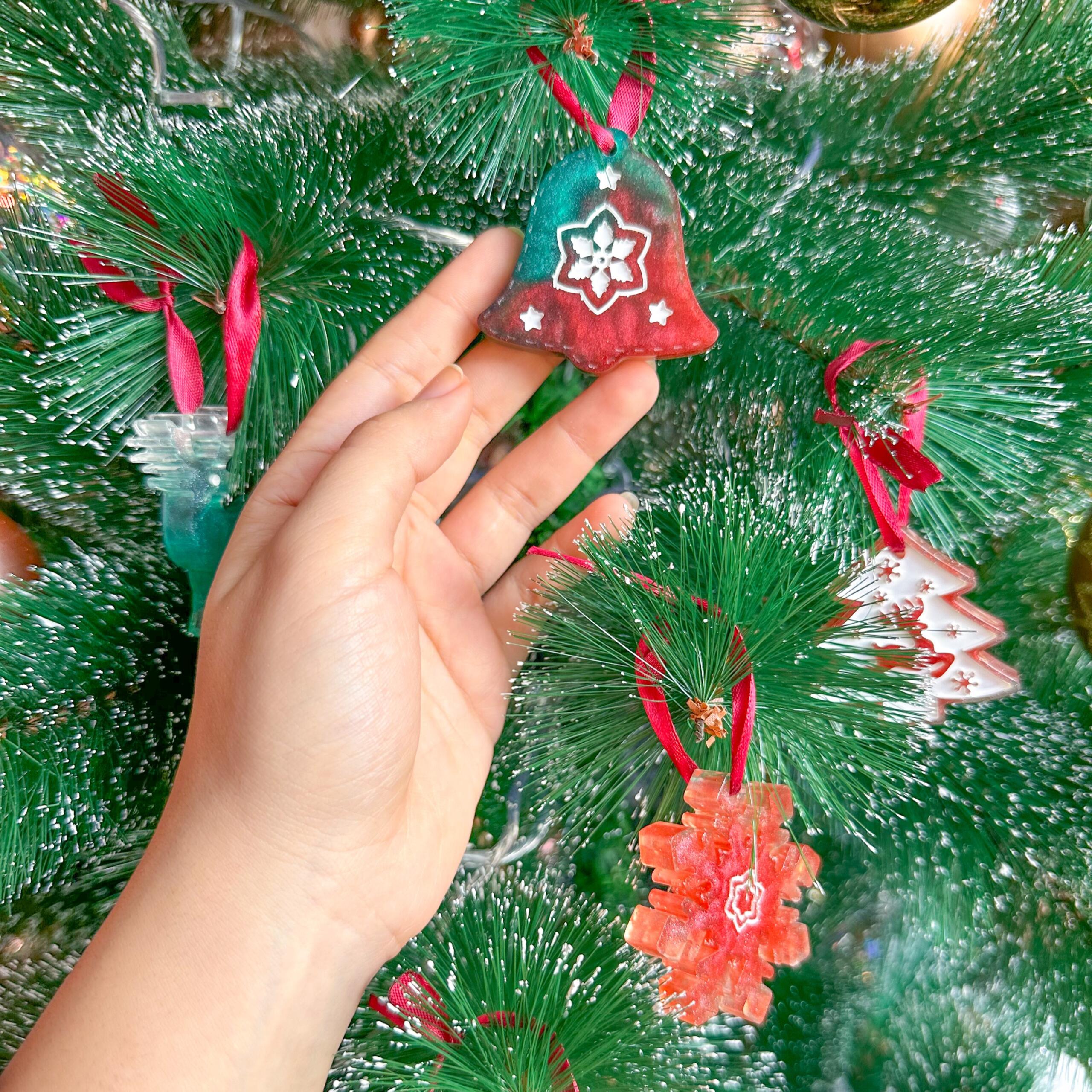 This limited-edition red & green resin ornament set features 5 enchanting shapes — from dancing reindeer to shimmering snowflakes — each one handcrafted with love and holiday sparkle.