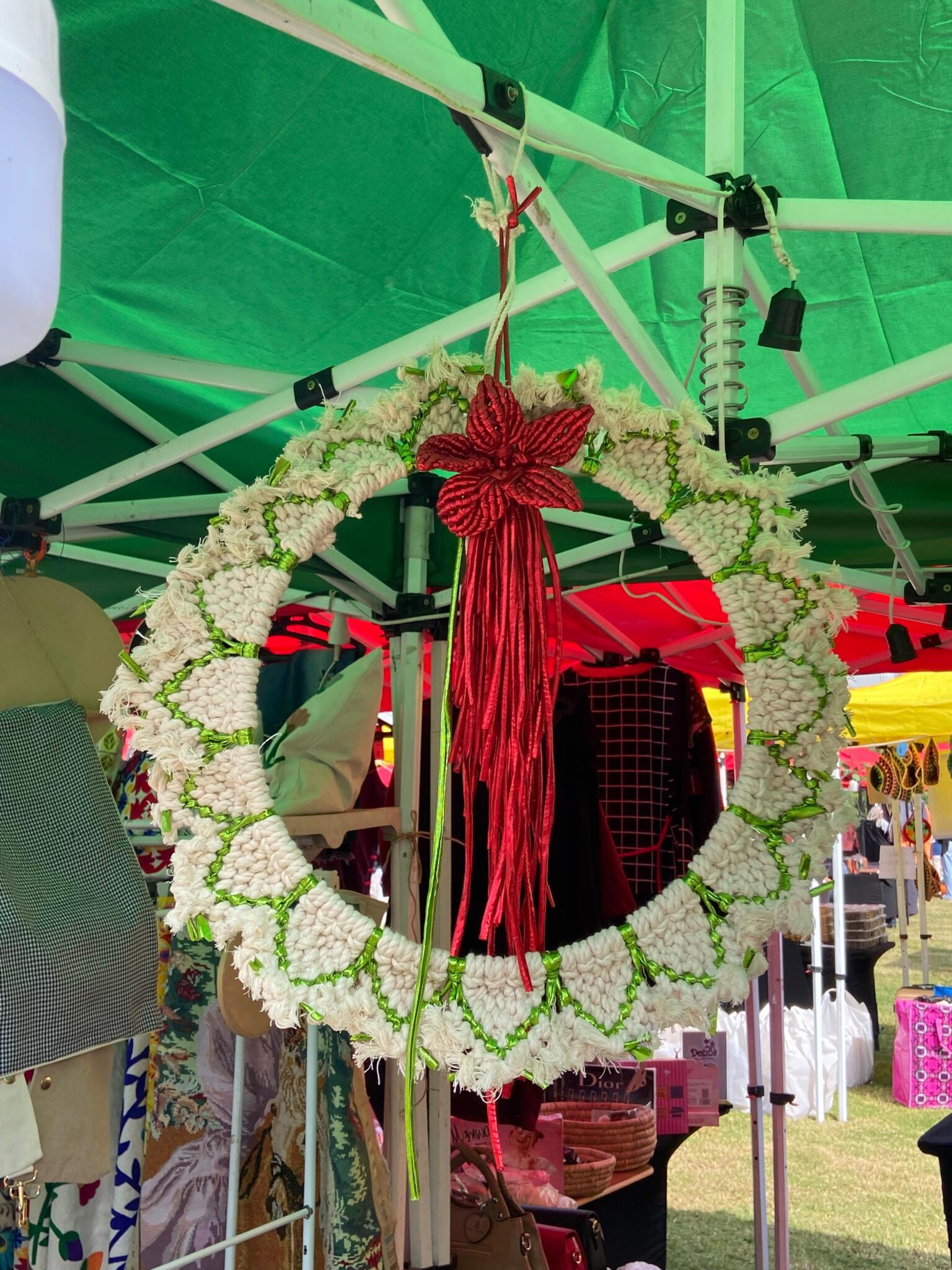 Materials: Off white , red and green metallic macrame rope.