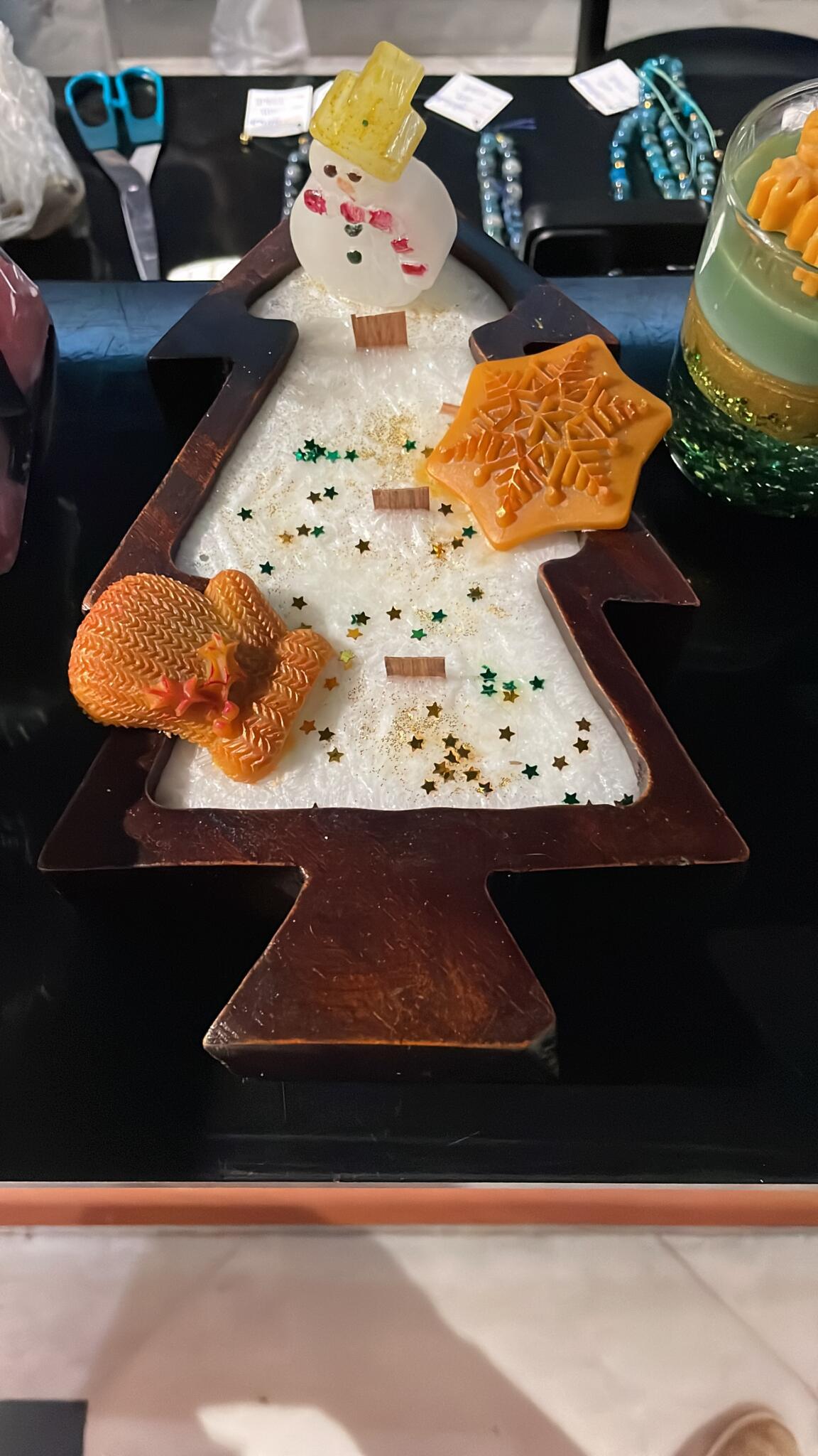 A Christmas tree wood plate with scented candle, size 25 *15 cm