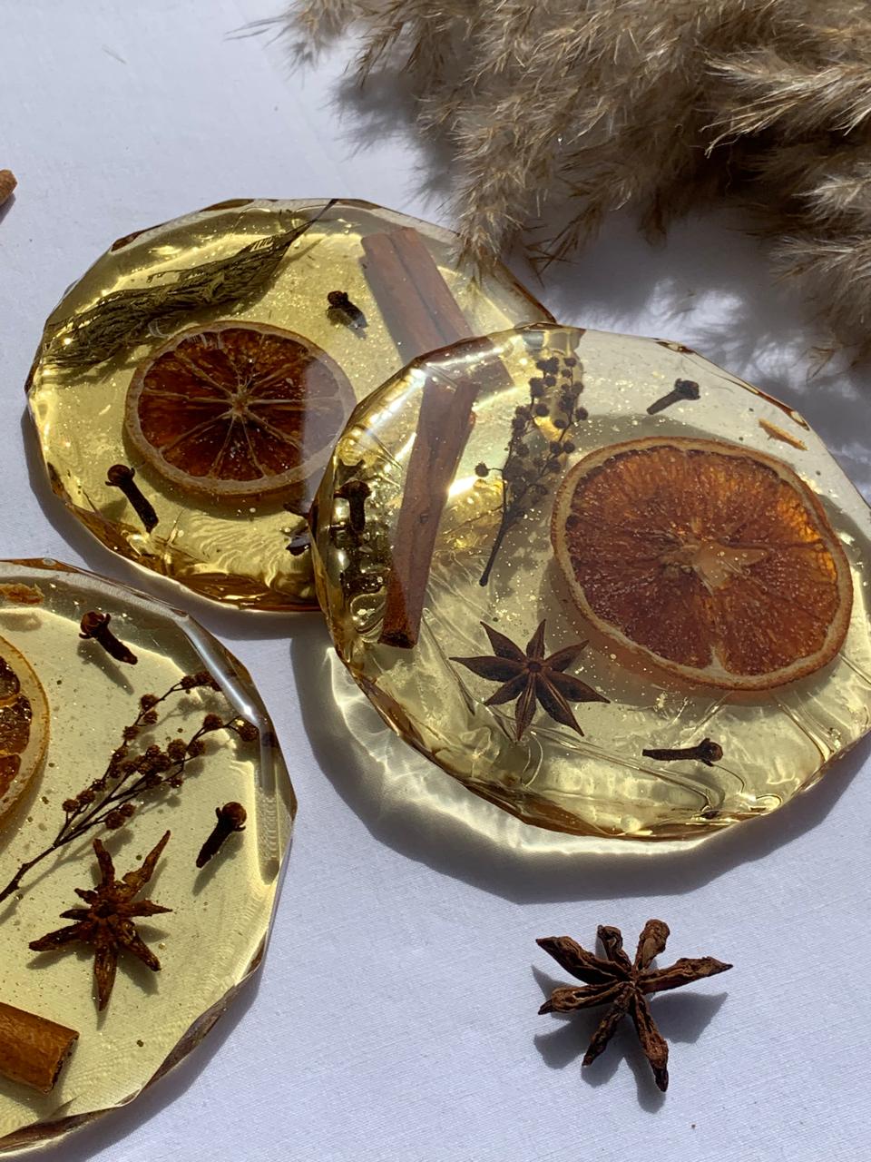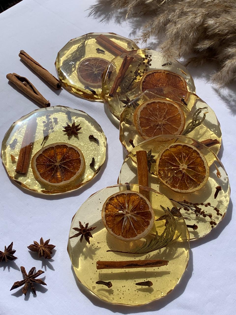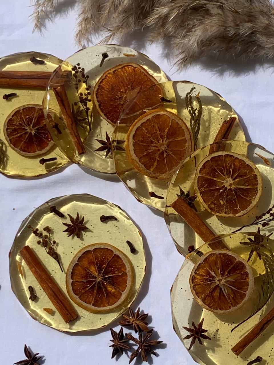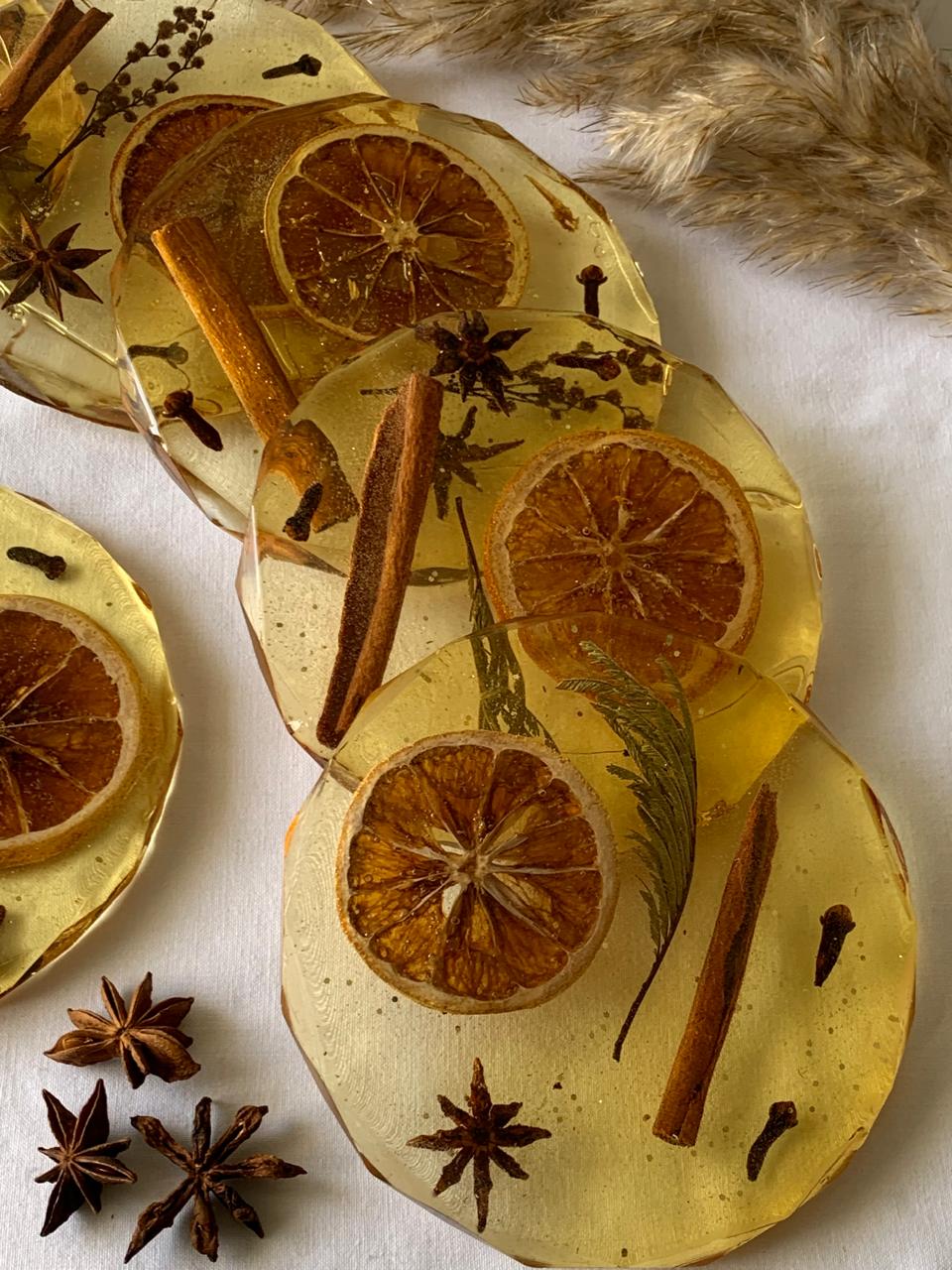 Handcrafted resin coasters made with real dried oranges, cinnamon sticks, and cloves.