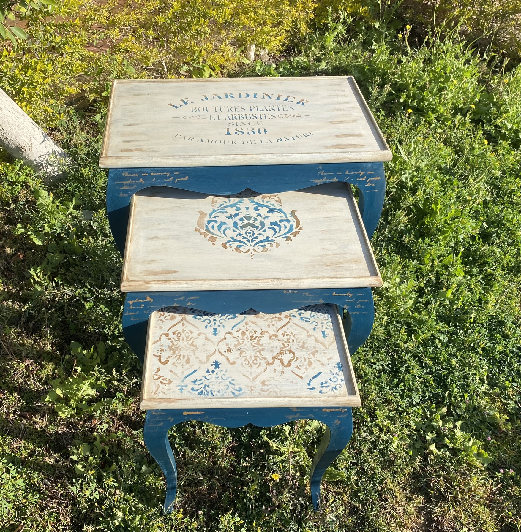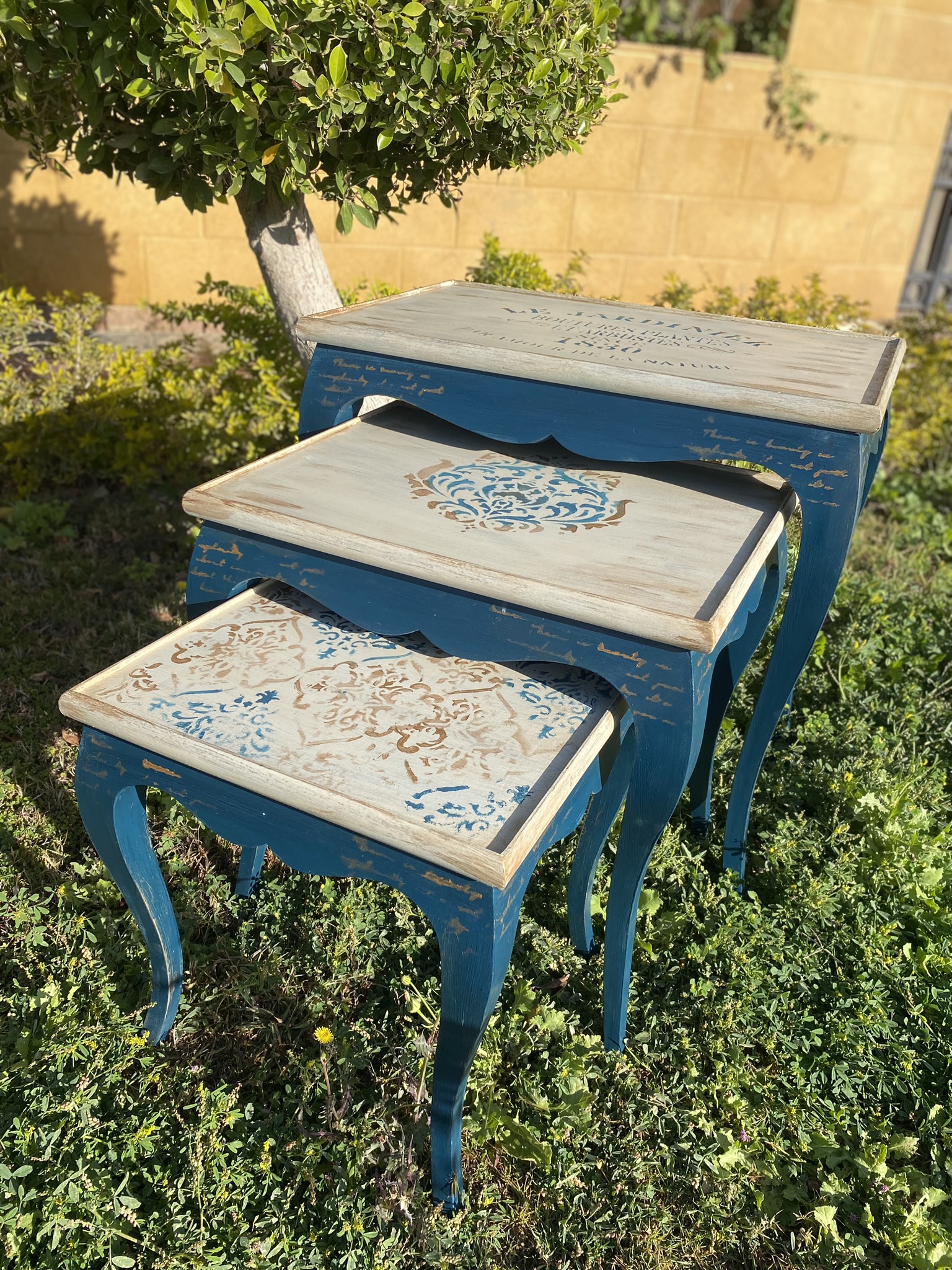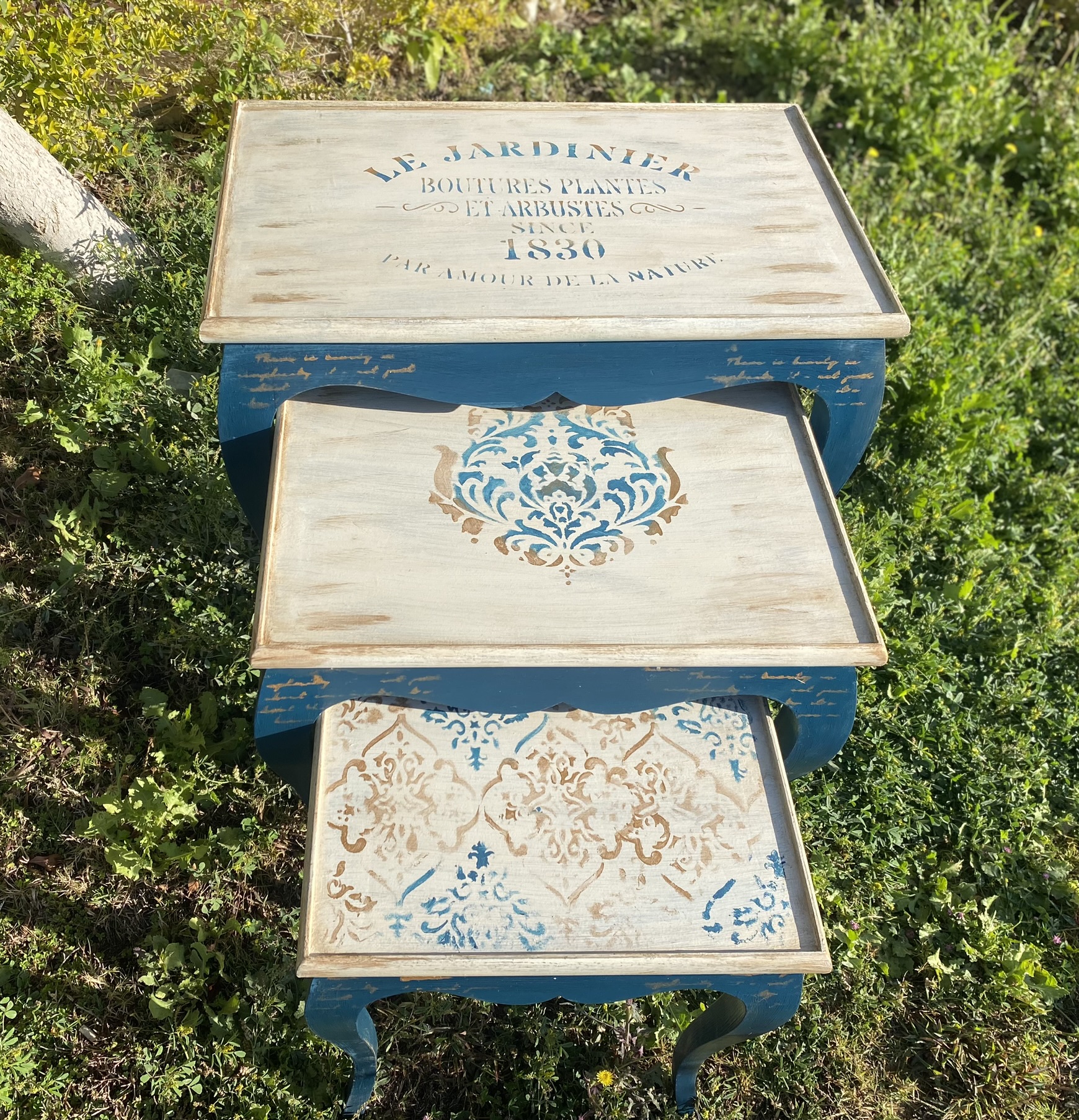 Handmade classic set of tables in navy blue x beige colors with touches of gold