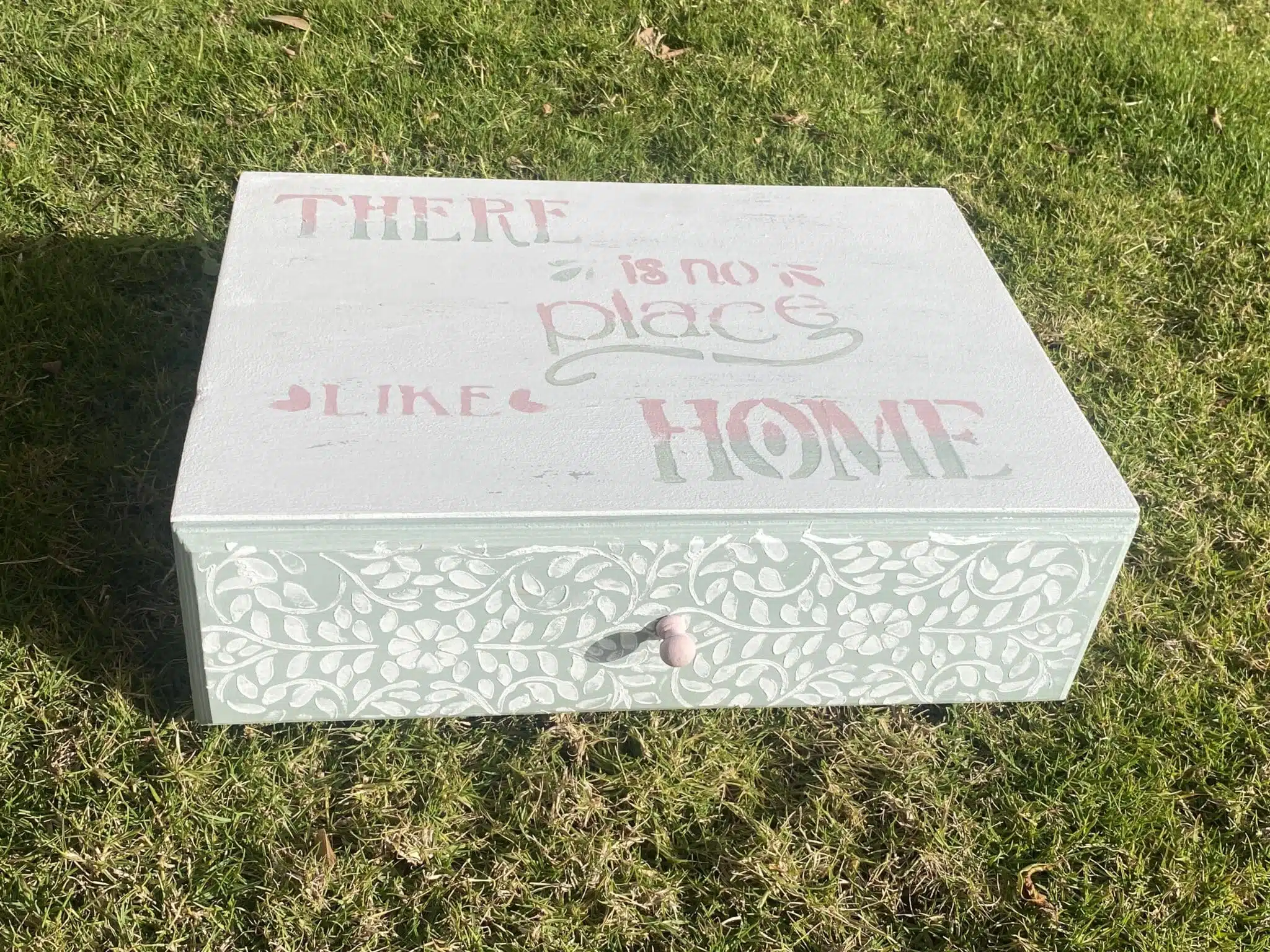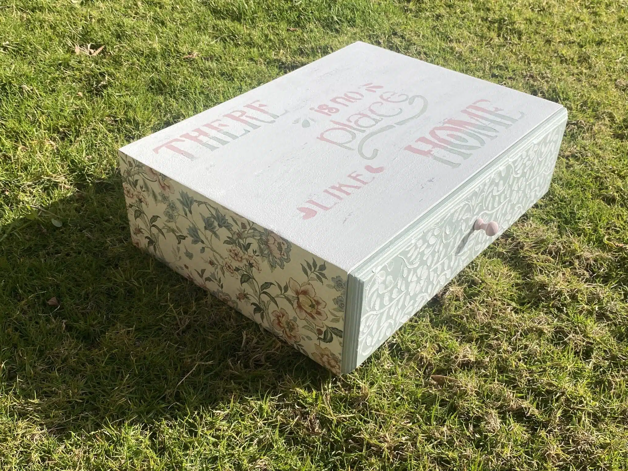 Wooden coffee box with divided drawer in white x mint fleuri design