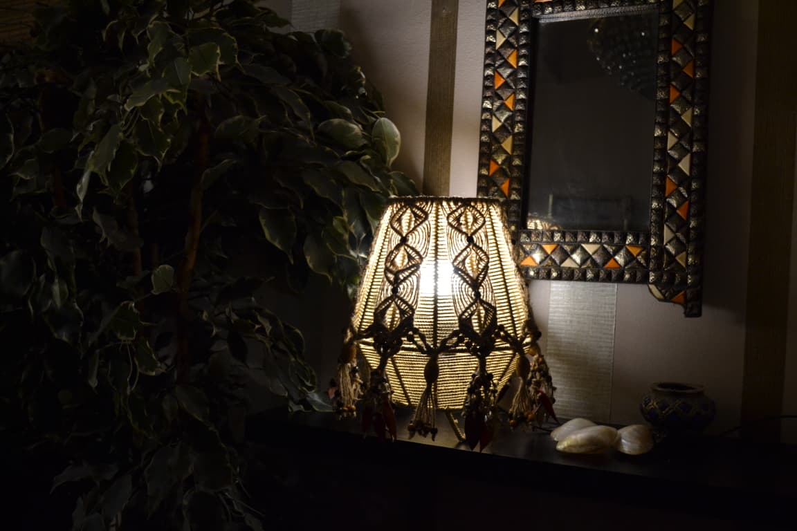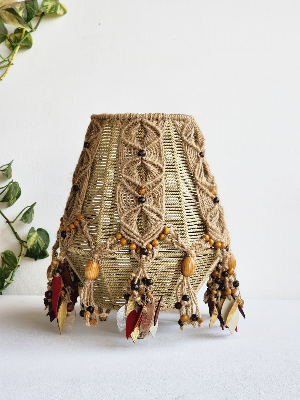 Materials: metallic coffee jute rope , leather leaves shaped  and wooden beads.