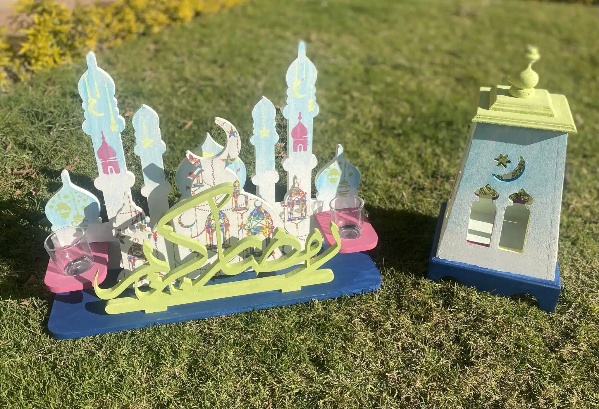 Wooden decorative stand for Ramadan in vibrant colors and candle holders cups