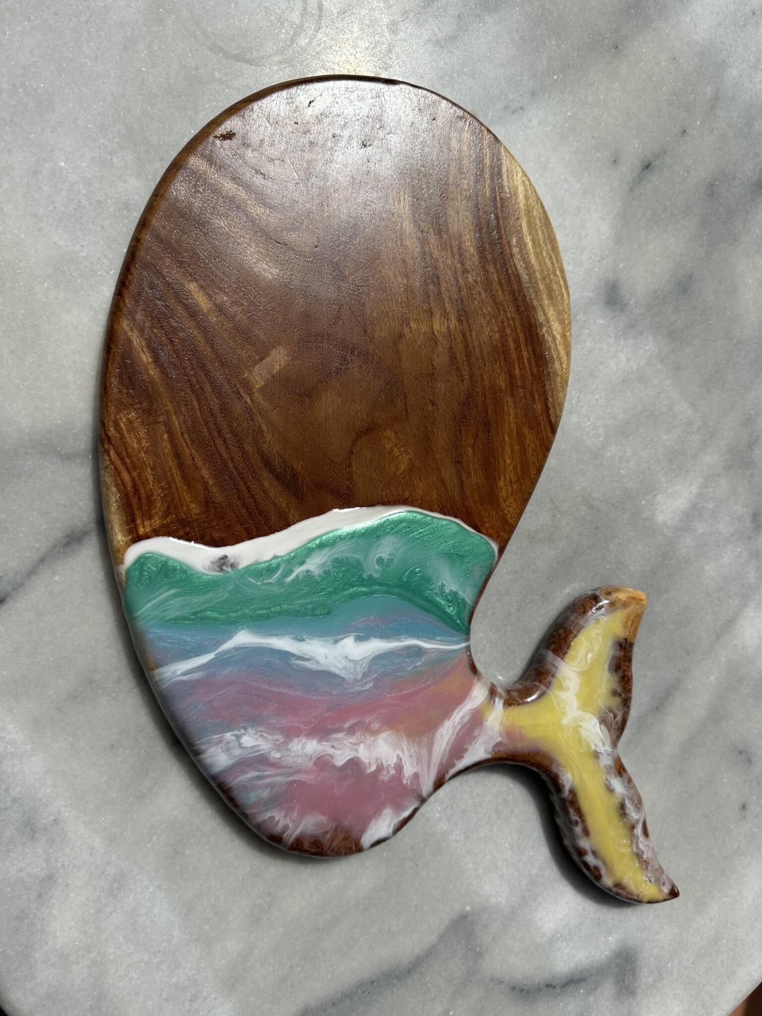 This is a rosewood (خشب سرسوع) charcuterie board with modern colorful waves resin design on one side. The board is food safe and can be used as a cutting board on the other side. Care instructions will be included.