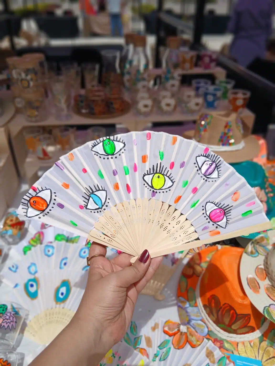 Hand painted colors eyes on hand fan Material wood and fabric Nun refundable