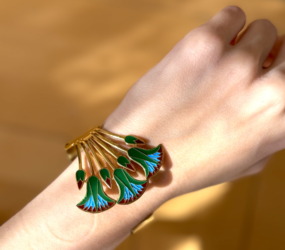 he Coloured Bouquet Cuff is a gold-plated statement piece blooming with fan-shaped enamel petals in rich green, turquoise, and deep red, elegantly wrapping the wrist like a vibrant floral arrangement.